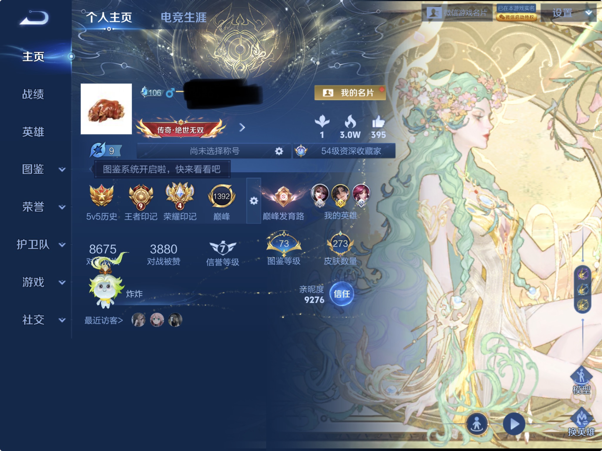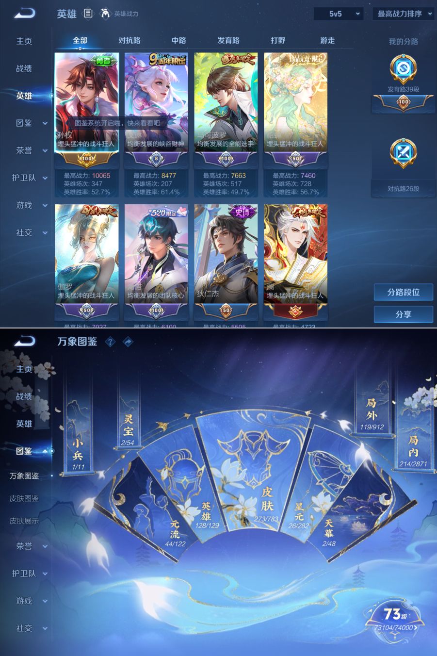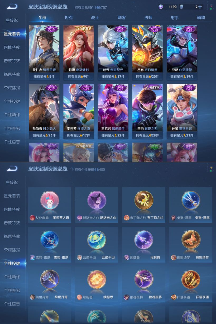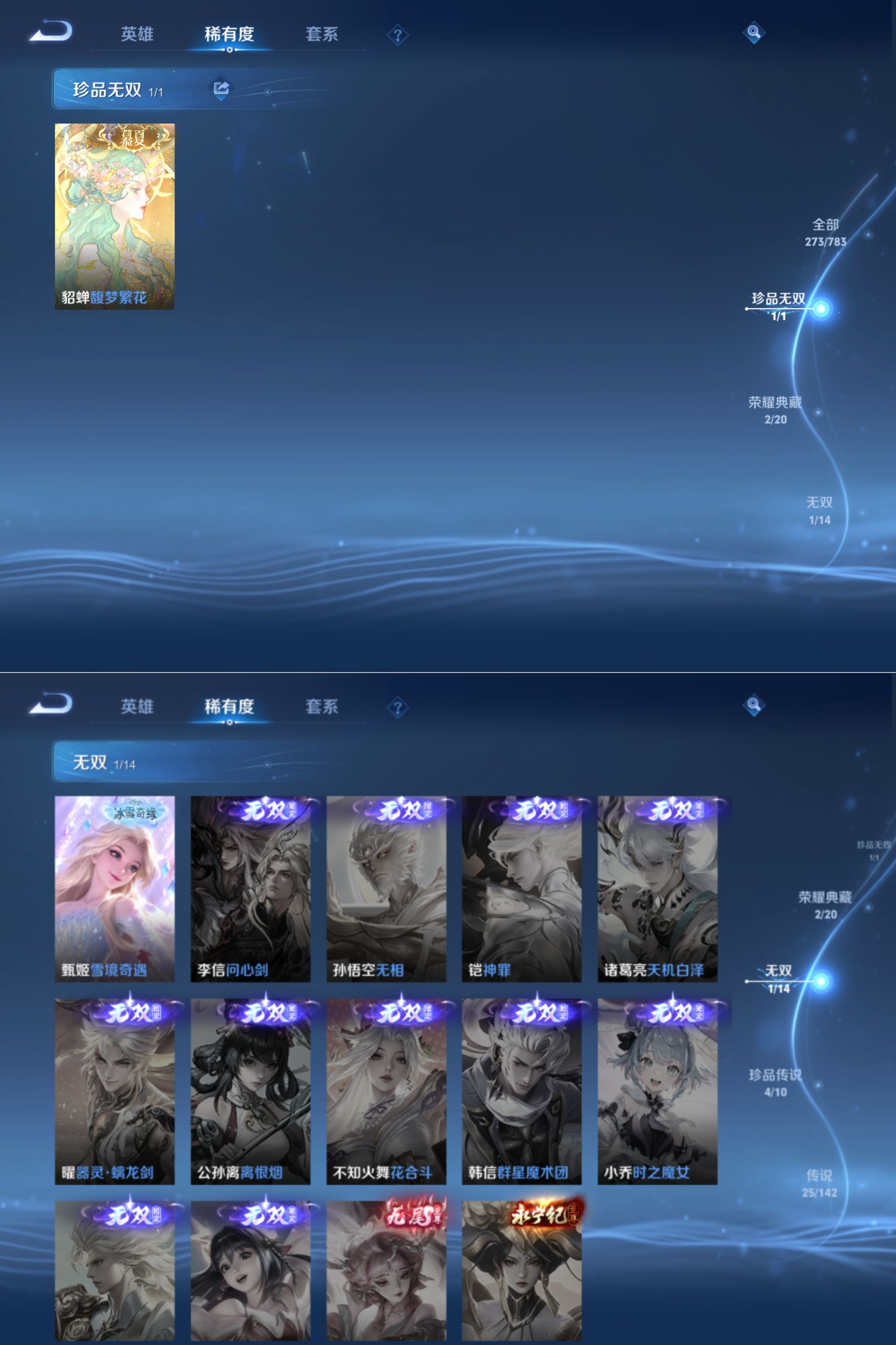 贵族等级:v9皮肤数:273生肖限定13 传说品质25 情人节限定3 荣耀典藏2 珍品无双1 珍品传说4 无双1 英雄数:128