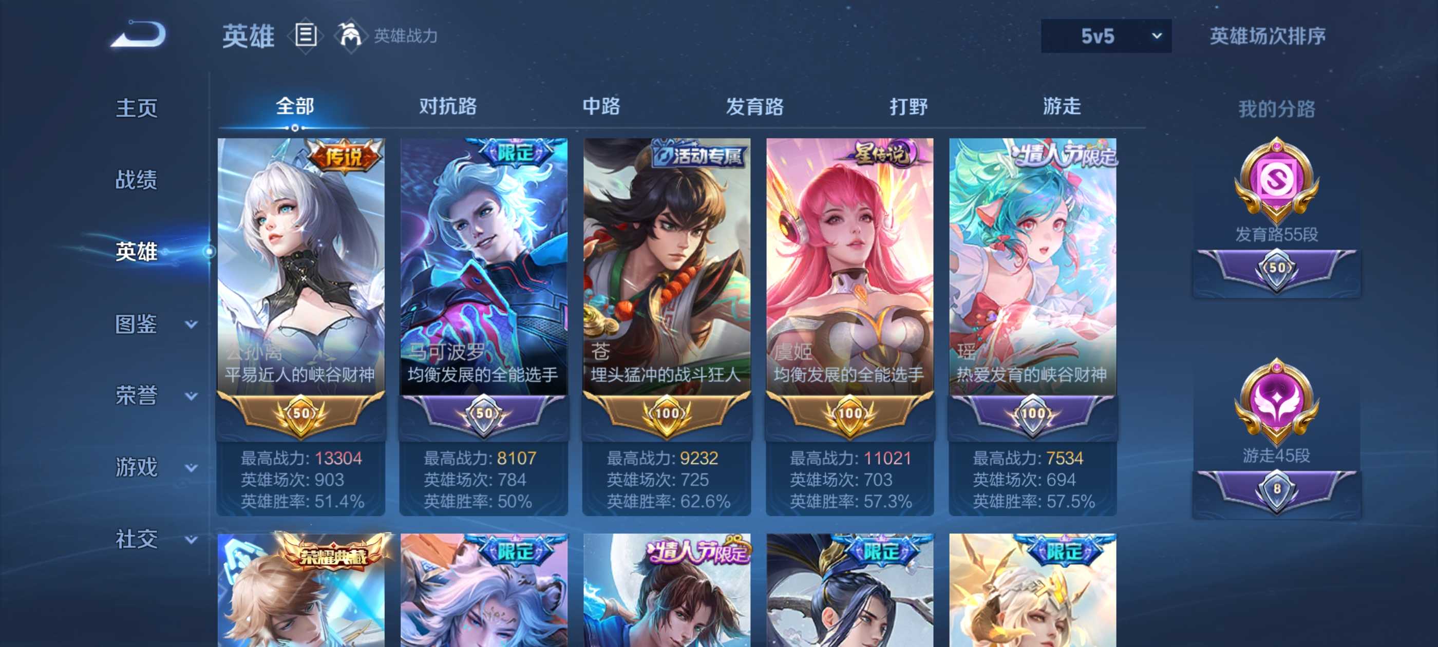 贵族等级:v10皮肤数:523传说品质58 生肖限定15 无双3 情人节限定11 荣耀典藏4 珍品传说3 珍品无双1 英雄数:129