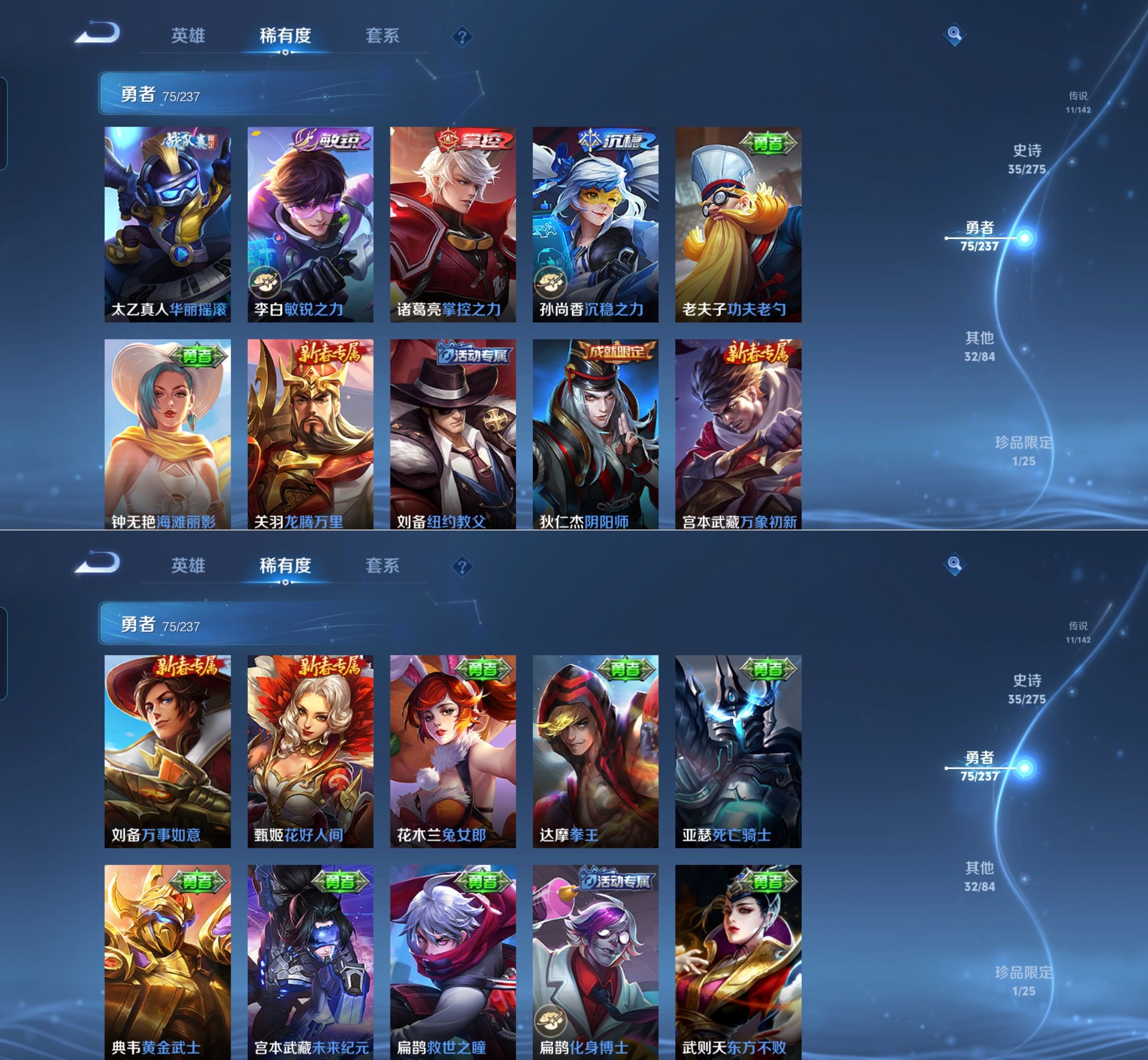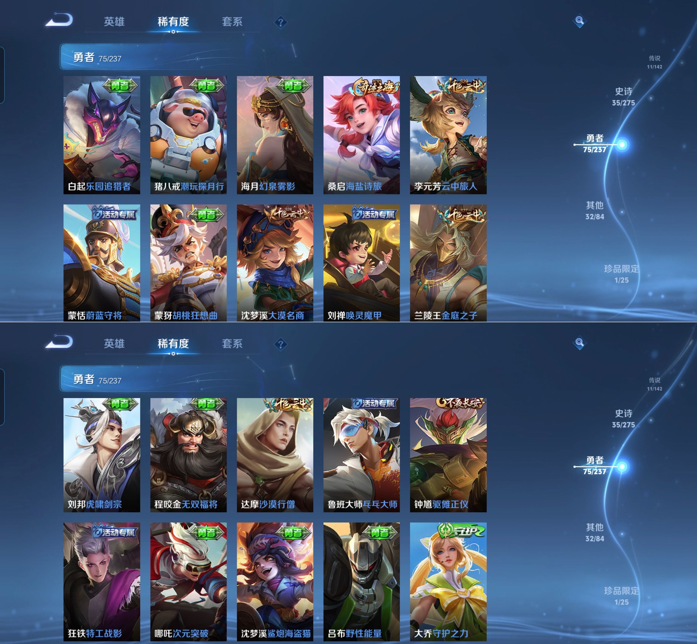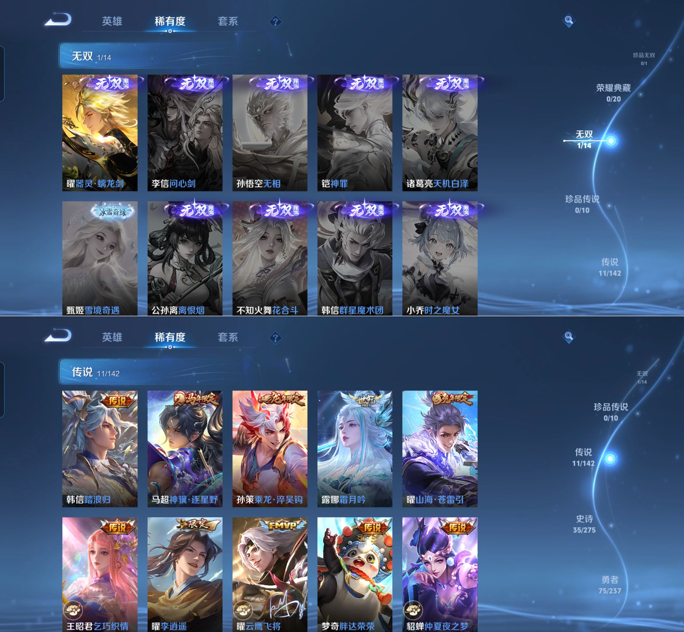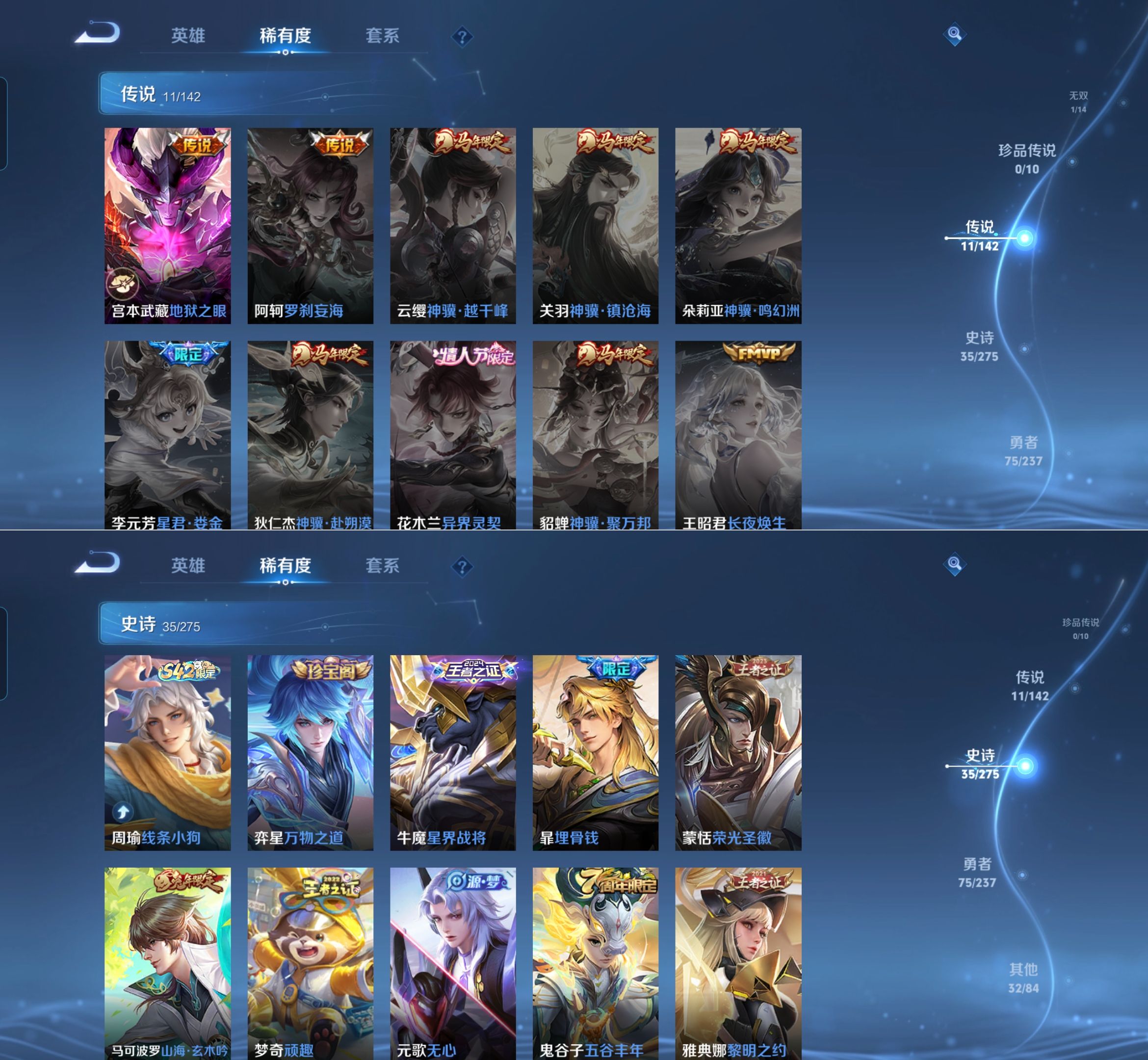 贵族等级:v7皮肤数:154传说品质11 生肖限定4 无双1 英雄数:127