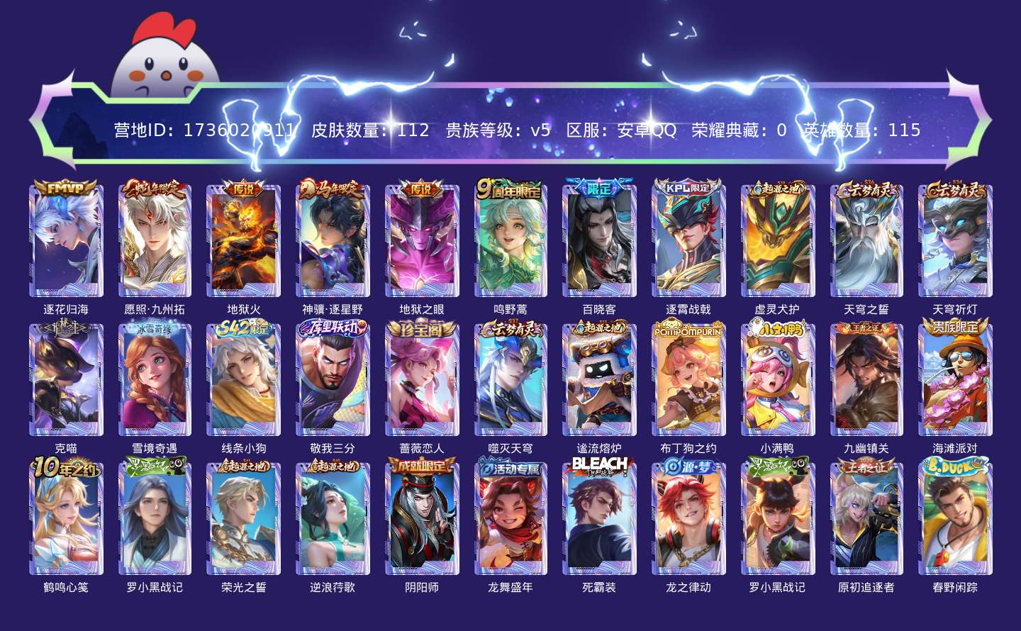 贵族等级:v5皮肤数:112传说品质6 生肖限定2 英雄数:115