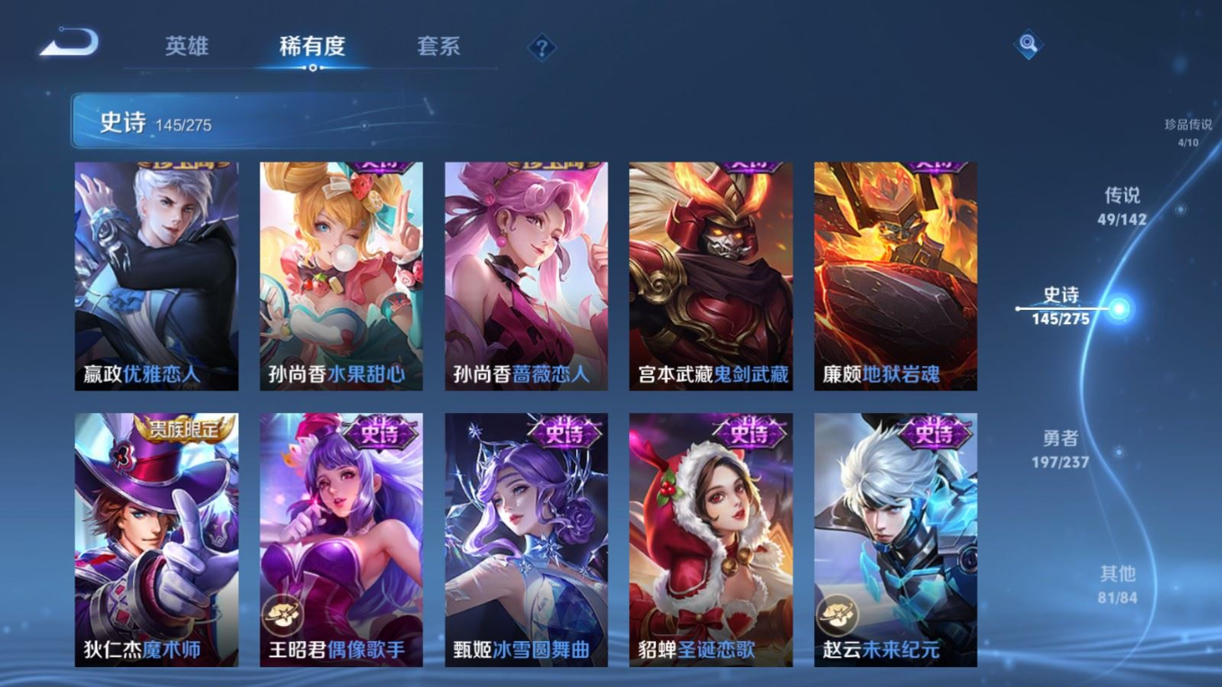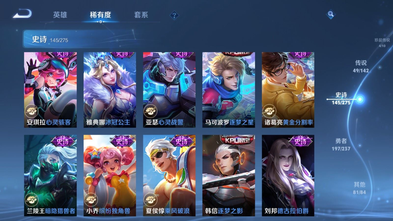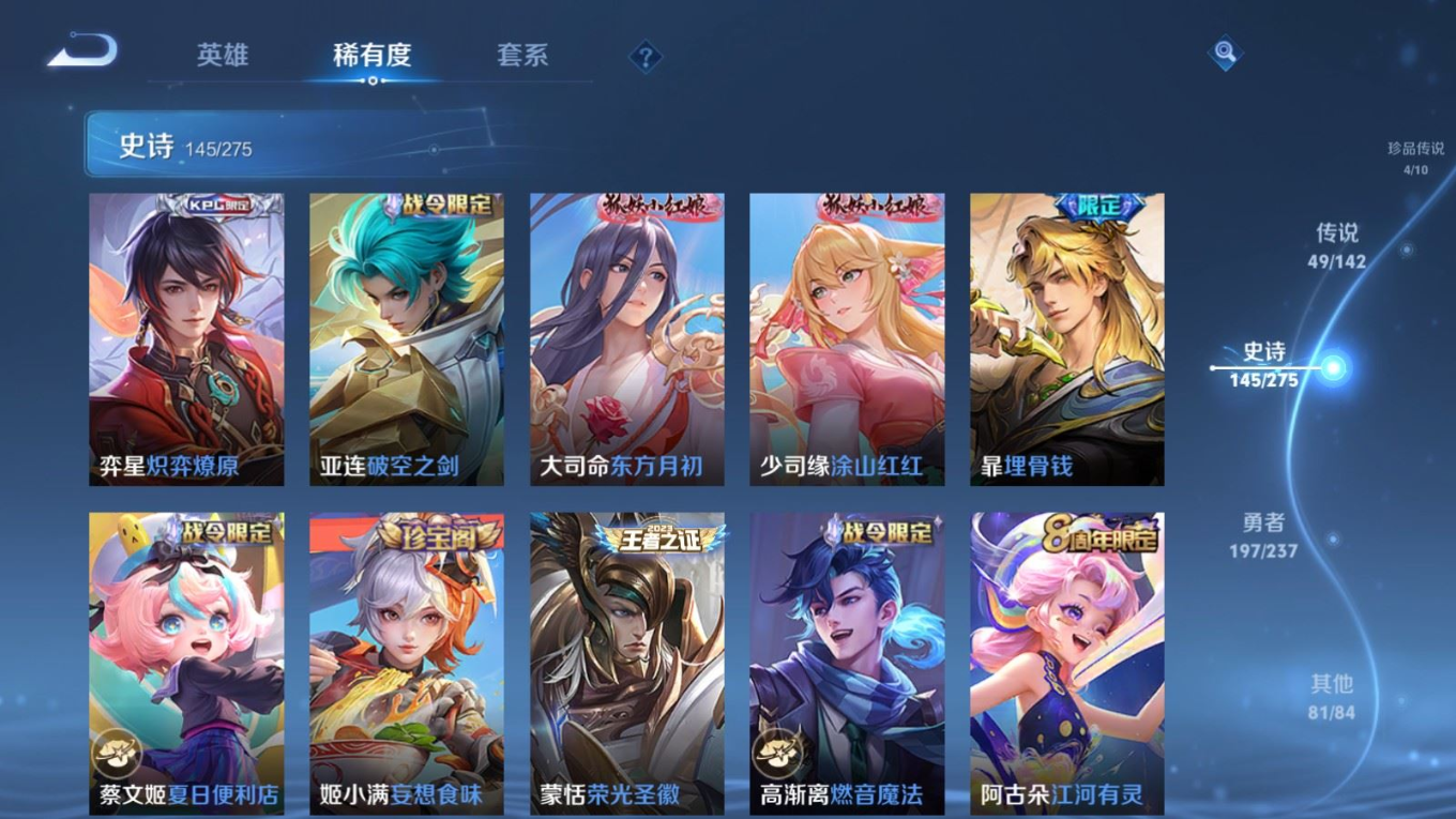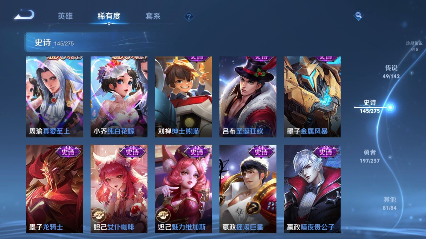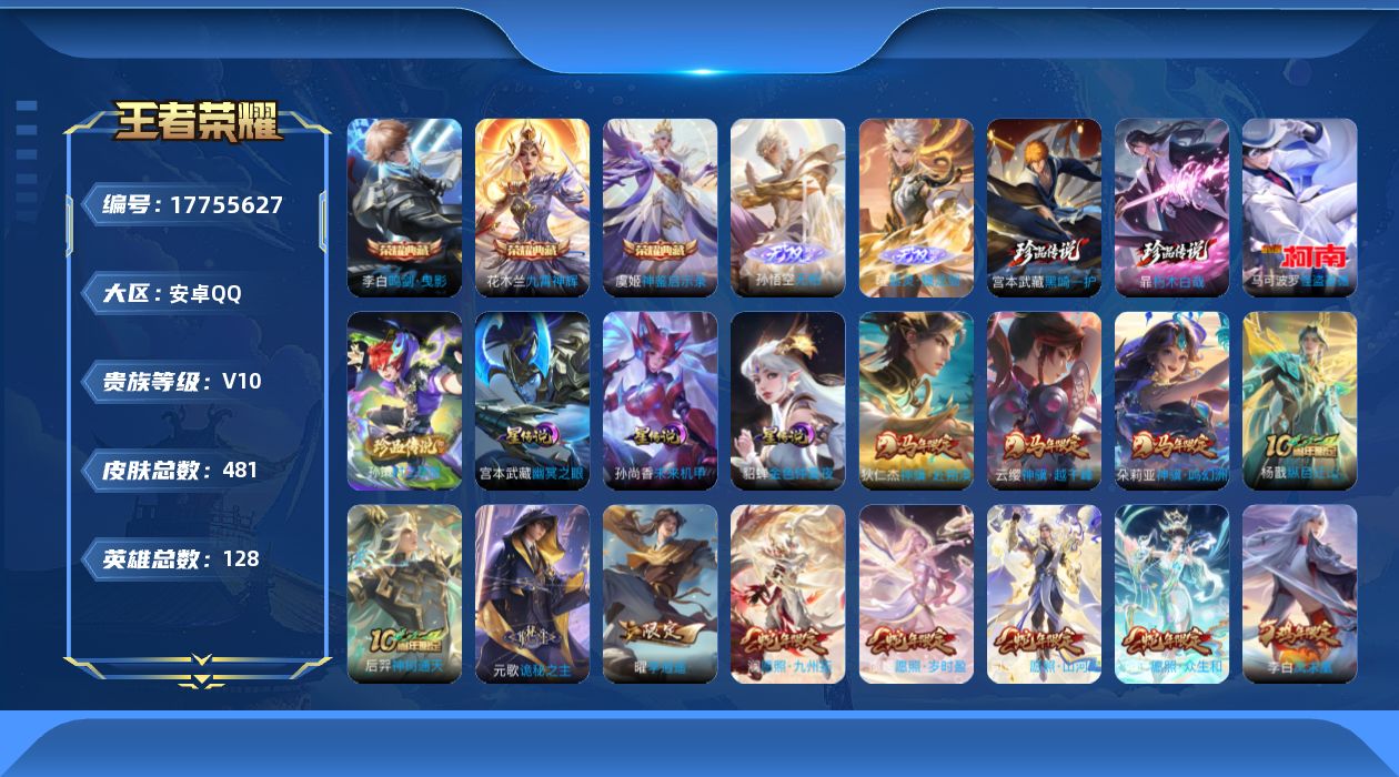 贵族等级:v10皮肤数:481传说品质49 生肖限定16 情人节限定7 无双2 珍品传说4 荣耀典藏3 英雄数:128