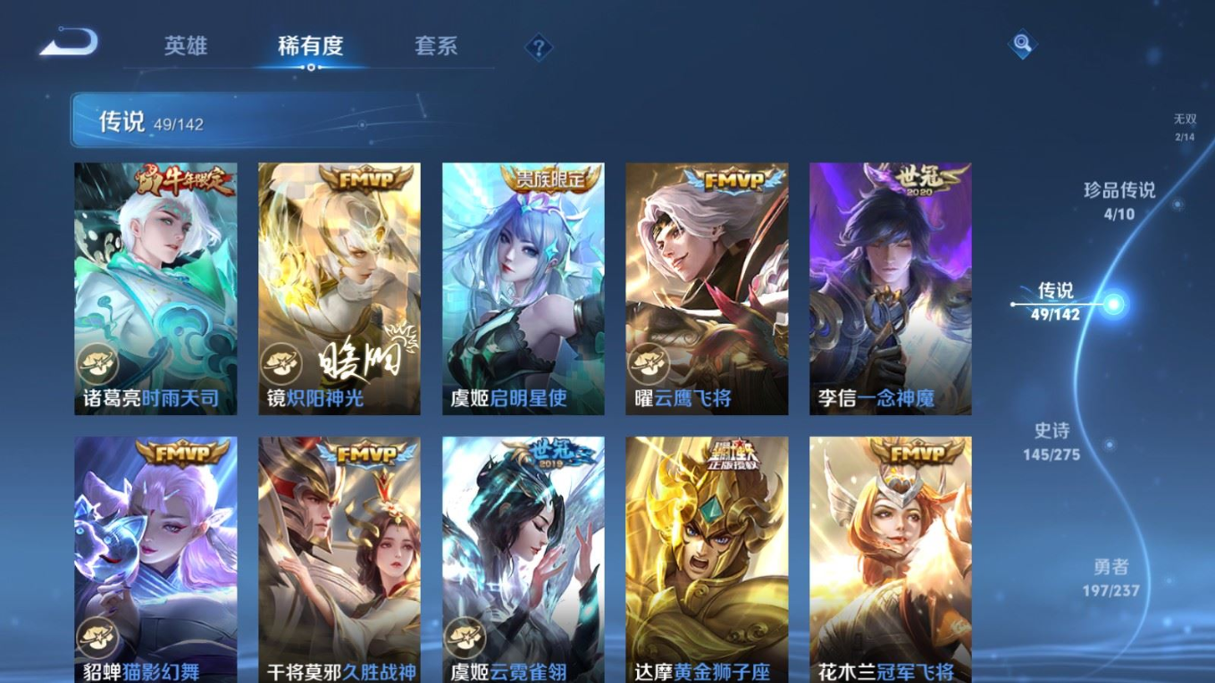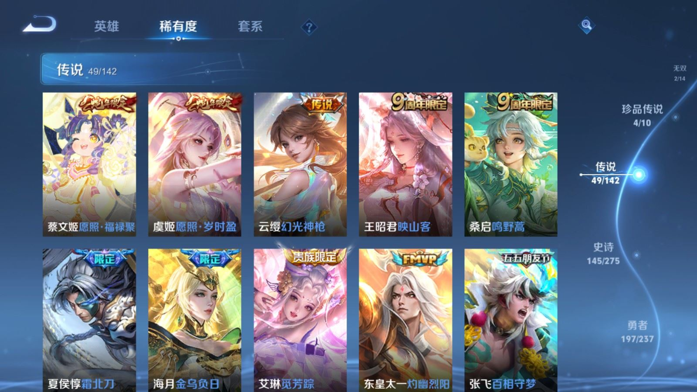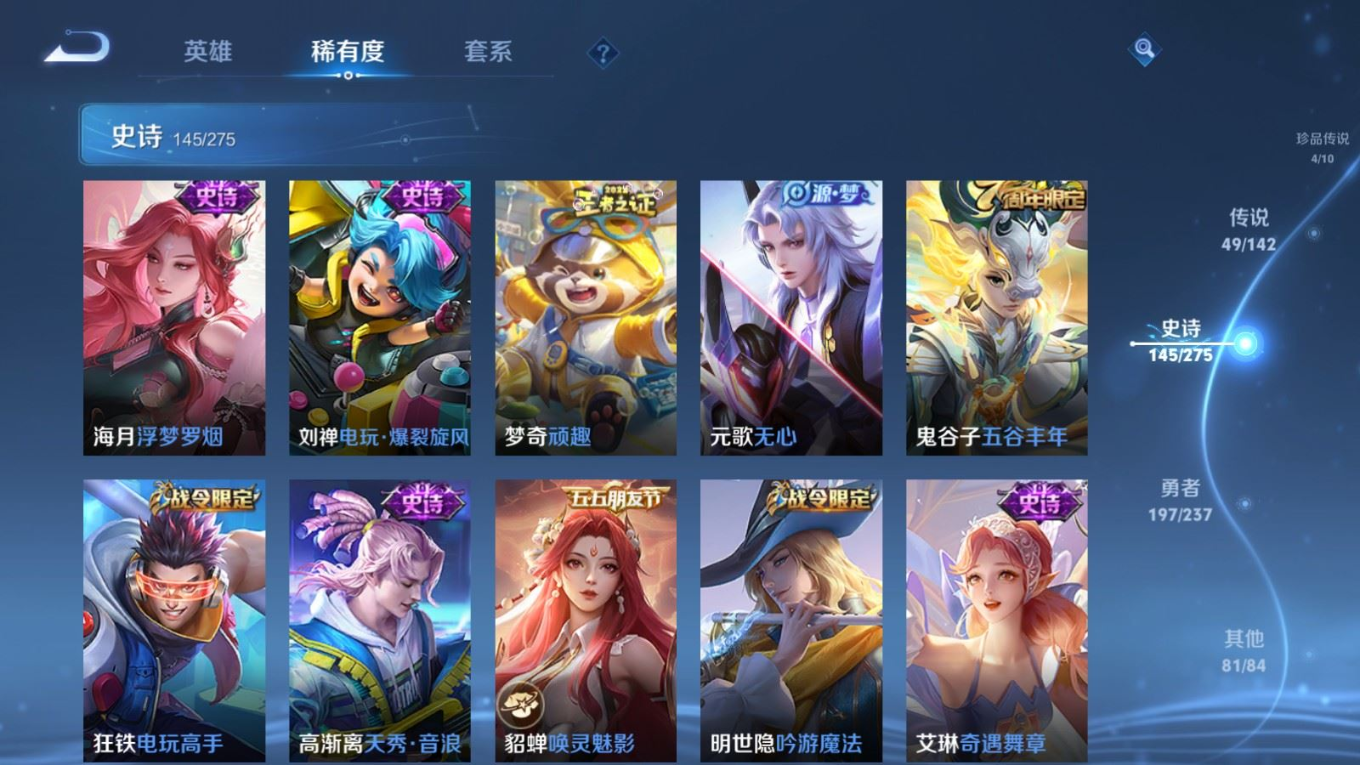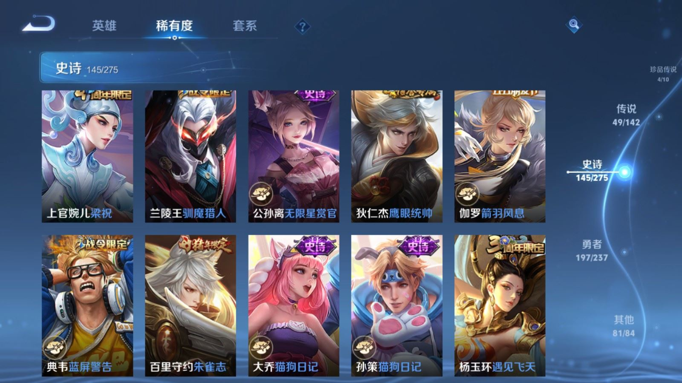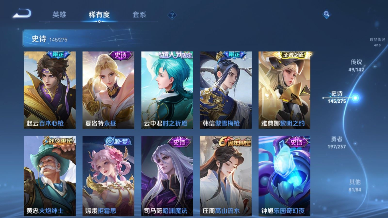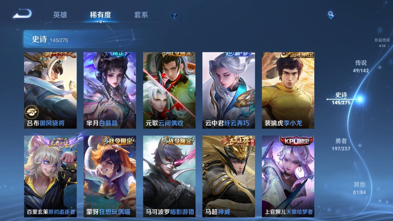贵族等级:v10皮肤数:481传说品质49 生肖限定16 情人节限定7 无双2 珍品传说4 荣耀典藏3 英雄数:128