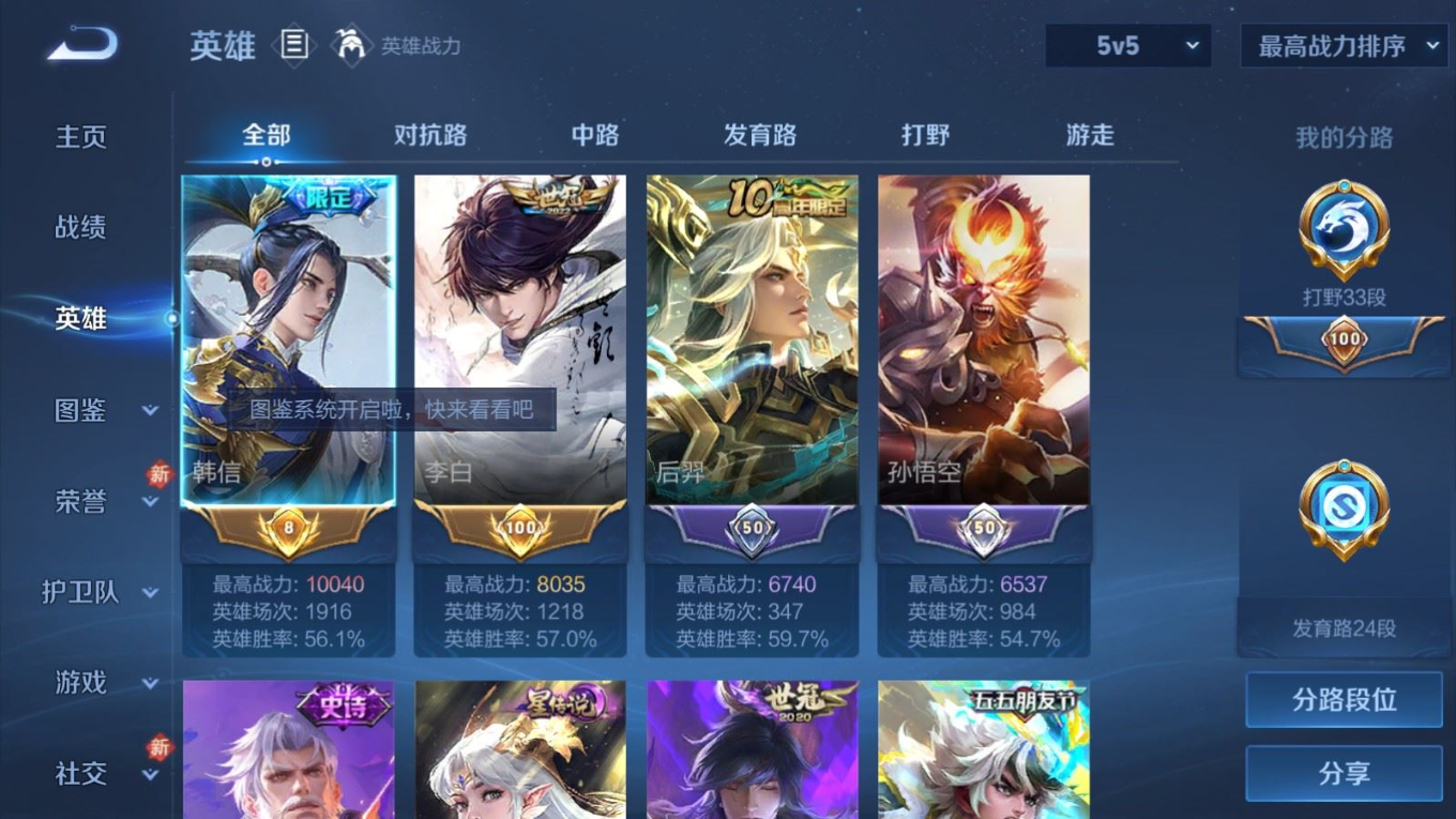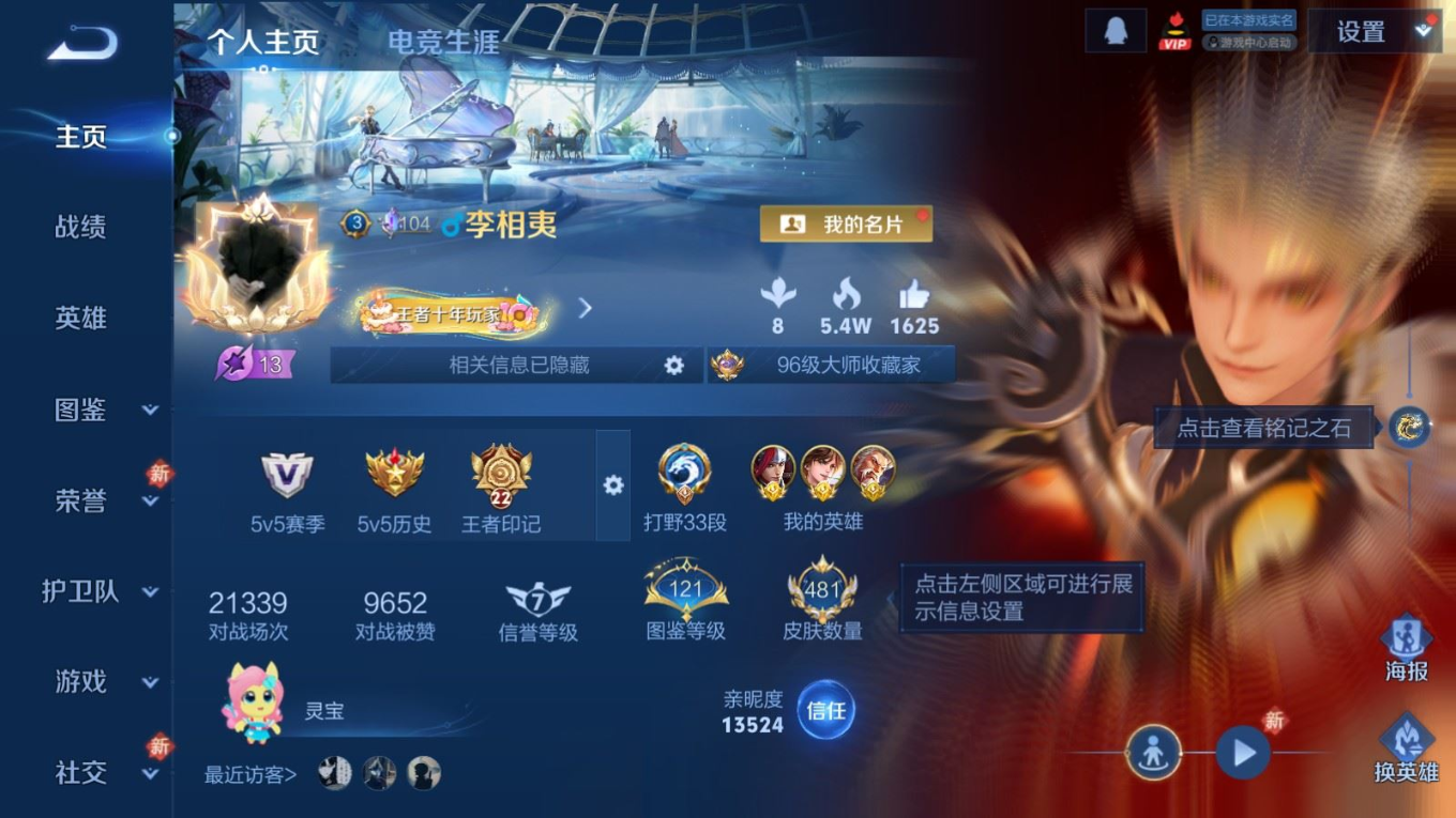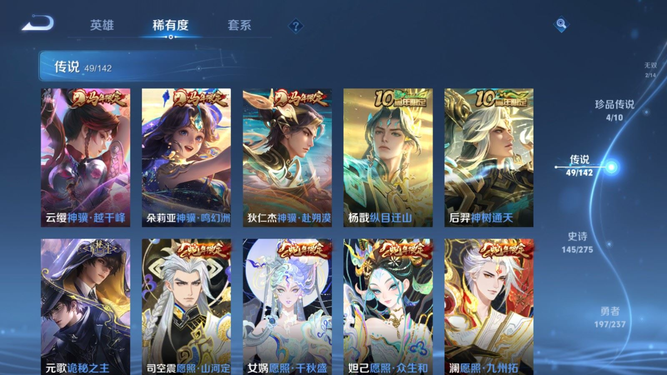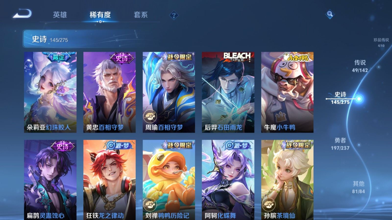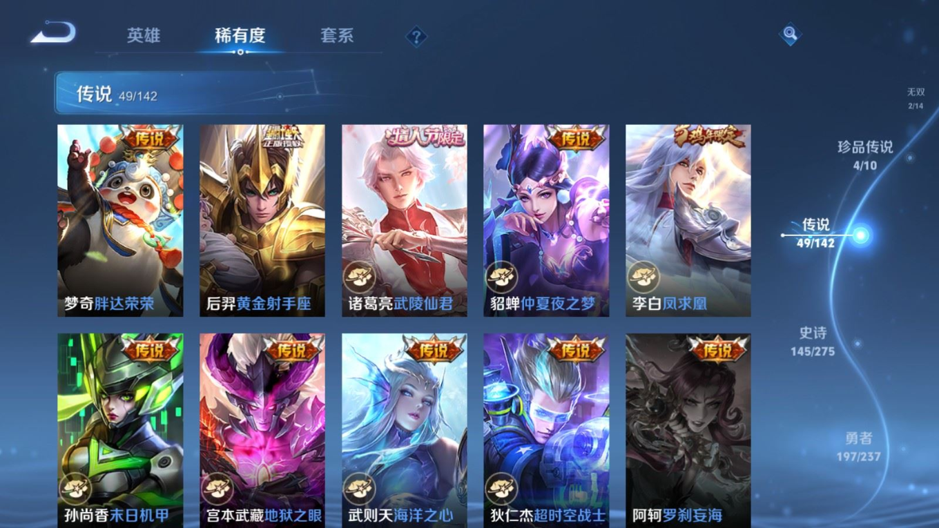 贵族等级:v10皮肤数:481传说品质49 生肖限定16 情人节限定7 无双2 珍品传说4 荣耀典藏3 英雄数:128