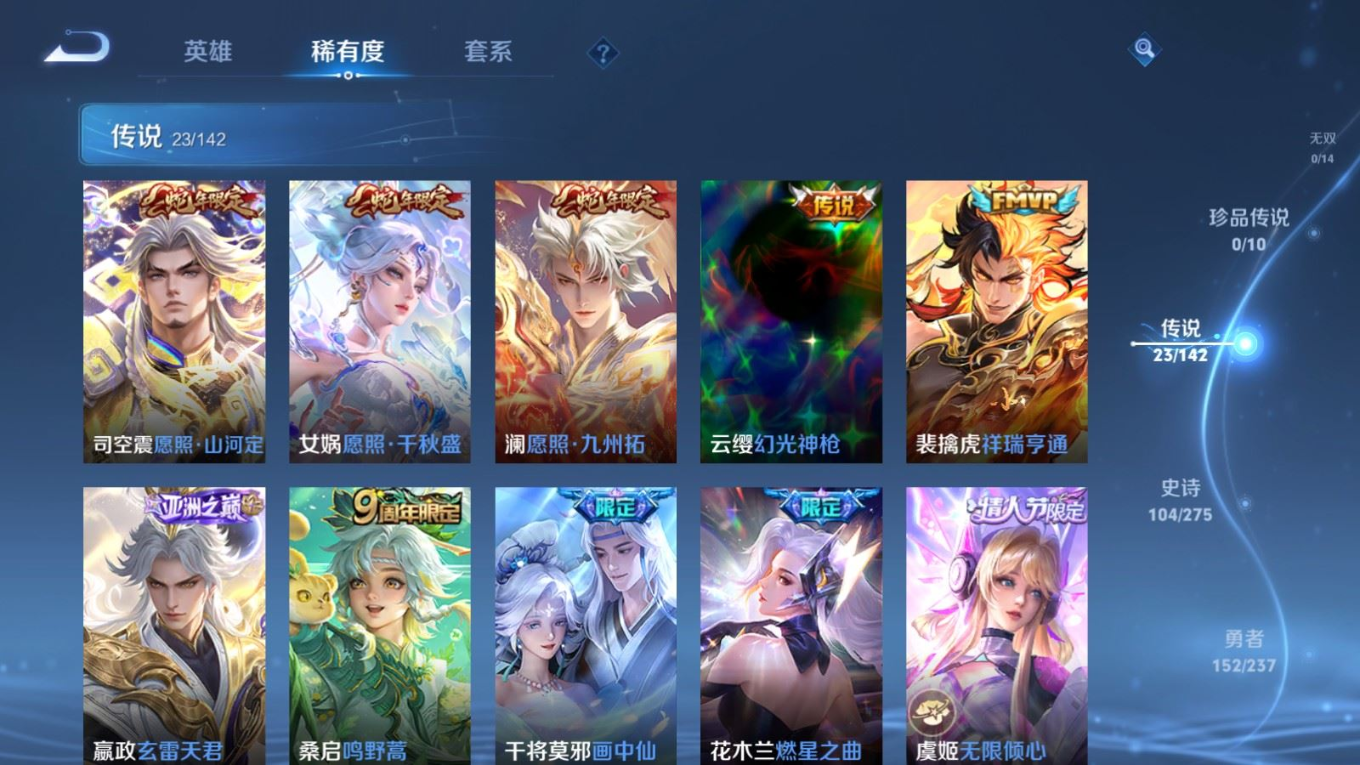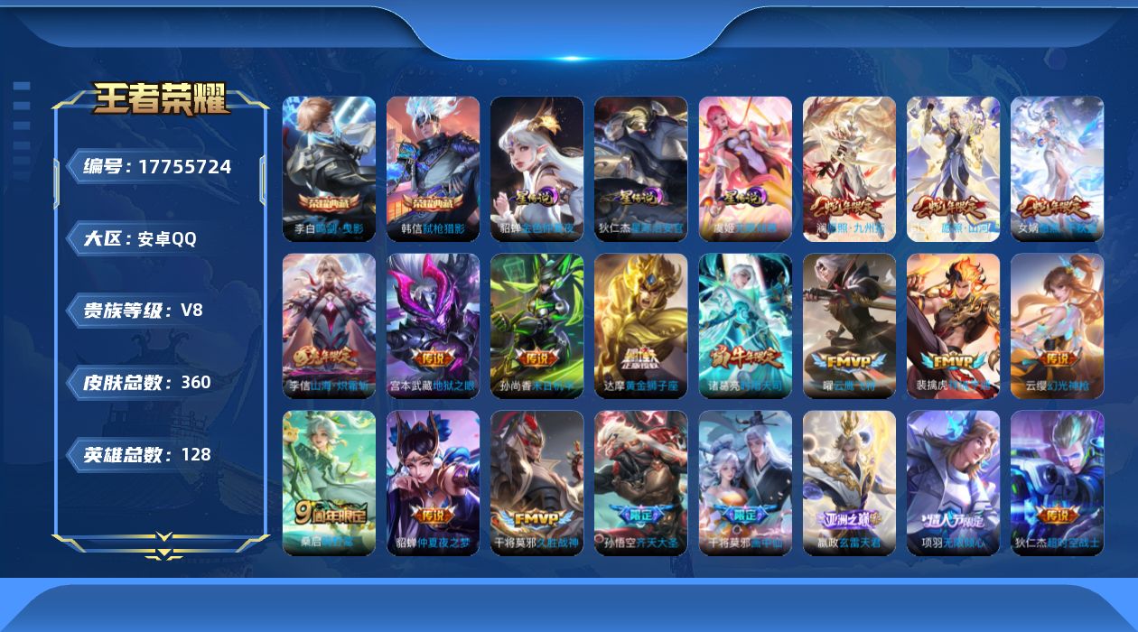 贵族等级:v8皮肤数:360传说品质23 生肖限定10 情人节限定3 荣耀典藏2 英雄数:128