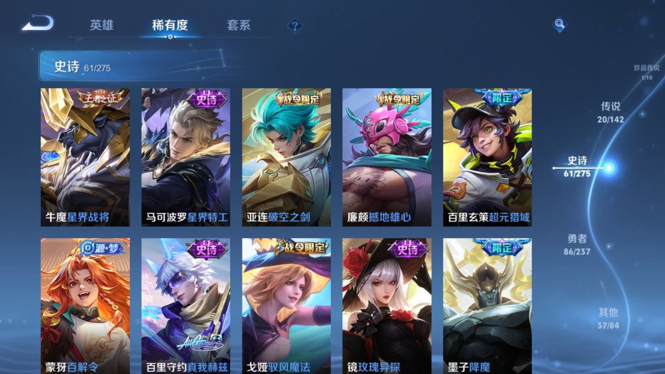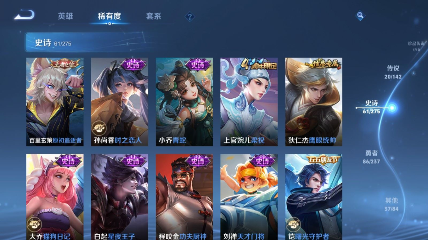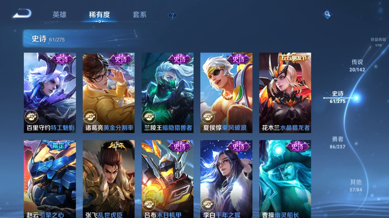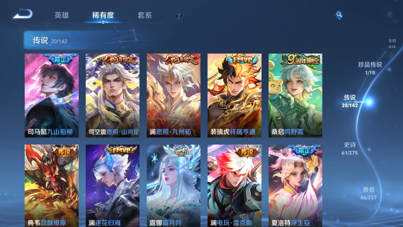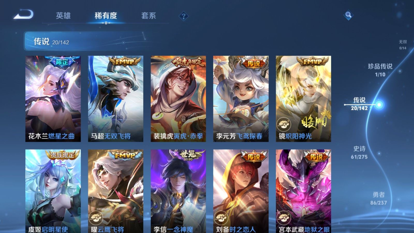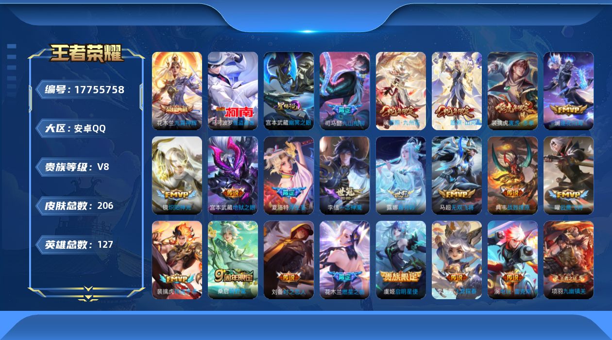 贵族等级:v8皮肤数:206传说品质20 生肖限定4 荣耀典藏1 珍品传说1 英雄数:127