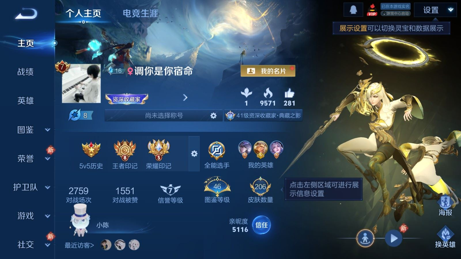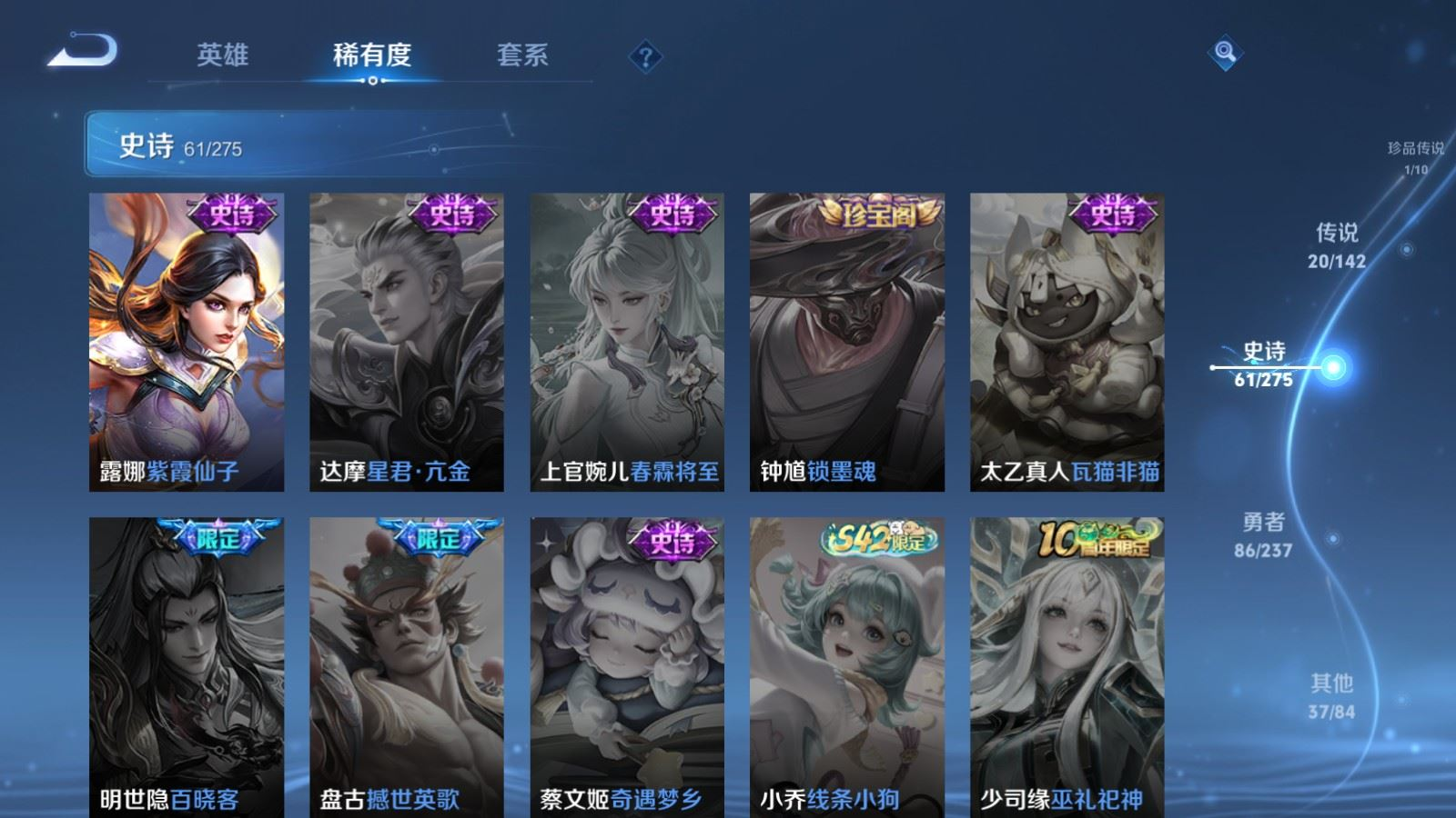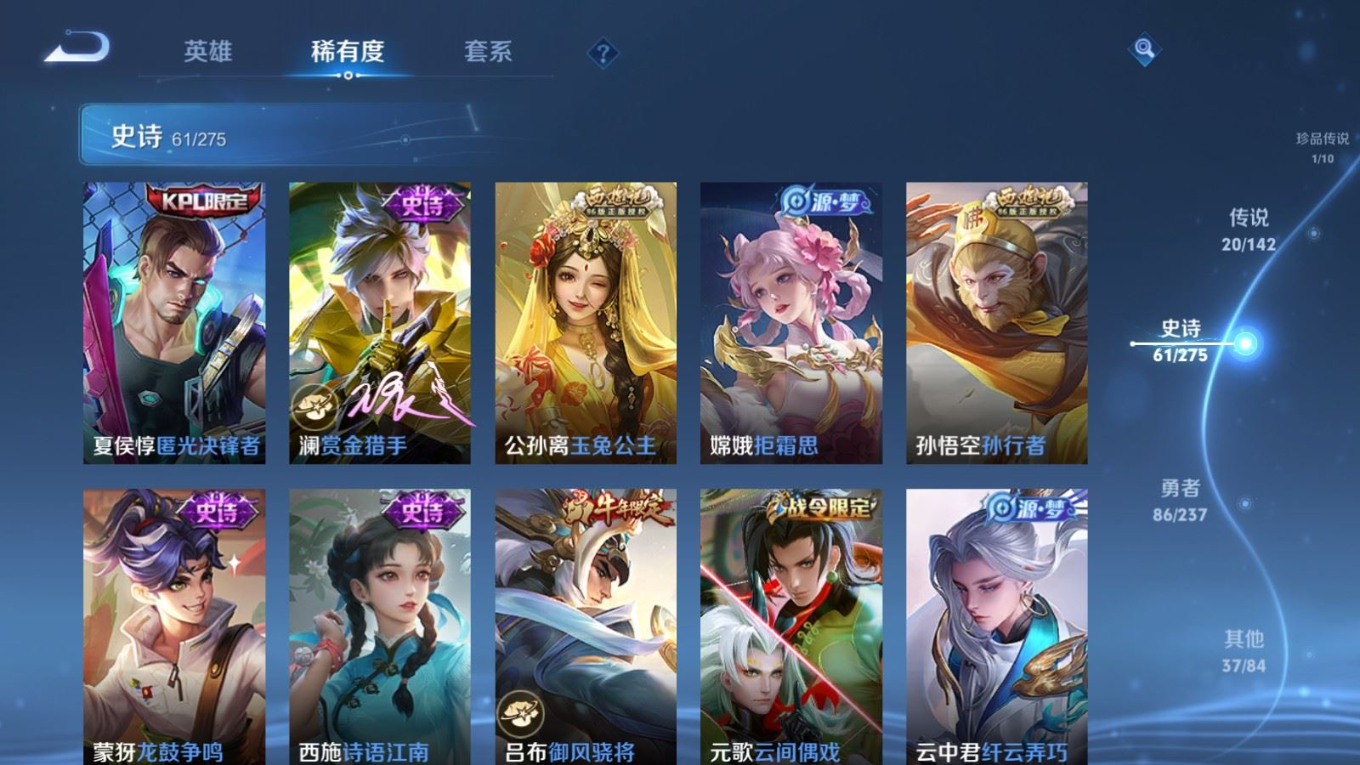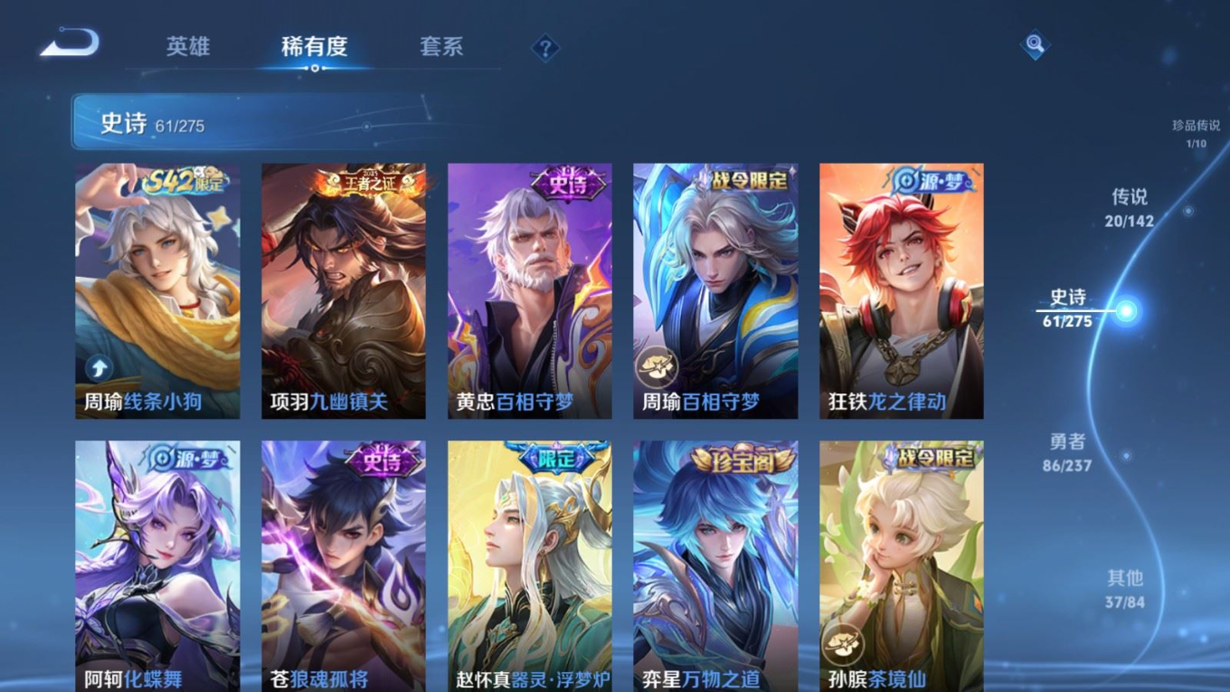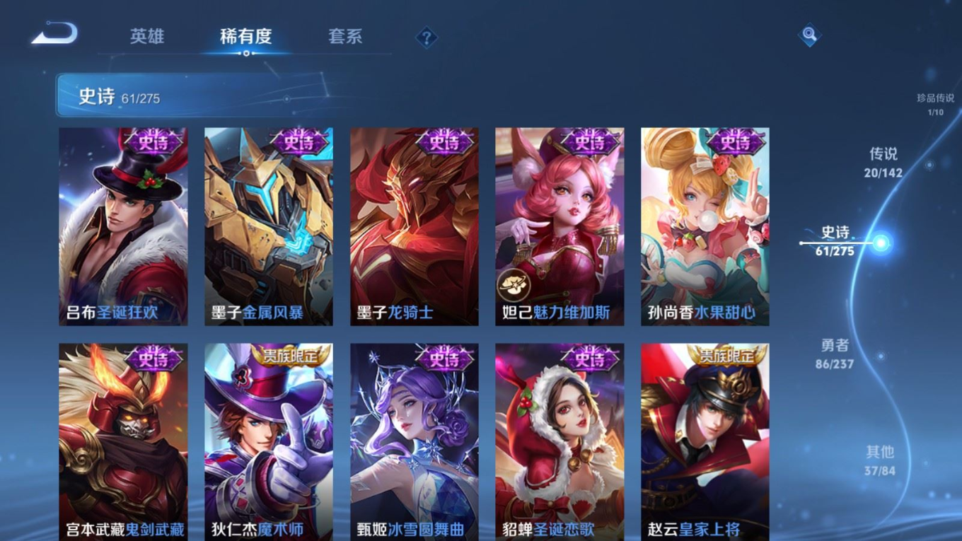 贵族等级:v8皮肤数:206传说品质20 生肖限定4 荣耀典藏1 珍品传说1 英雄数:127