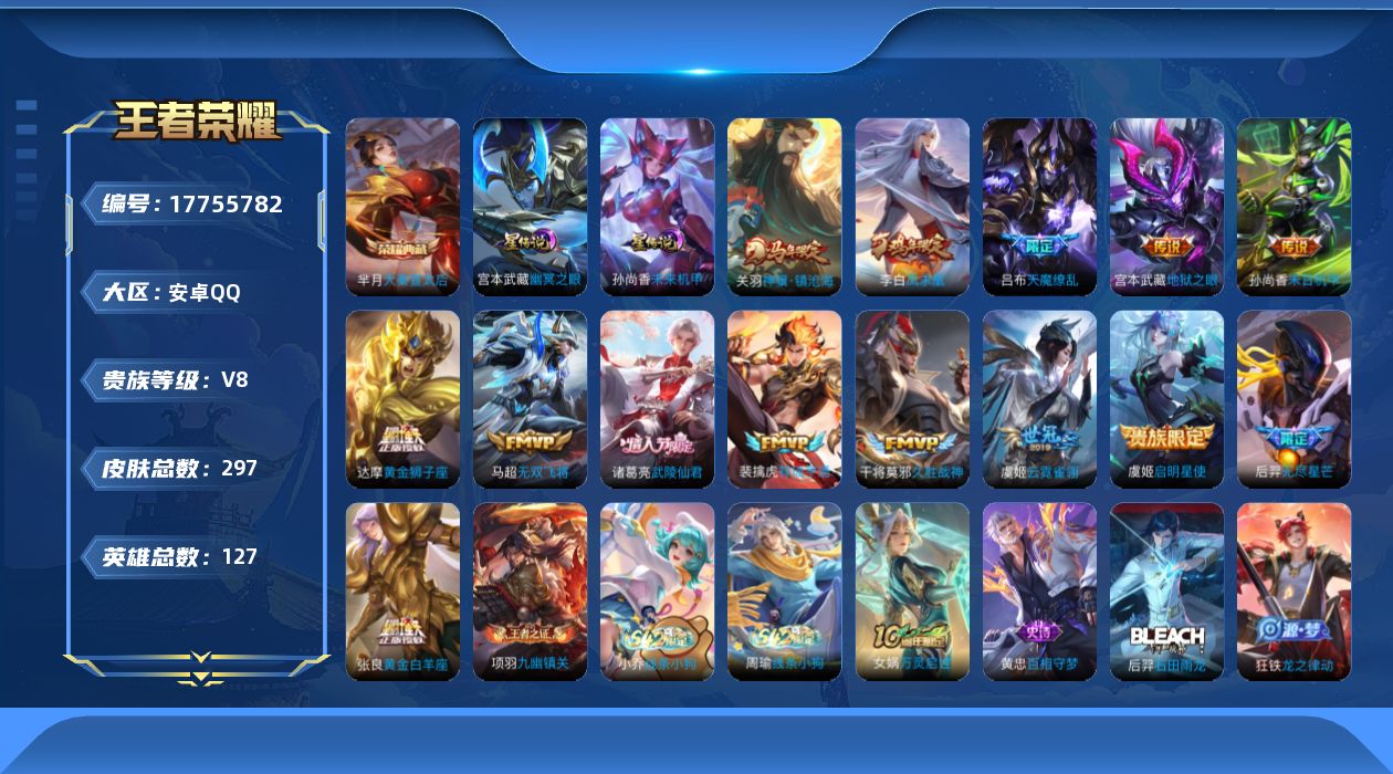 贵族等级:v8皮肤数:297生肖限定4 传说品质14 情人节限定2 荣耀典藏1 英雄数:127