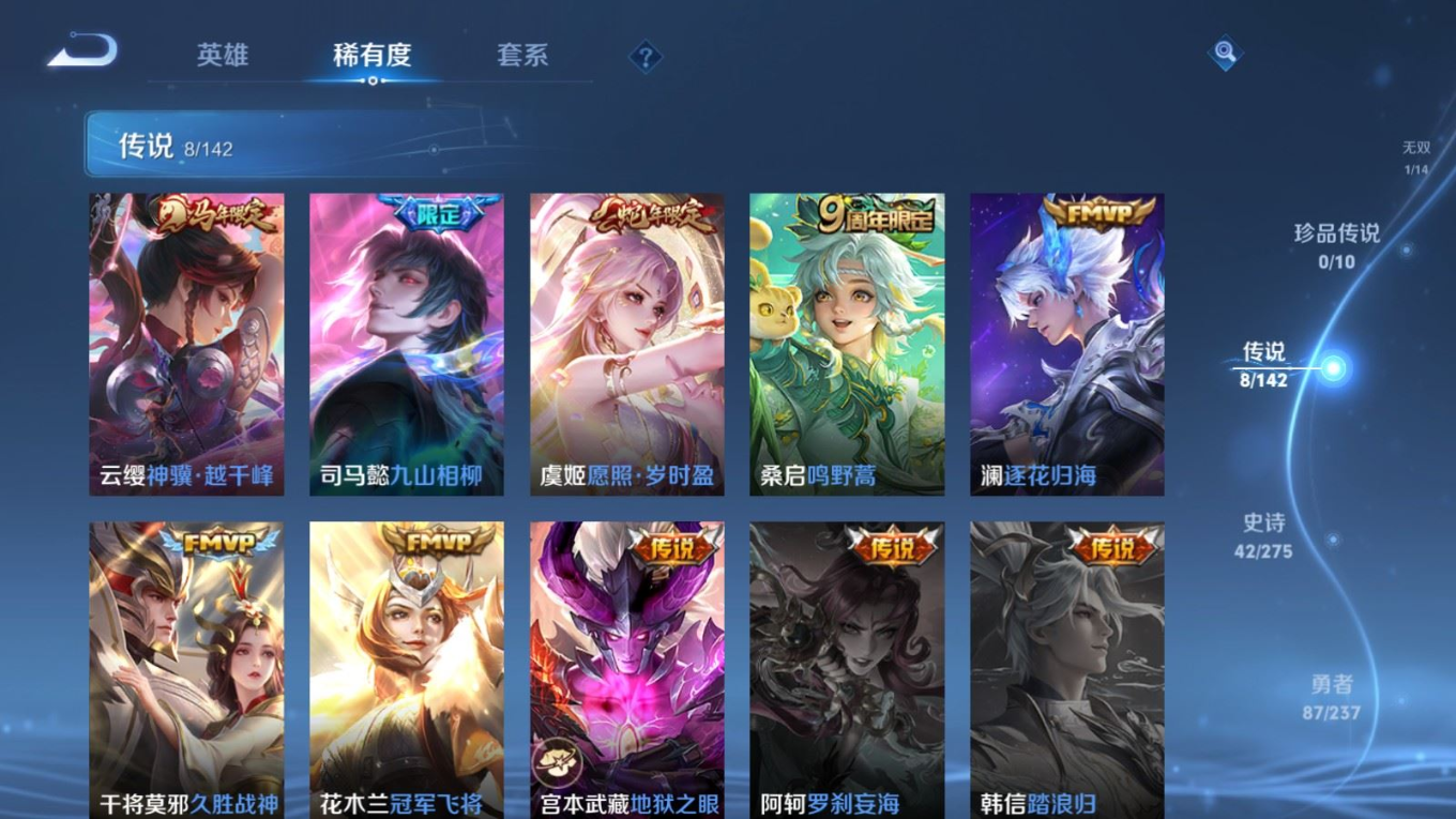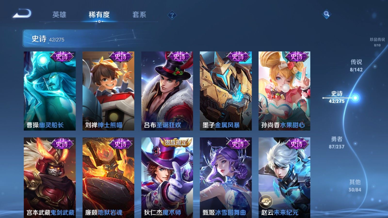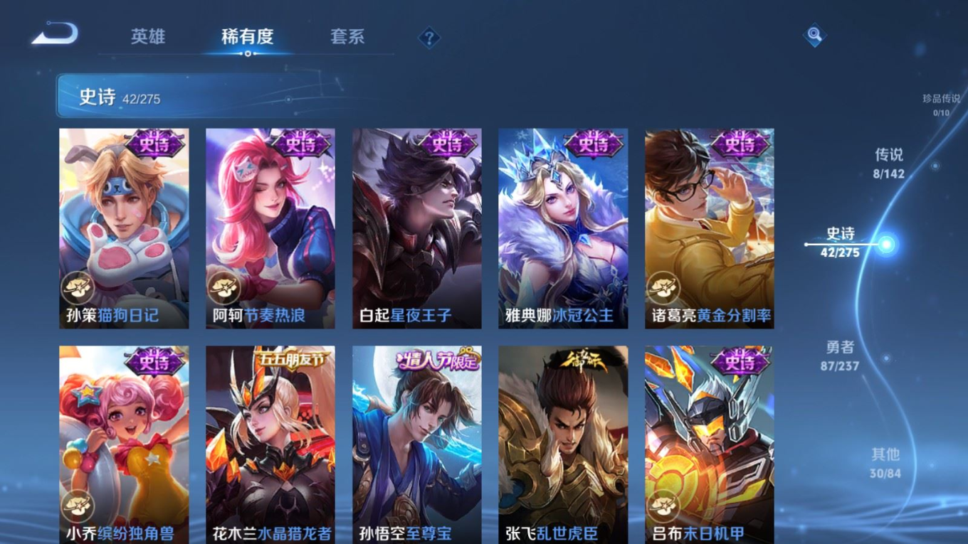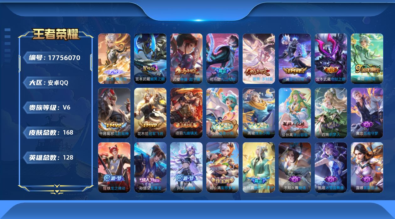 贵族等级:v6皮肤数:168传说品质8 情人节限定1 生肖限定2 无双1 英雄数:128
