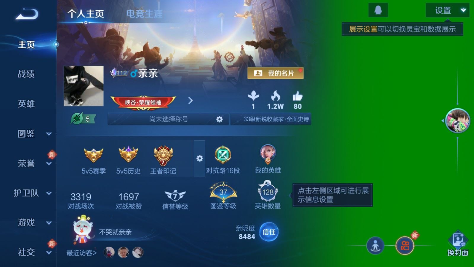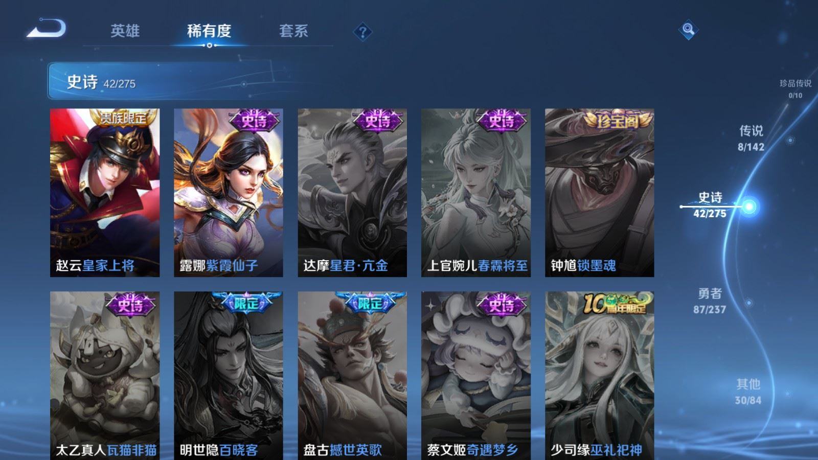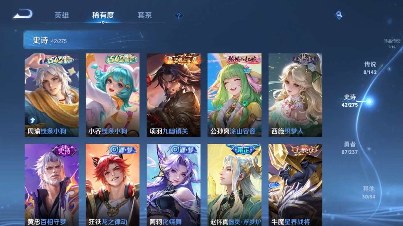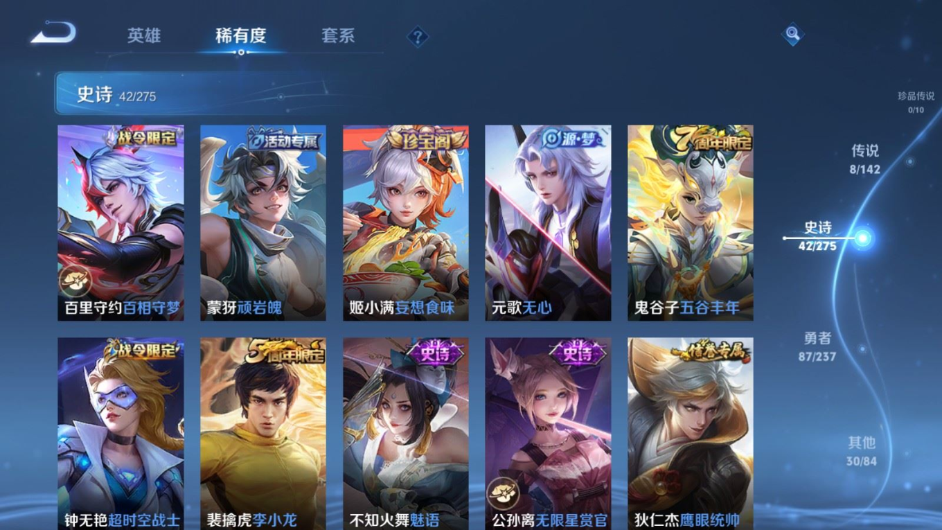贵族等级:v6皮肤数:168传说品质8 情人节限定1 生肖限定2 无双1 英雄数:128