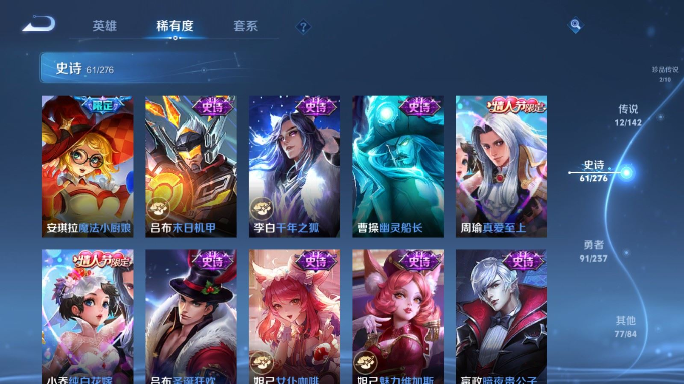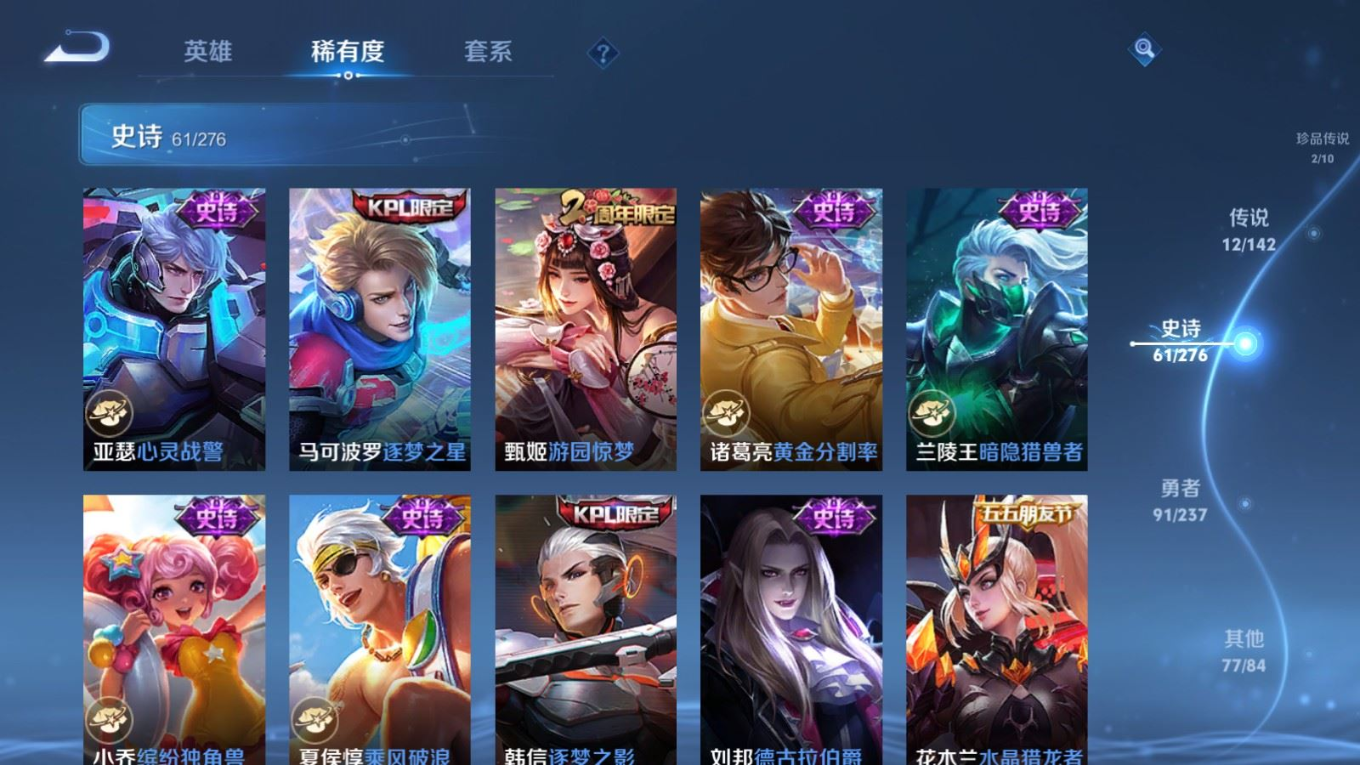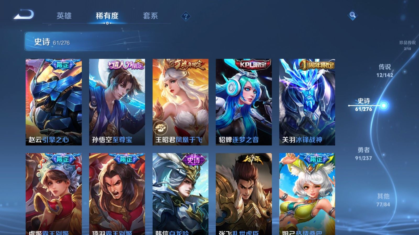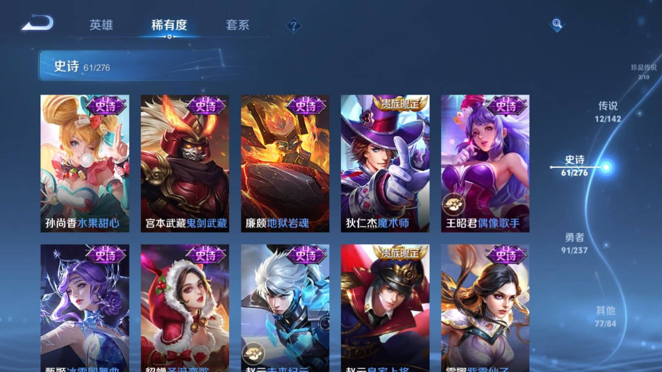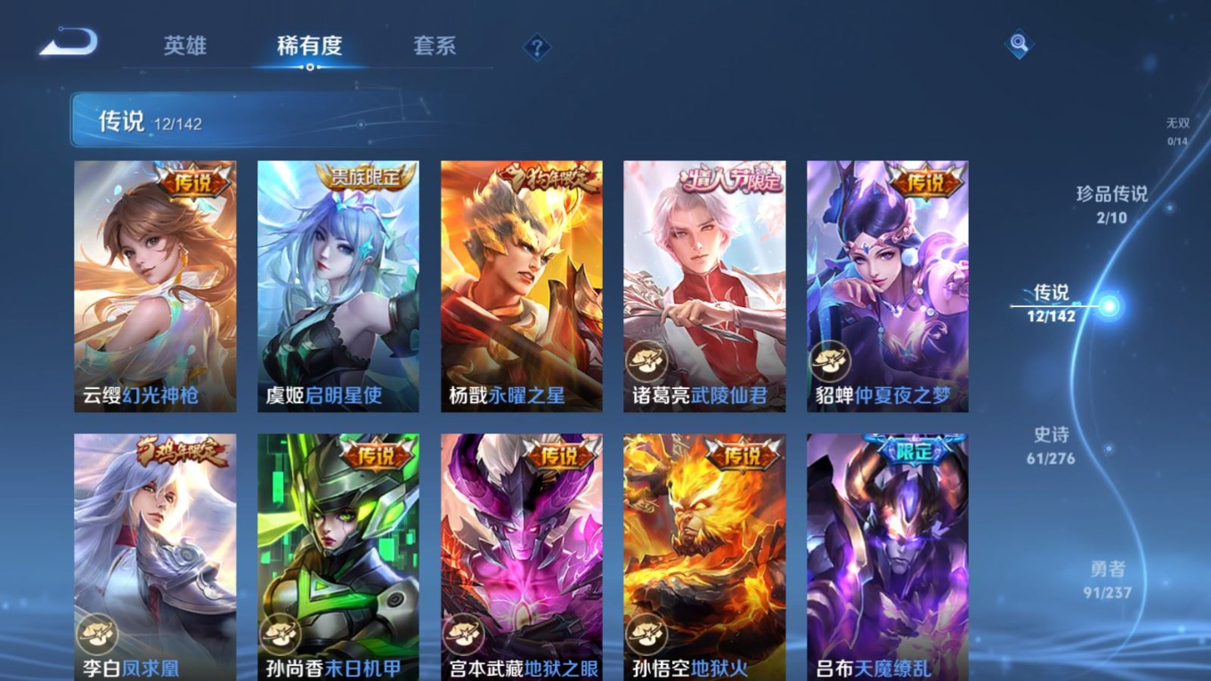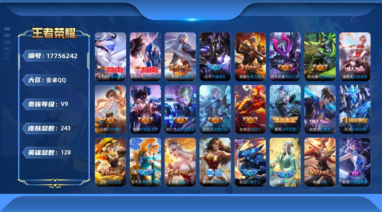 贵族等级:v9皮肤数:243生肖限定5 传说品质12 情人节限定4 珍品传说2 英雄数:128