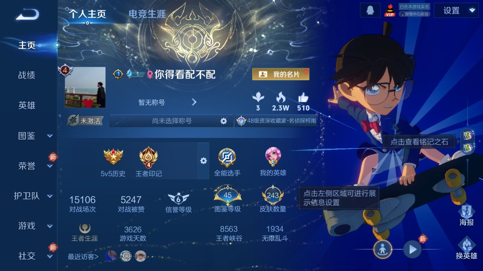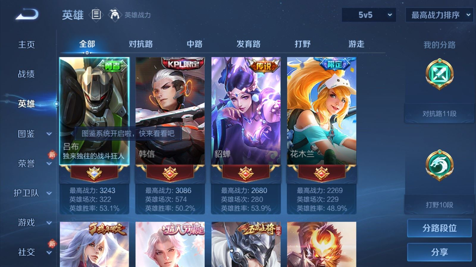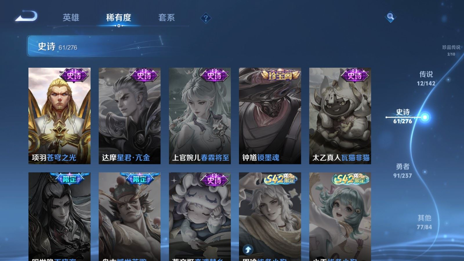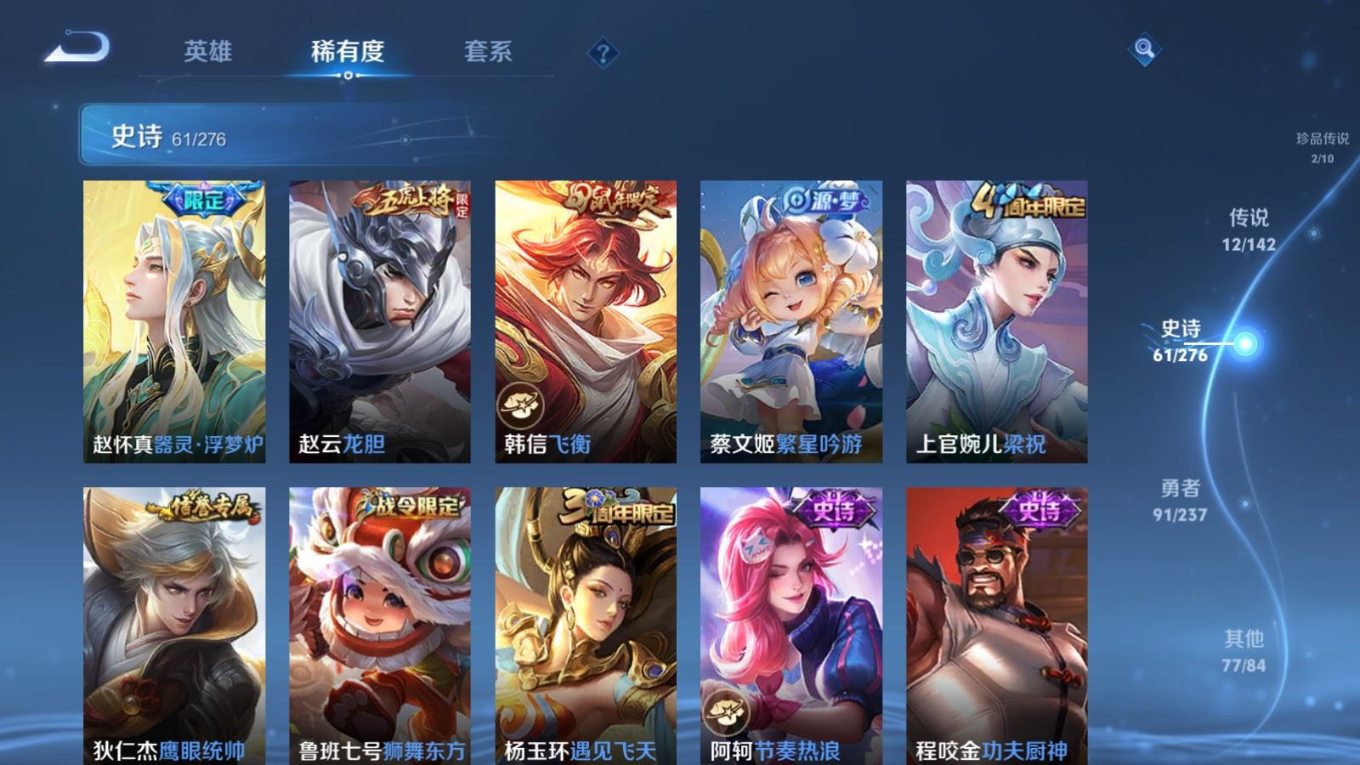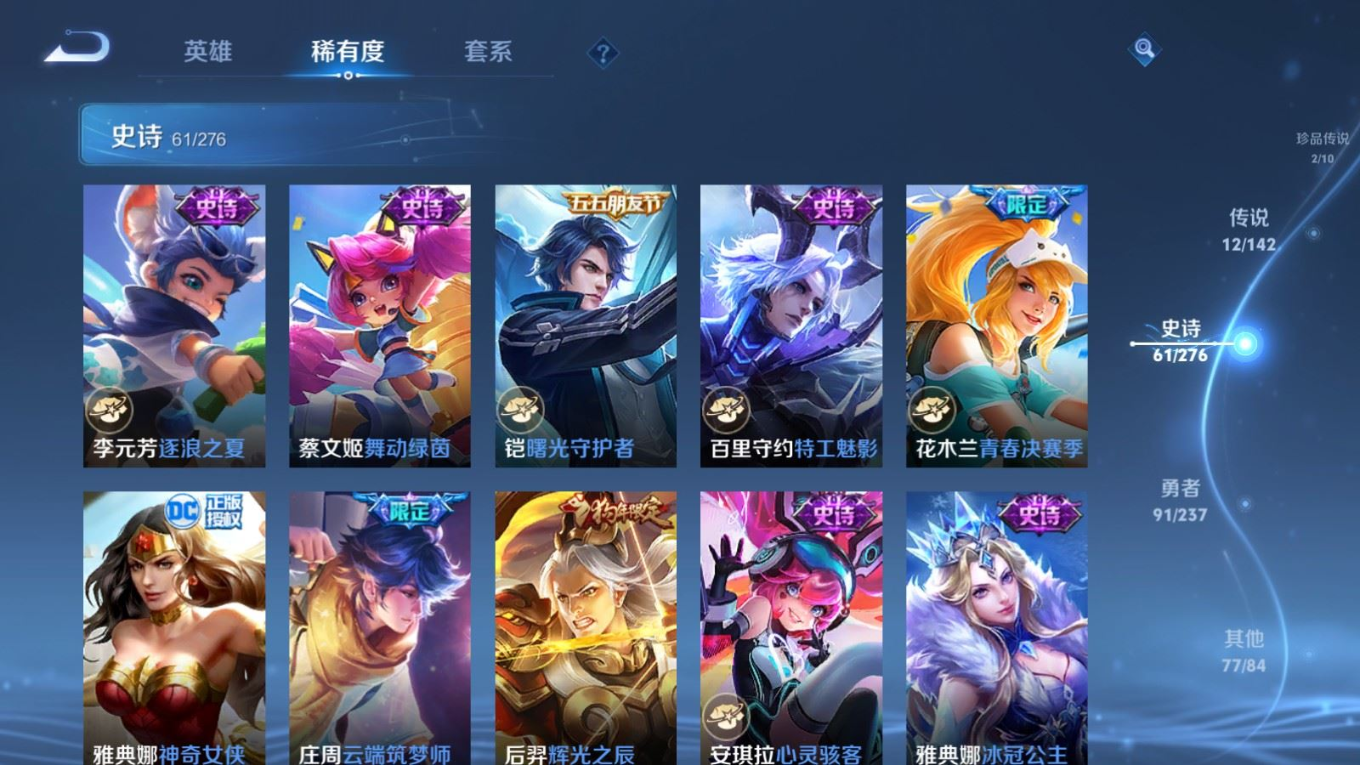 贵族等级:v9皮肤数:243生肖限定5 传说品质12 情人节限定4 珍品传说2 英雄数:128