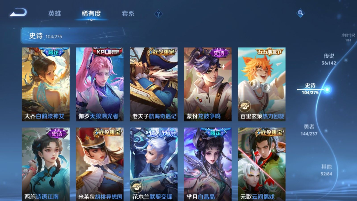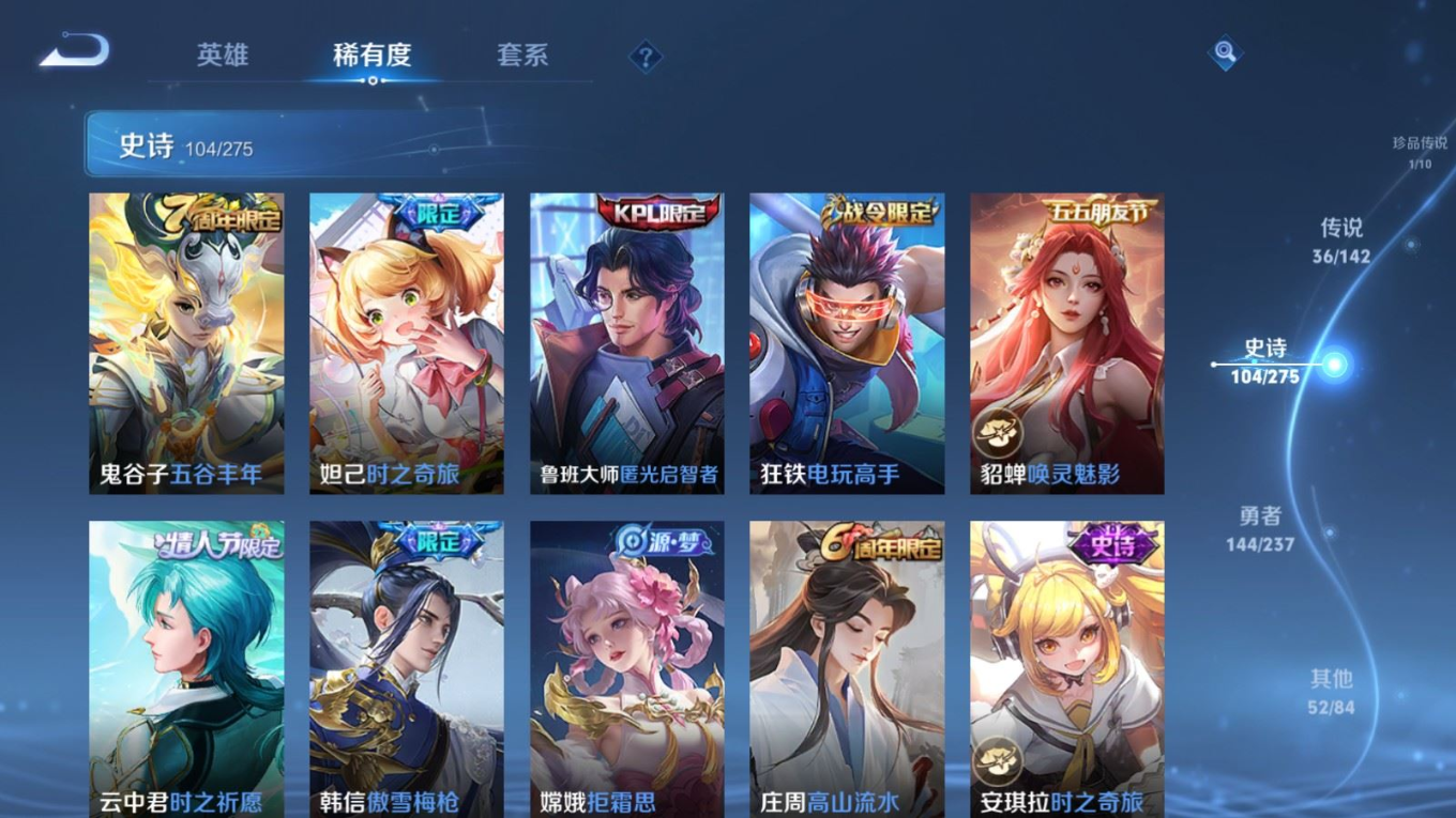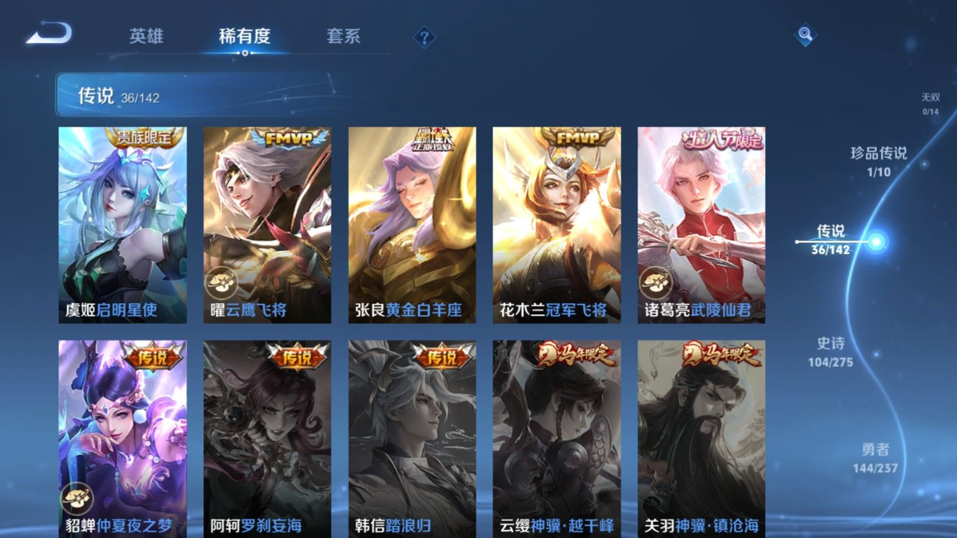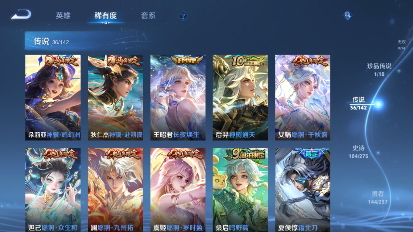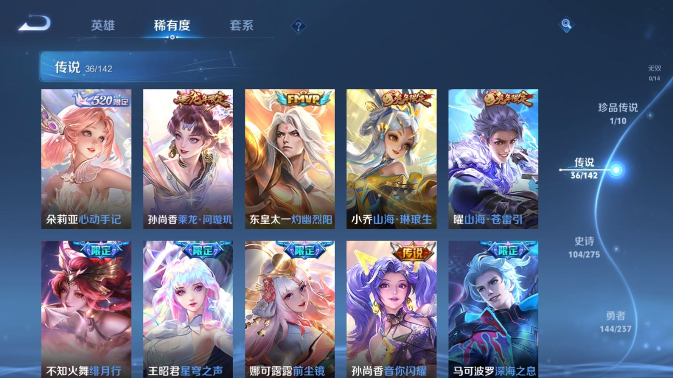 传说品质_后羿_神树通天传说品质_娜可露露_前尘镜传说品质_澜_愿照·九州拓传说品质_诸葛亮_武陵仙君传说品质_诸葛亮_时雨天司传说品质_兰陵王_默契交锋传说品质_马超_无双飞将传说品质_大乔_挚爱花嫁传说品质_西施_游龙清影传说品质_花木兰_冠军飞将传说品质_不知火舞_绯月行传说品质_貂蝉_遇见胡旋传说品质_貂蝉_仲夏夜之梦传说品质_孙尚香_乘龙·问璇玑传说品质_孙尚香_音你闪耀传说品质_夏侯惇_霜北刀传说品质_小乔_山海·琳琅生传说品质_桑启_鸣野蒿传说品质_东皇太一_灼幽烈阳传说品质_王昭君_星穹之声传说品质_王昭君_长夜焕生传说品质_张良_黄金白羊座传说品质_女娲_愿照·千秋盛传说品质_马可波罗_深海之息传说品质_妲己_愿照·众生和传说品质_瑶_时之祈愿传说品质_朵莉亚_心动手记传说品质_朵莉亚_神骥·鸣幻洲传说品质_曜_云鹰飞将传说品质_曜_李逍遥 传说品质_曜_山海·苍雷引传说品质_孙策_挚爱之约传说品质_狄仁杰_神骥·赴朔漠传说品质_虞姬_愿照·岁时盈传说品质_虞姬_启明星使传说品质_王昭君_乞巧织情
