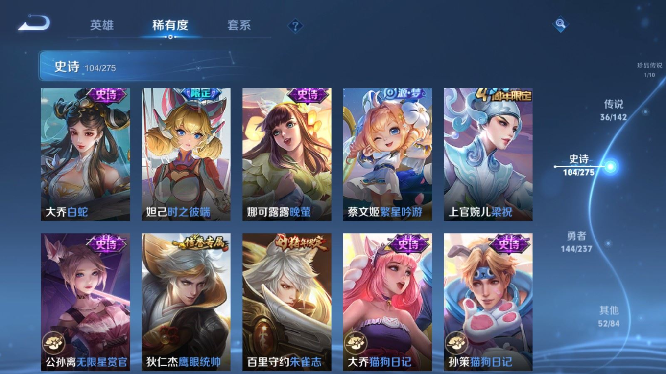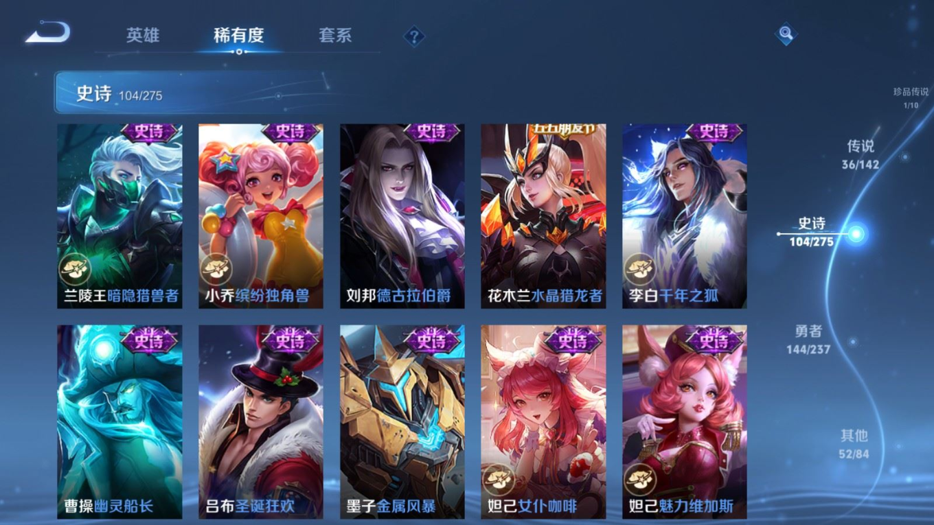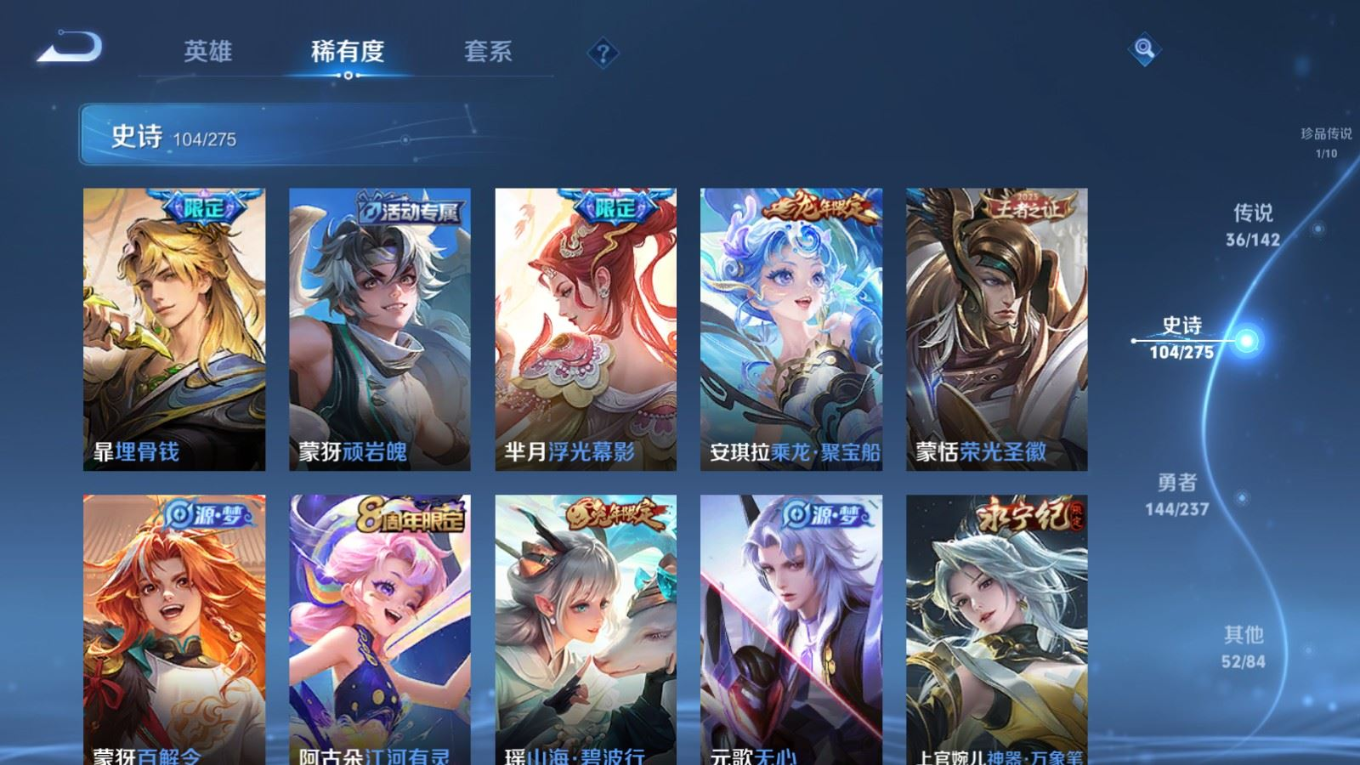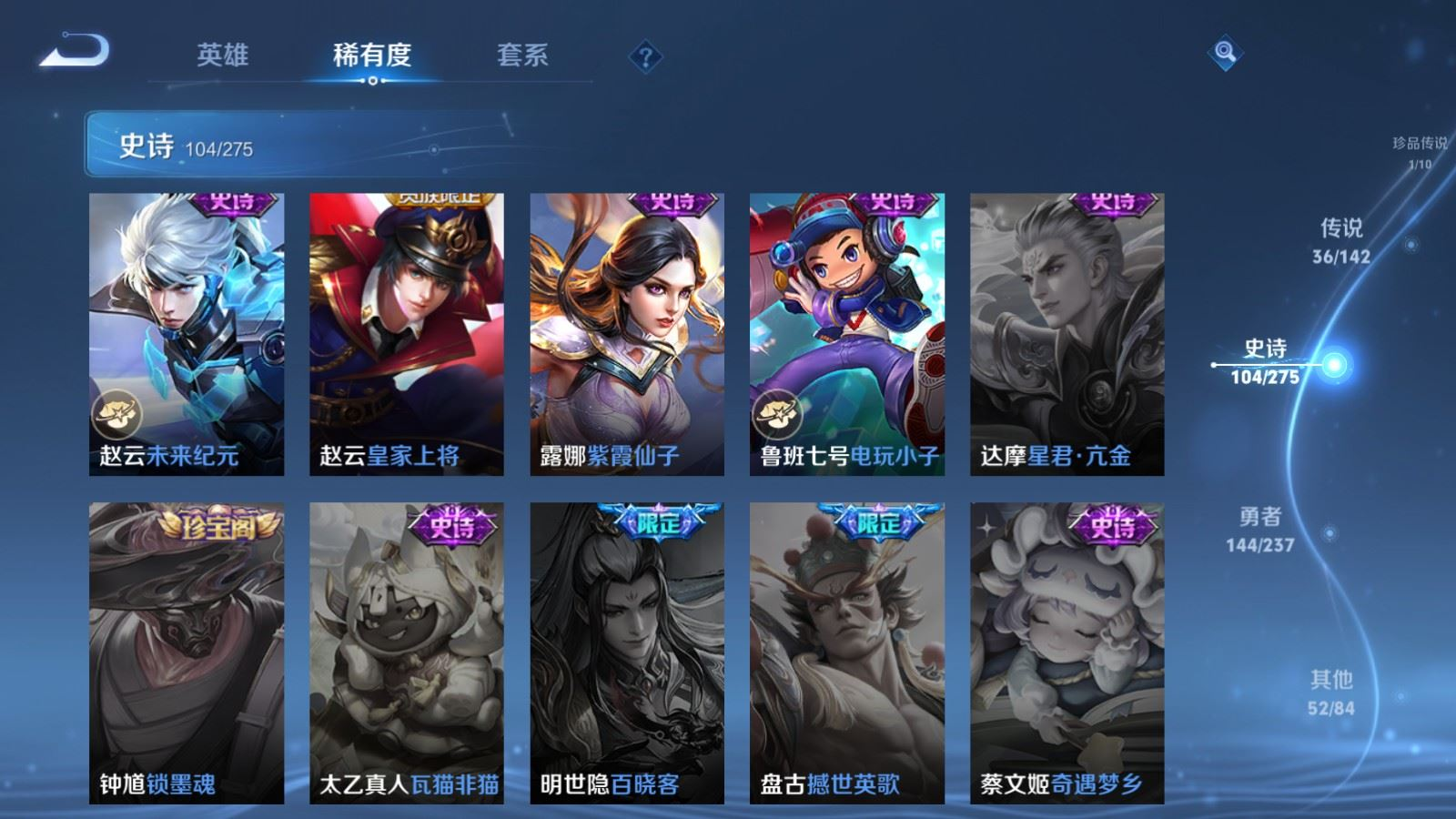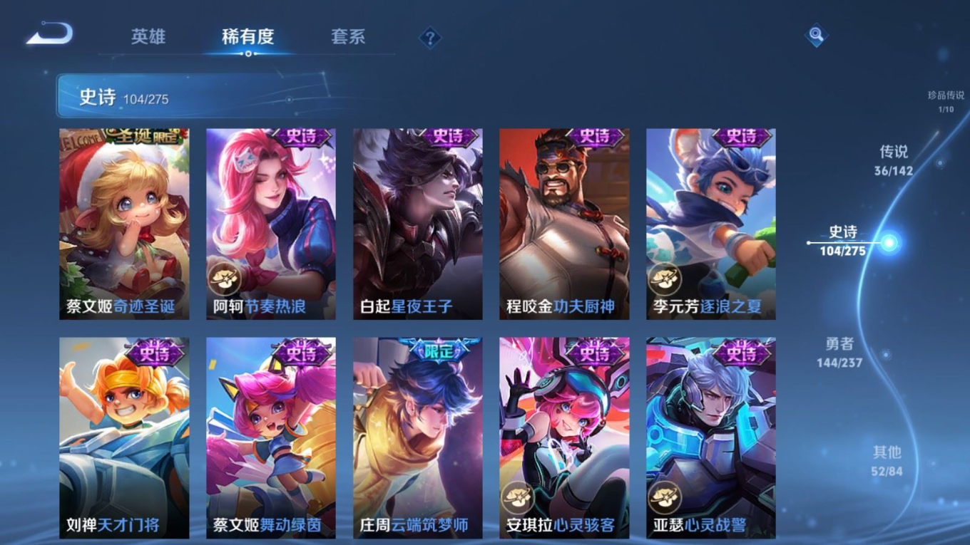传说品质_后羿_神树通天传说品质_娜可露露_前尘镜传说品质_澜_愿照·九州拓传说品质_诸葛亮_武陵仙君传说品质_诸葛亮_时雨天司传说品质_兰陵王_默契交锋传说品质_马超_无双飞将传说品质_大乔_挚爱花嫁传说品质_西施_游龙清影传说品质_花木兰_冠军飞将传说品质_不知火舞_绯月行传说品质_貂蝉_遇见胡旋传说品质_貂蝉_仲夏夜之梦传说品质_孙尚香_乘龙·问璇玑传说品质_孙尚香_音你闪耀传说品质_夏侯惇_霜北刀传说品质_小乔_山海·琳琅生传说品质_桑启_鸣野蒿传说品质_东皇太一_灼幽烈阳传说品质_王昭君_星穹之声传说品质_王昭君_长夜焕生传说品质_张良_黄金白羊座传说品质_女娲_愿照·千秋盛传说品质_马可波罗_深海之息传说品质_妲己_愿照·众生和传说品质_瑶_时之祈愿传说品质_朵莉亚_心动手记传说品质_朵莉亚_神骥·鸣幻洲传说品质_曜_云鹰飞将传说品质_曜_李逍遥 传说品质_曜_山海·苍雷引传说品质_孙策_挚爱之约传说品质_狄仁杰_神骥·赴朔漠传说品质_虞姬_愿照·岁时盈传说品质_虞姬_启明星使传说品质_王昭君_乞巧织情