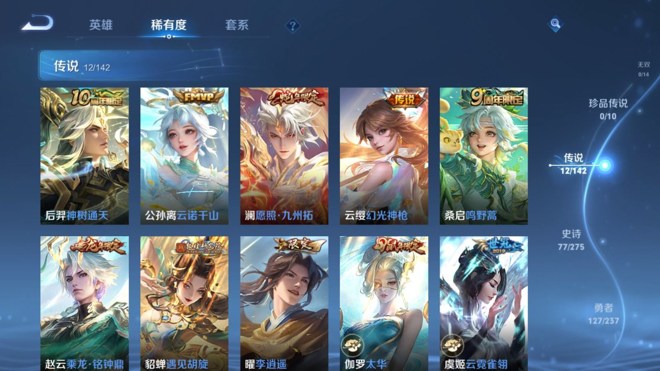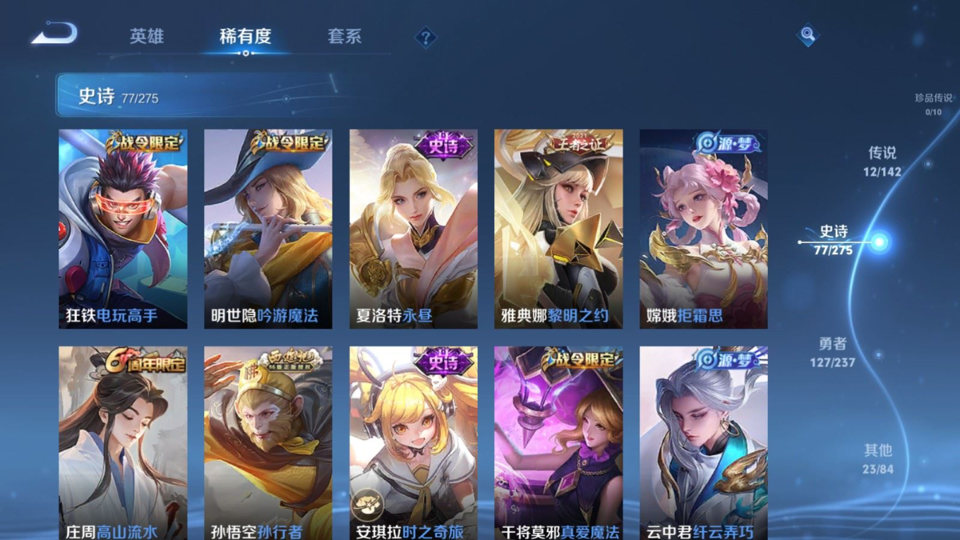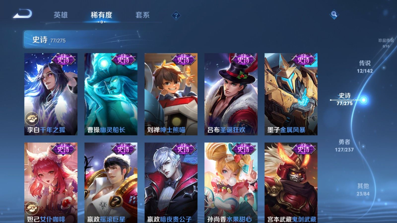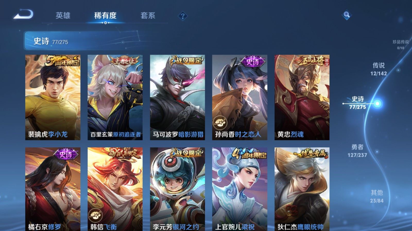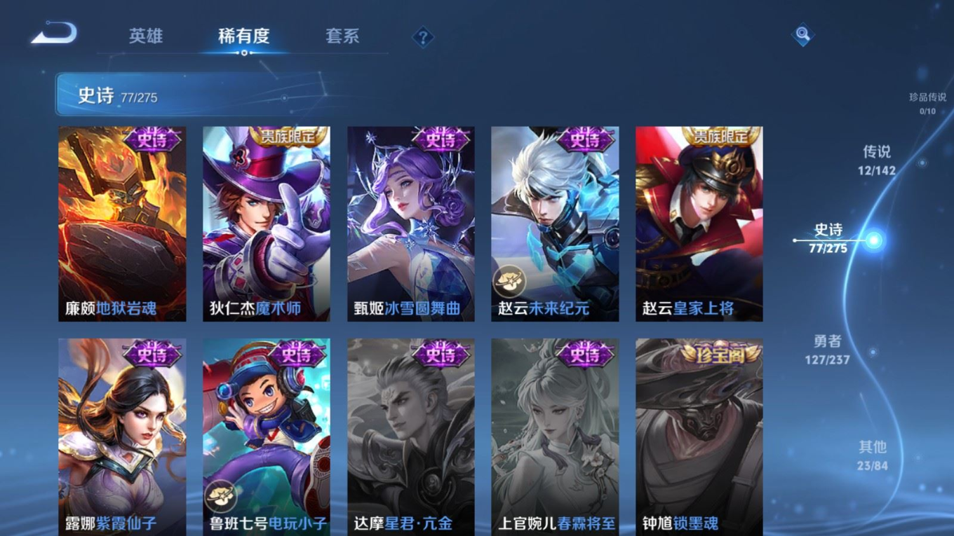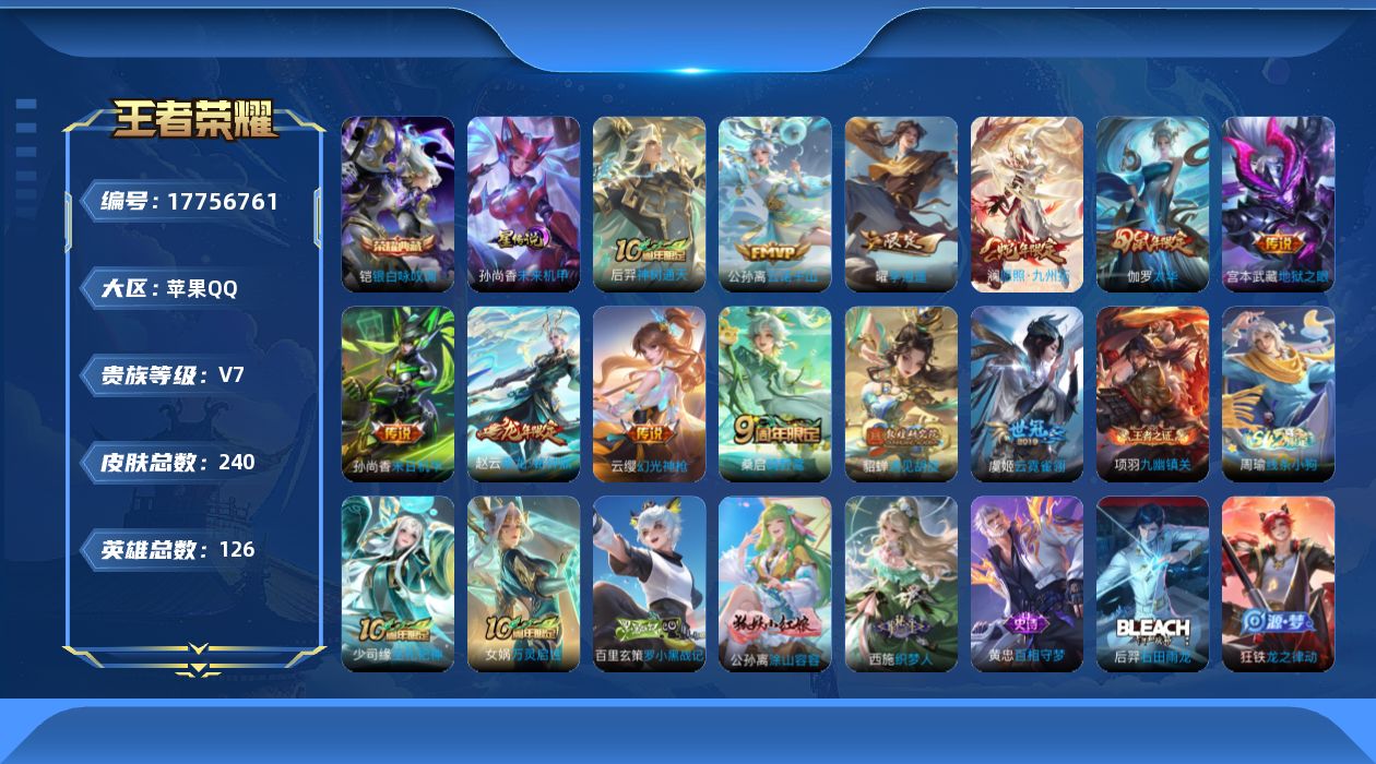 贵族等级:v7皮肤数:240传说品质12 生肖限定4 情人节限定1 荣耀典藏1 英雄数:126