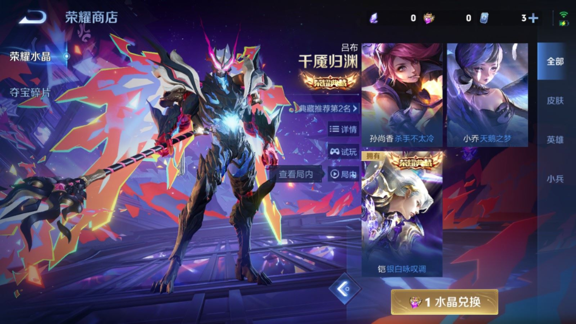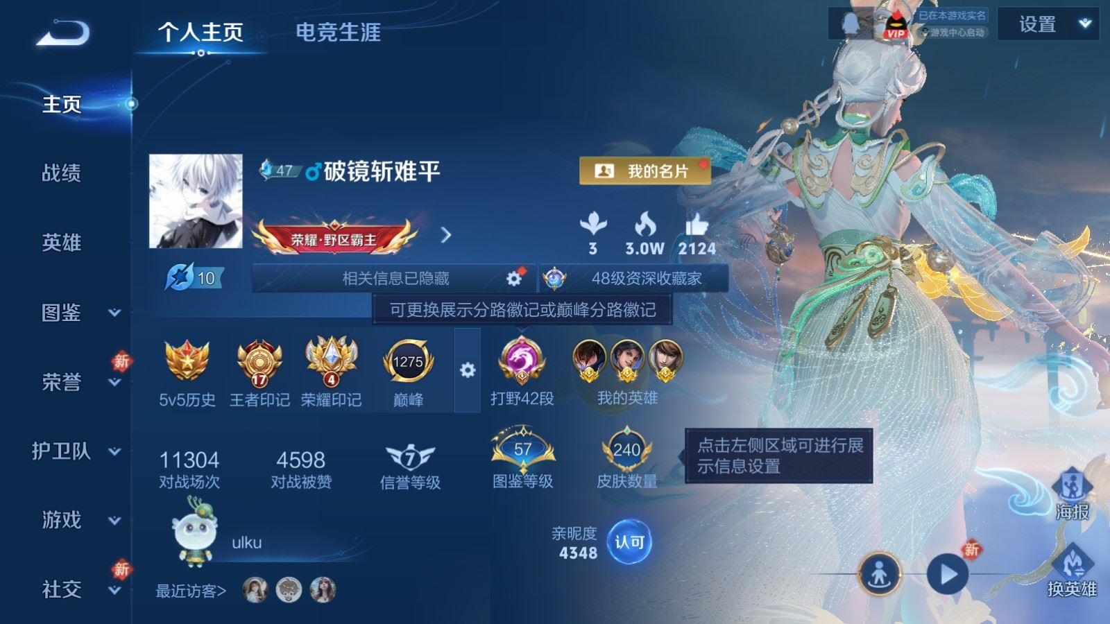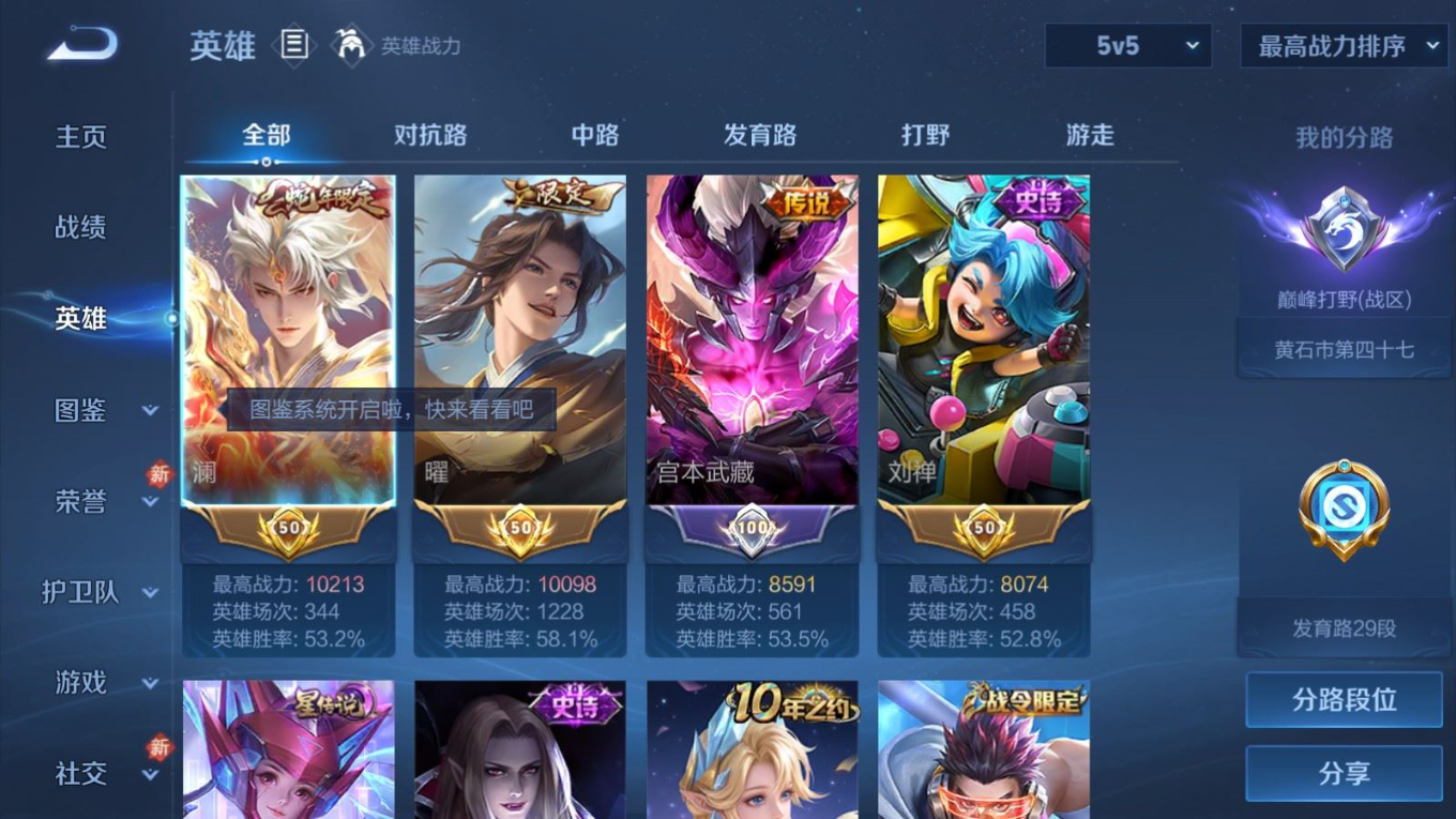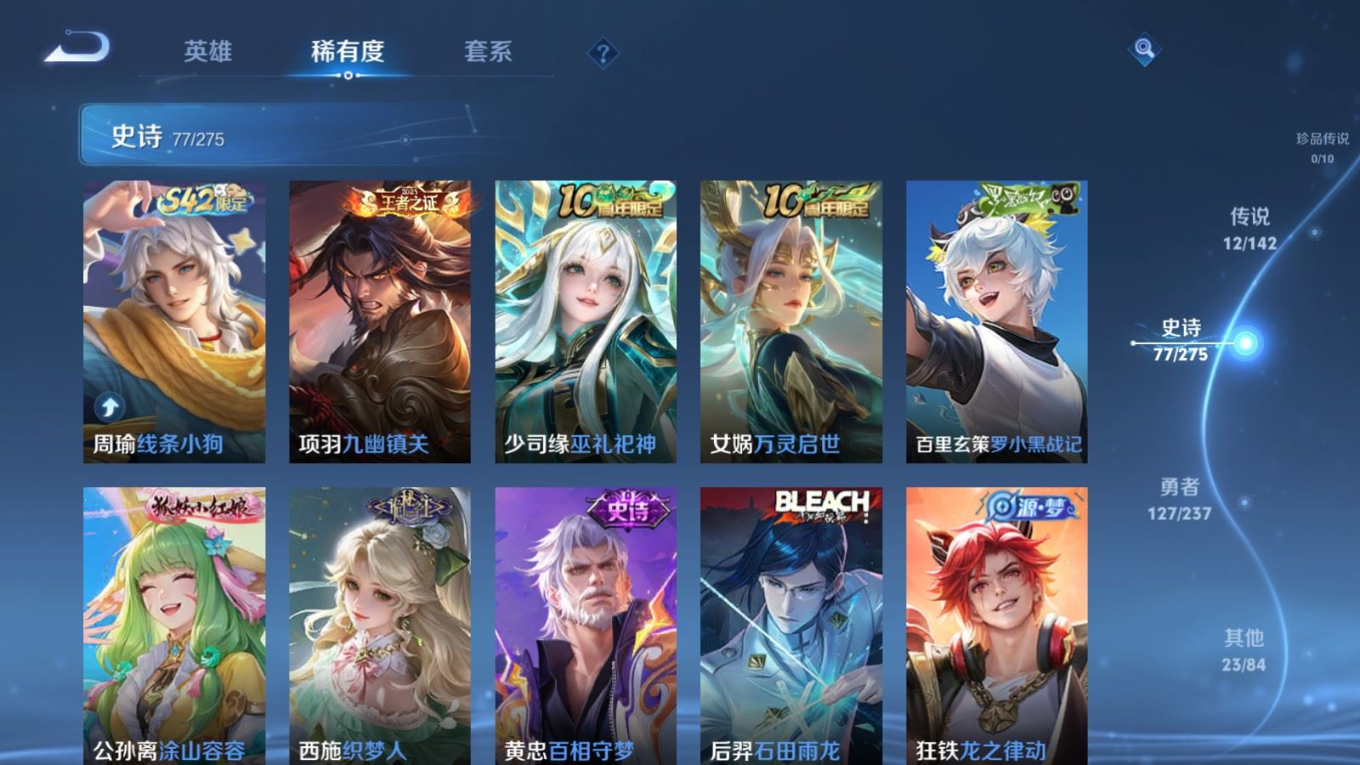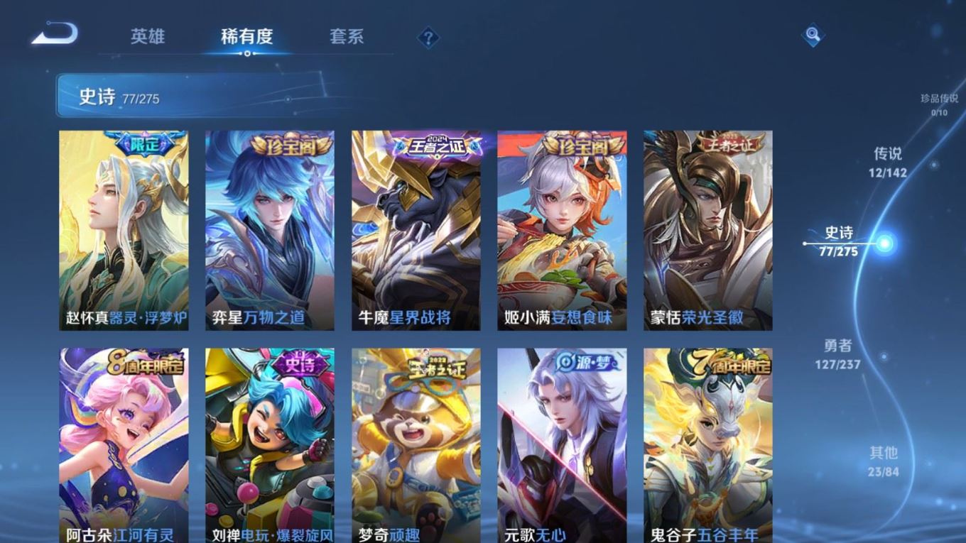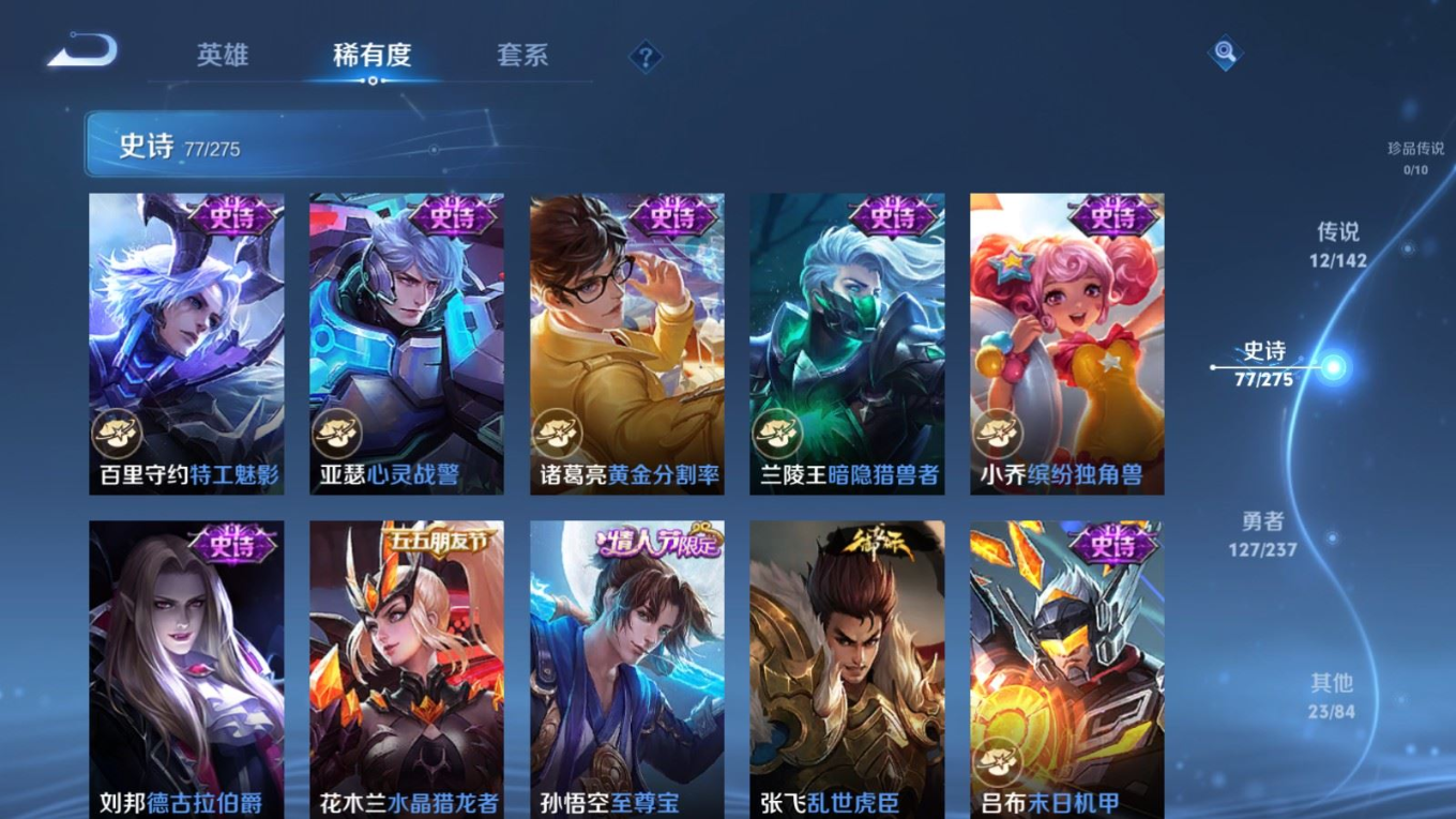 贵族等级:v7皮肤数:240传说品质12 生肖限定4 情人节限定1 荣耀典藏1 英雄数:126