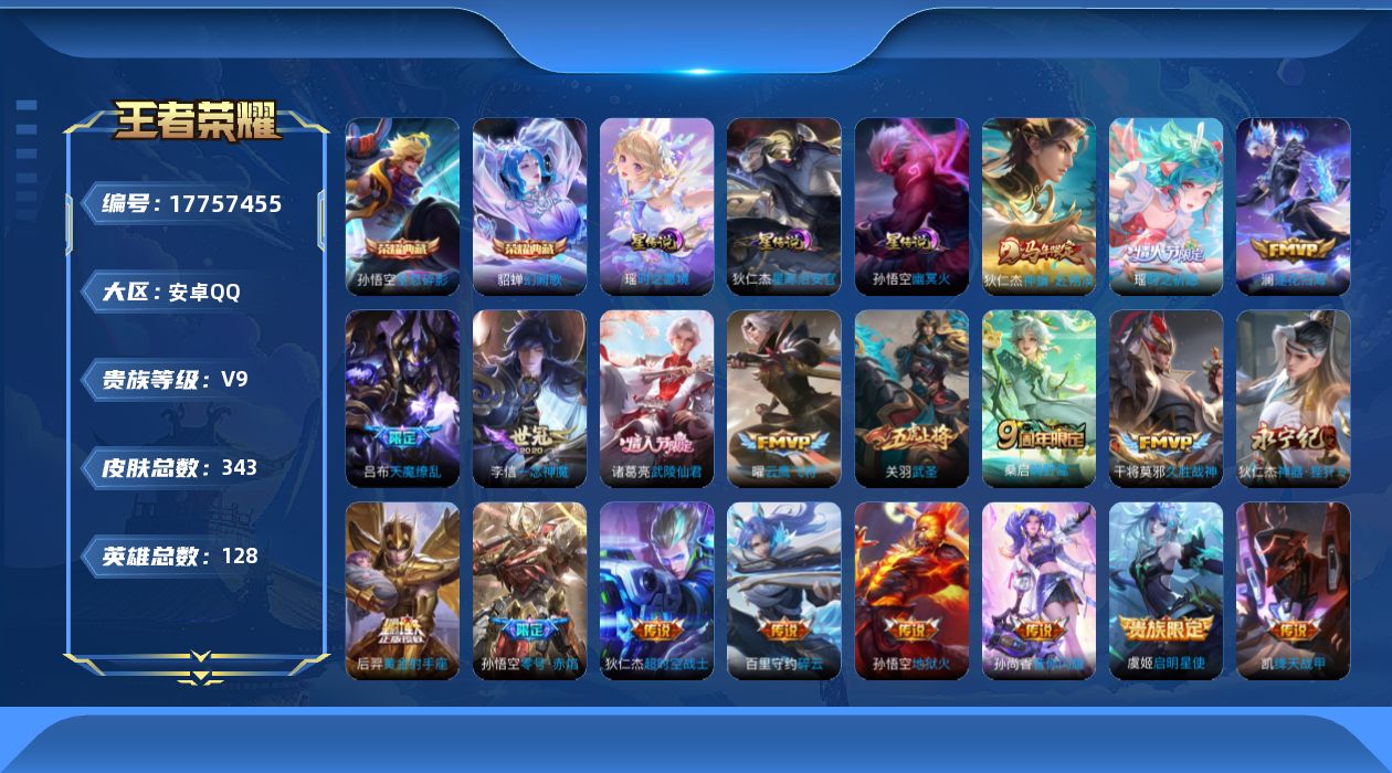 贵族等级:v9皮肤数:343传说品质19 情人节限定5 荣耀典藏2 生肖限定2 英雄数:128