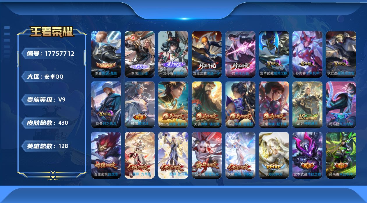 贵族等级:v9皮肤数:430情人节限定4 传说品质27 生肖限定17 珍品传说2 无双2 荣耀典藏1 英雄数:128