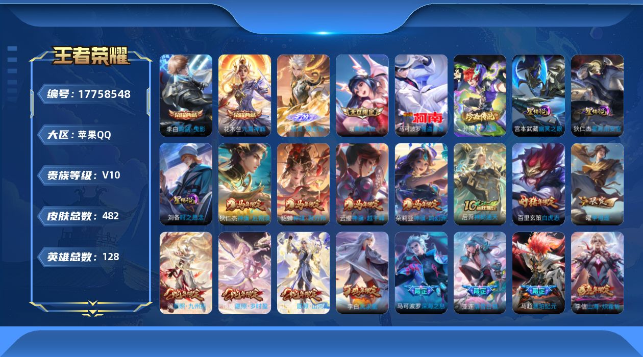 贵族等级:v10皮肤数:482传说品质63 情人节限定4 生肖限定24 荣耀典藏2 珍品传说2 无双2 英雄数:128