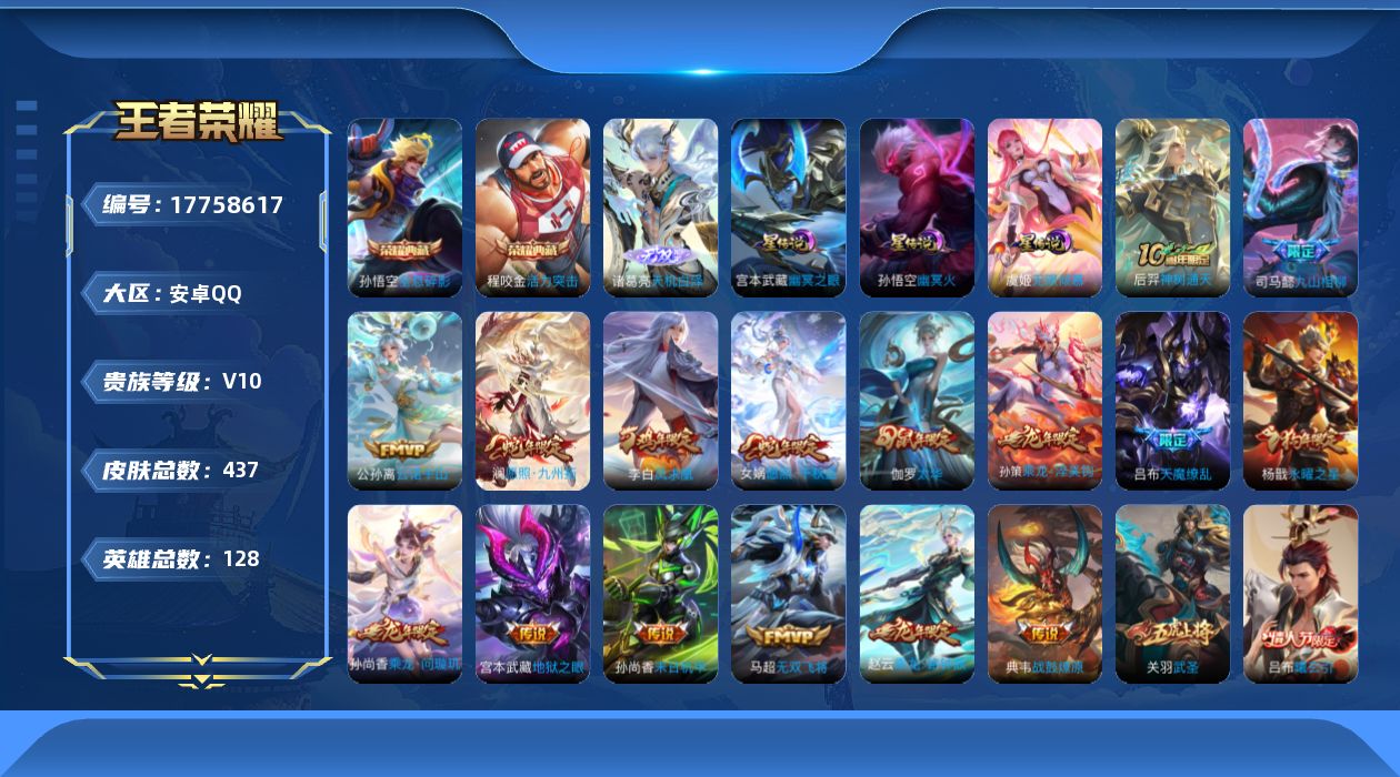 贵族等级:v10皮肤数:437生肖限定20 传说品质46 无双1 情人节限定6 荣耀典藏2 英雄数:128