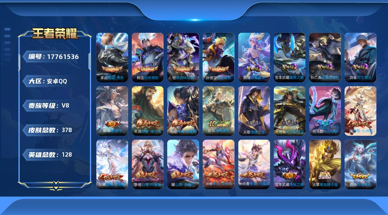 贵族等级:v8皮肤数:378传说品质25 生肖限定12 情人节限定1 荣耀典藏4 英雄数:128