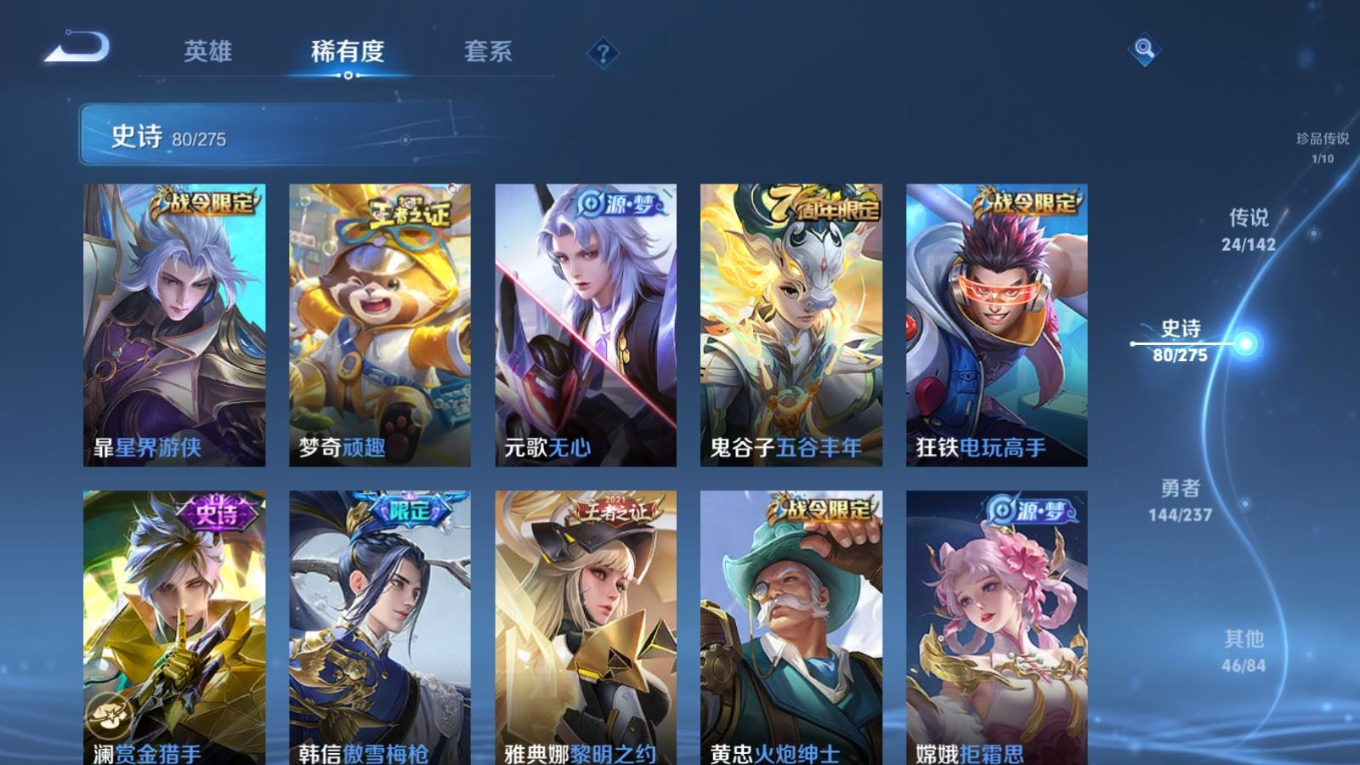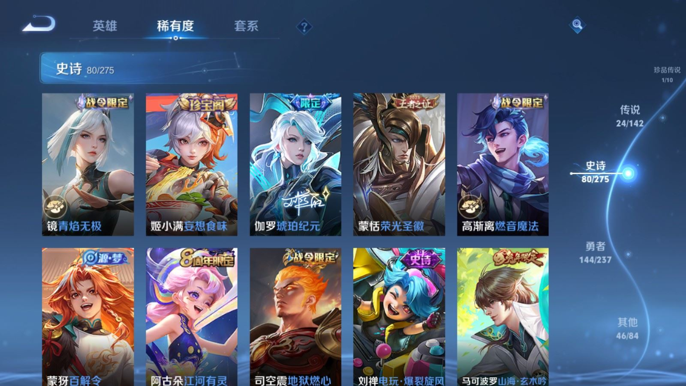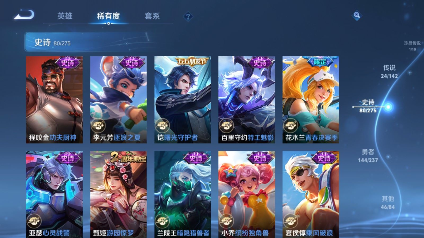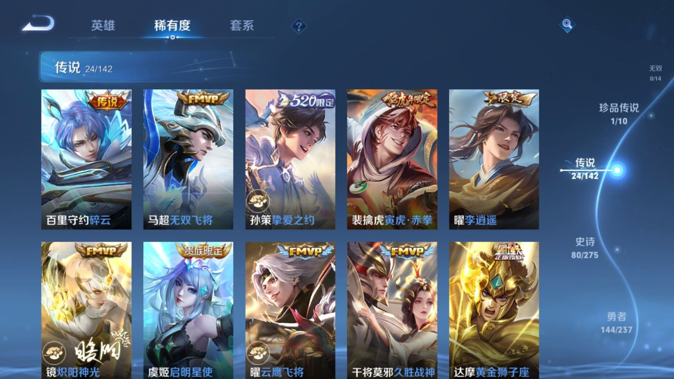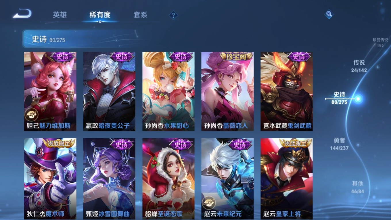贵族等级:v8皮肤数:296传说品质24 生肖限定9 情人节限定4 荣耀典藏1 珍品传说1 英雄数:128