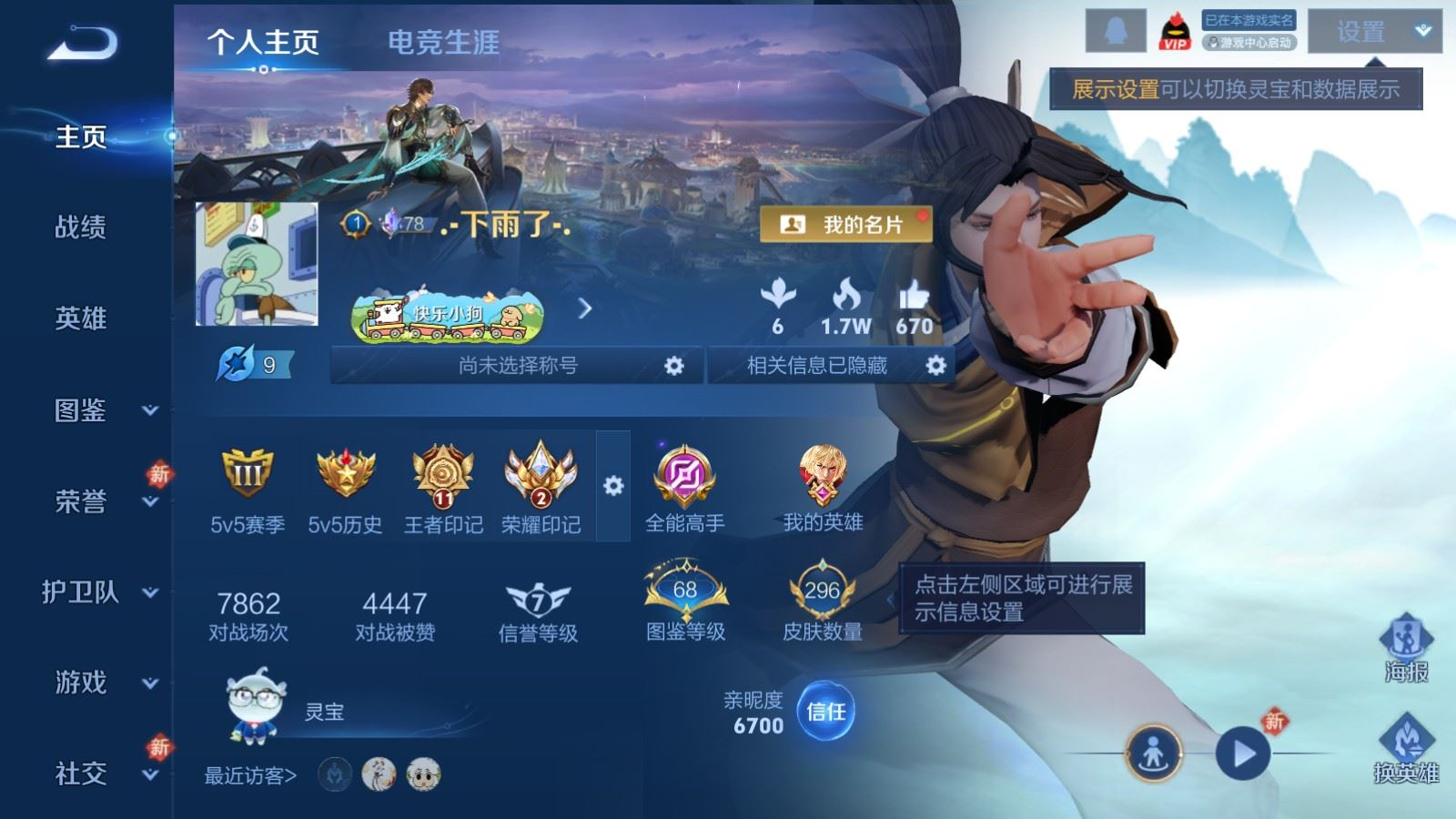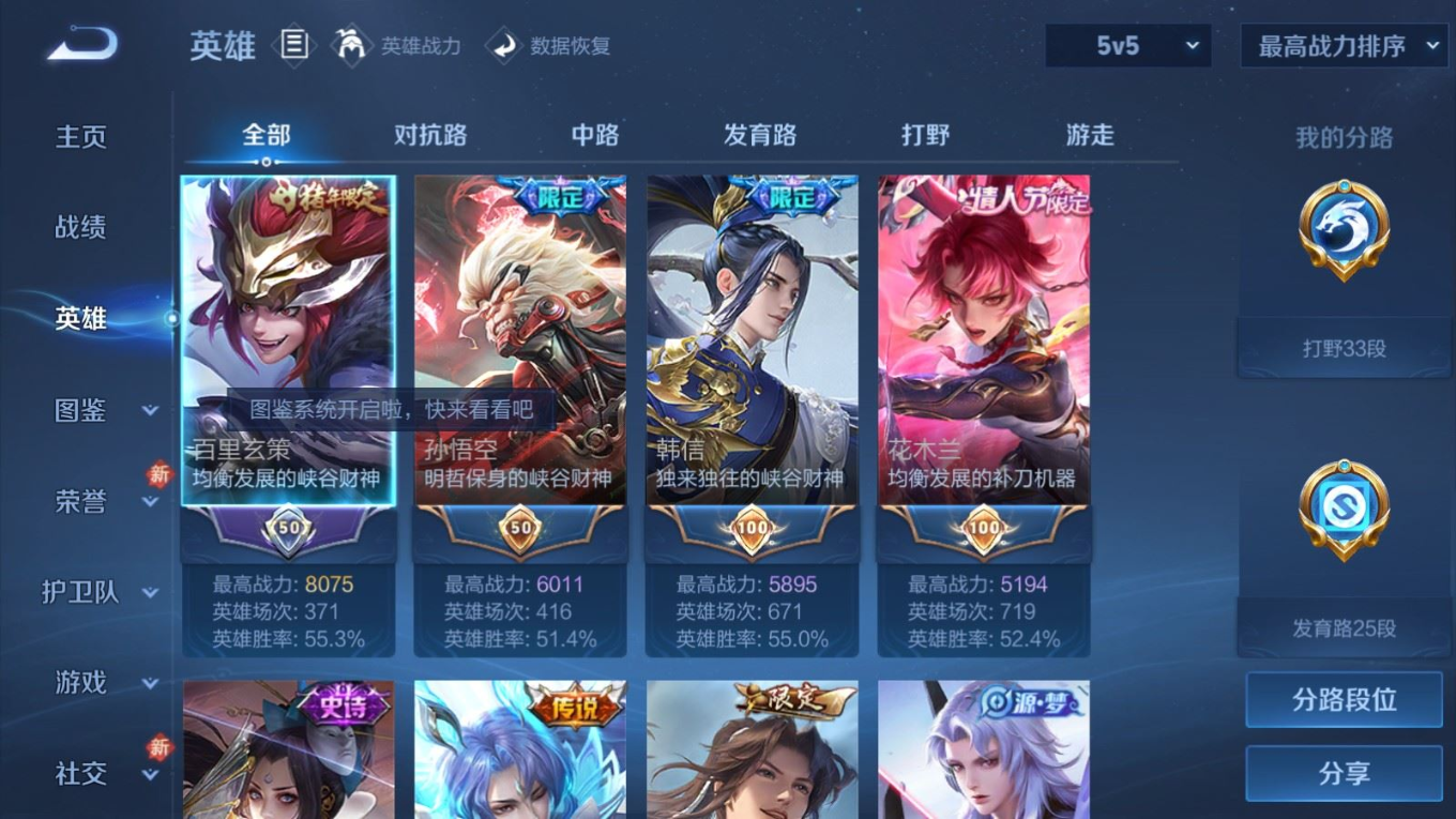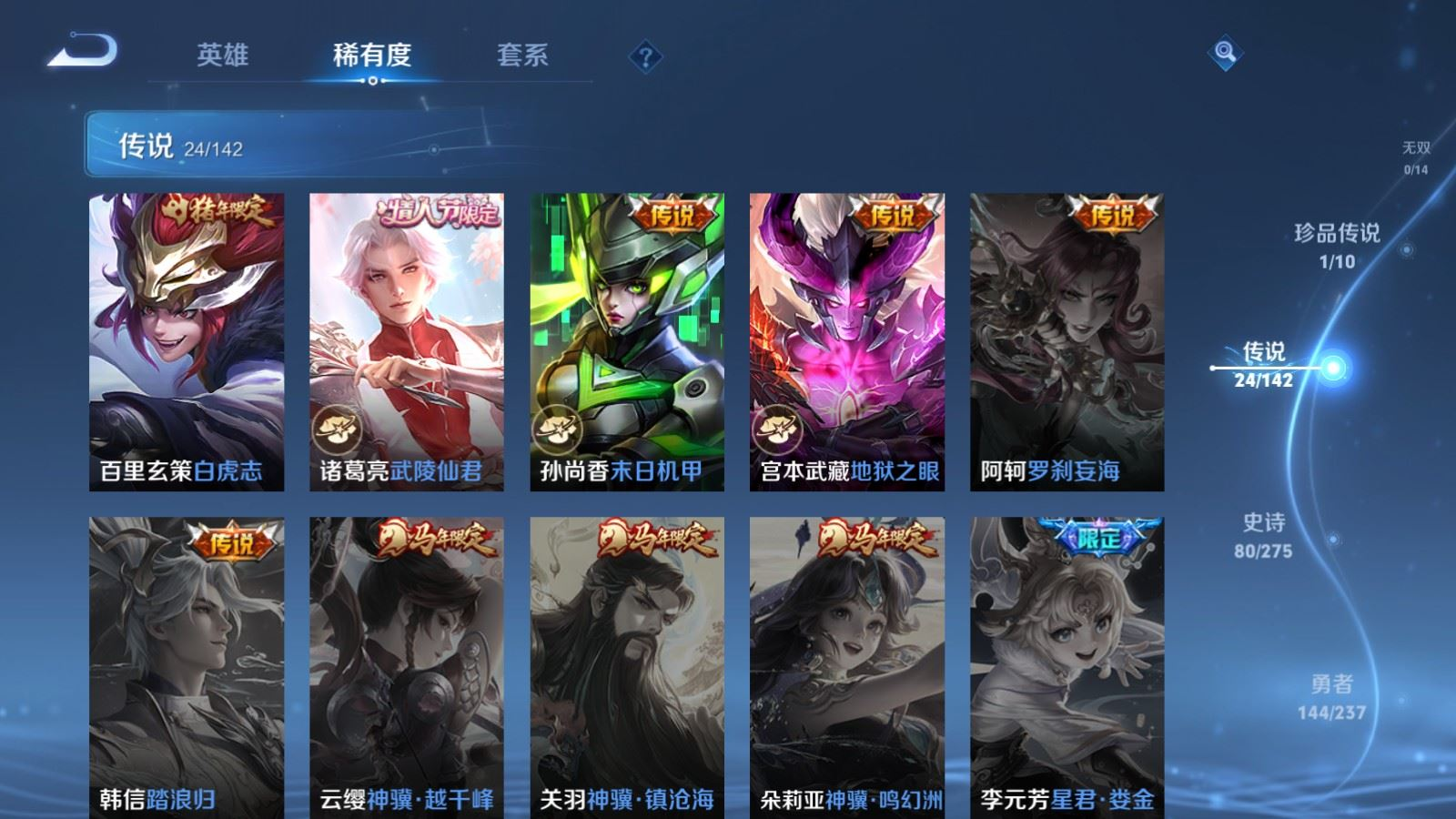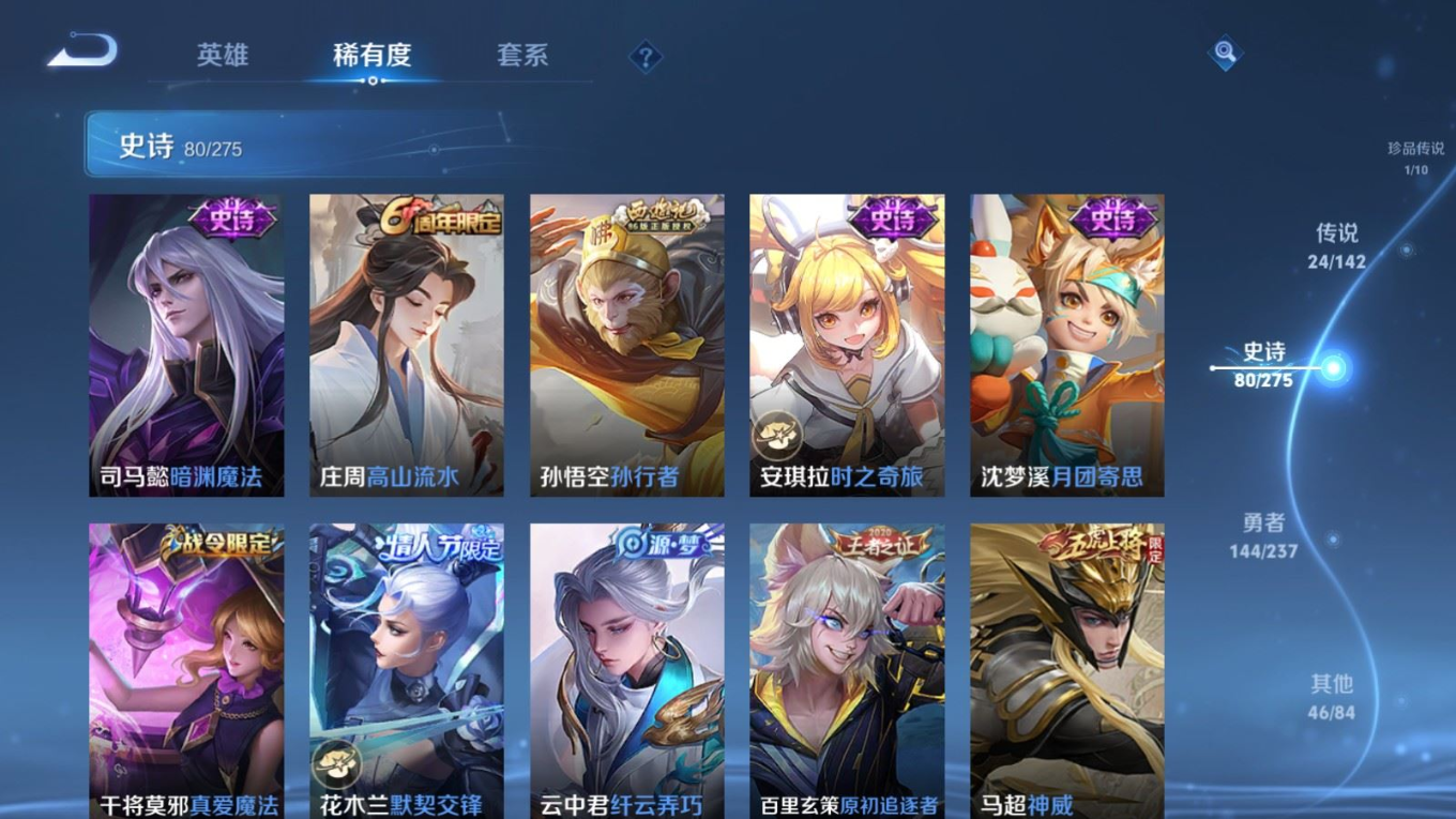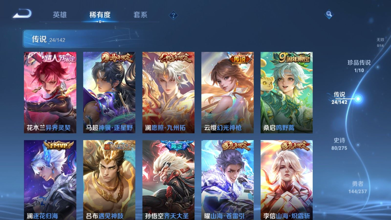 贵族等级:v8皮肤数:296传说品质24 生肖限定9 情人节限定4 荣耀典藏1 珍品传说1 英雄数:128