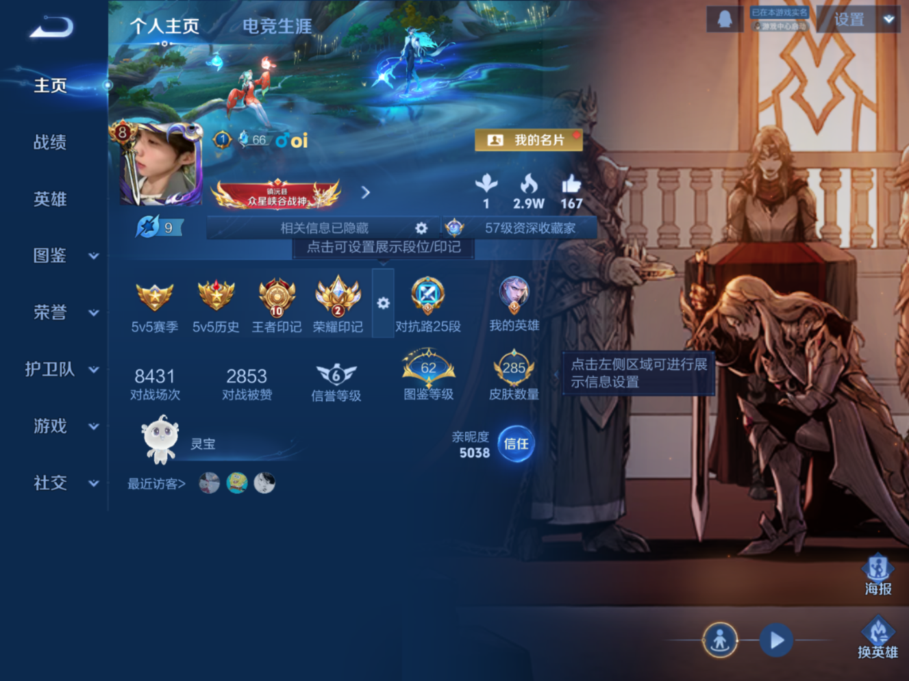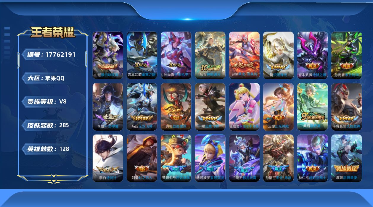 贵族等级:v8皮肤数:285传说品质21 生肖限定2 荣耀典藏1 英雄数:128
