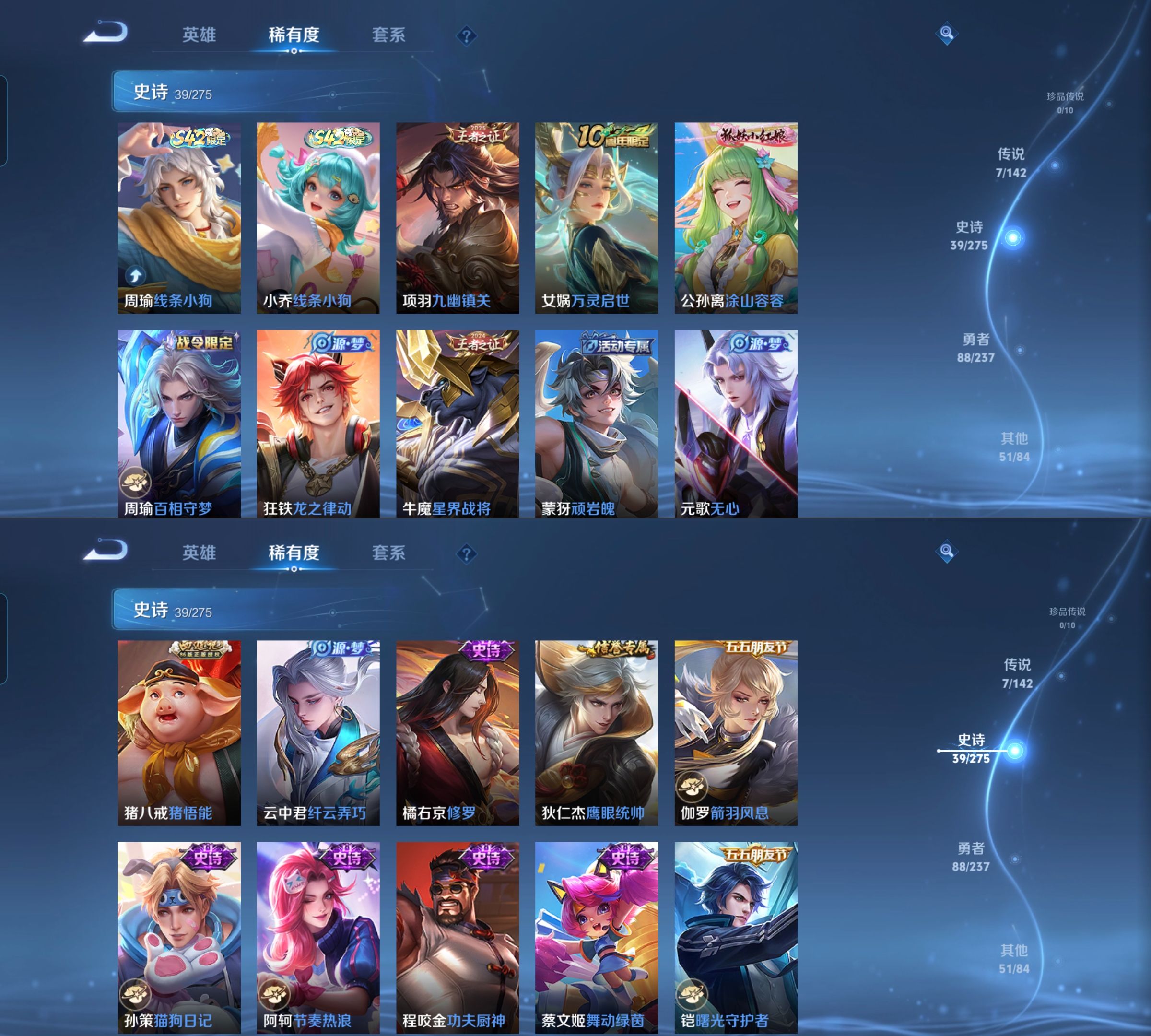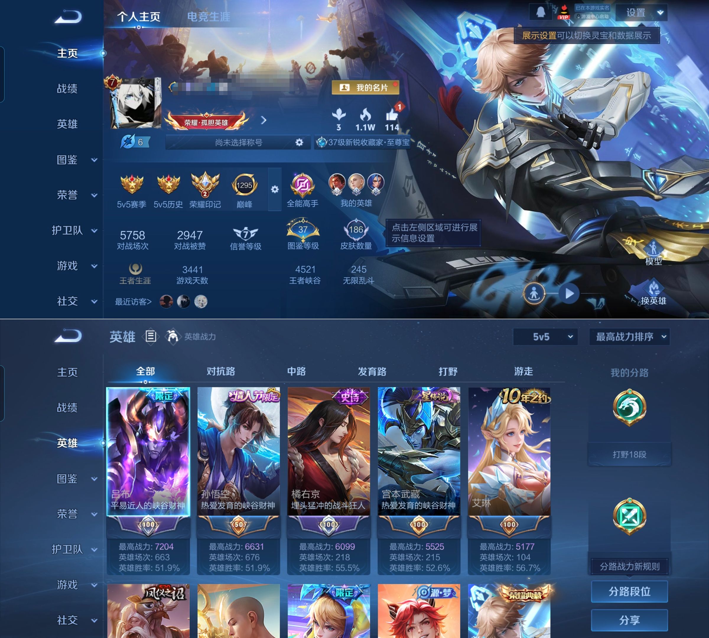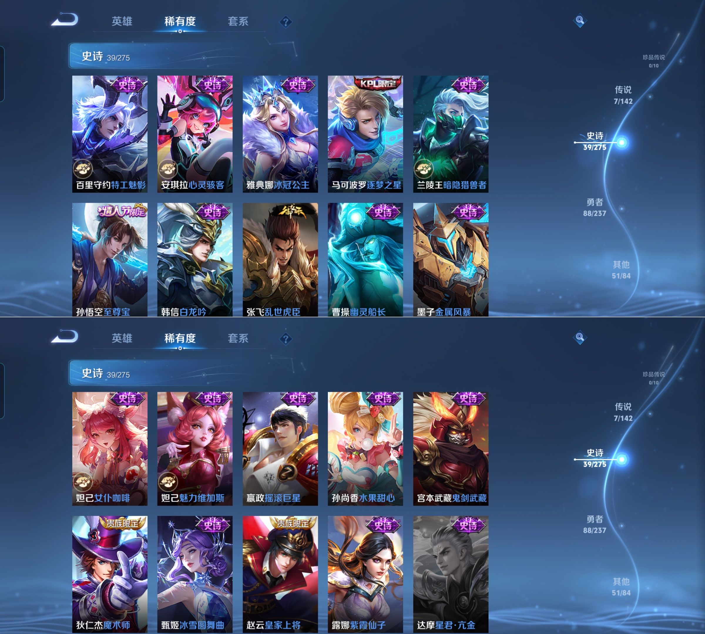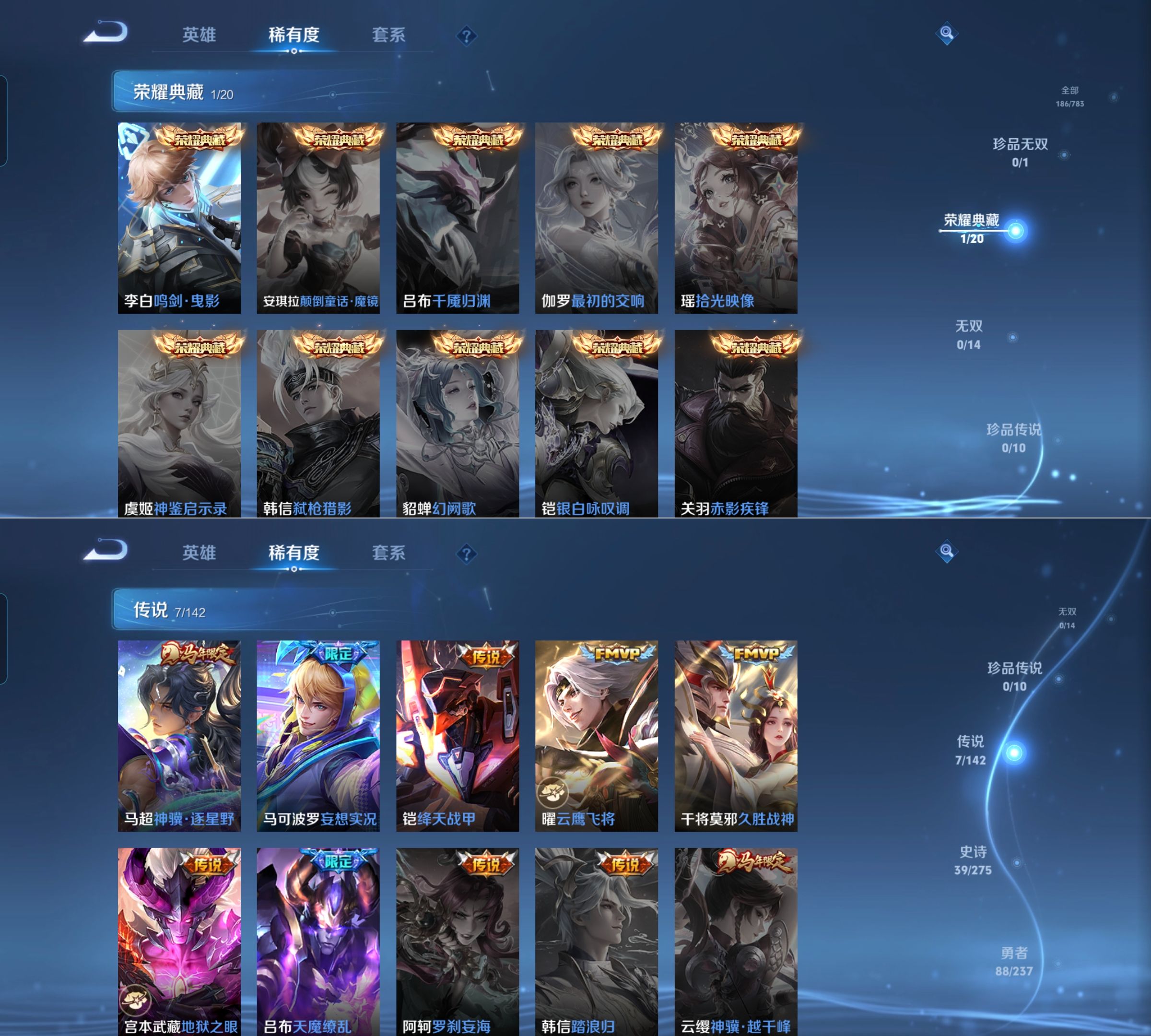 贵族等级:v7皮肤数:186情人节限定1 传说品质7 生肖限定1 荣耀典藏1 英雄数:127