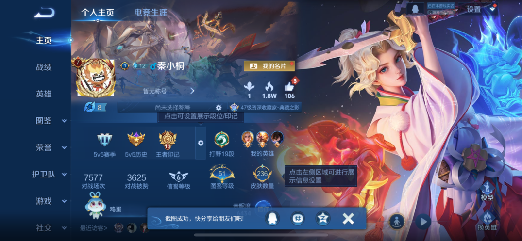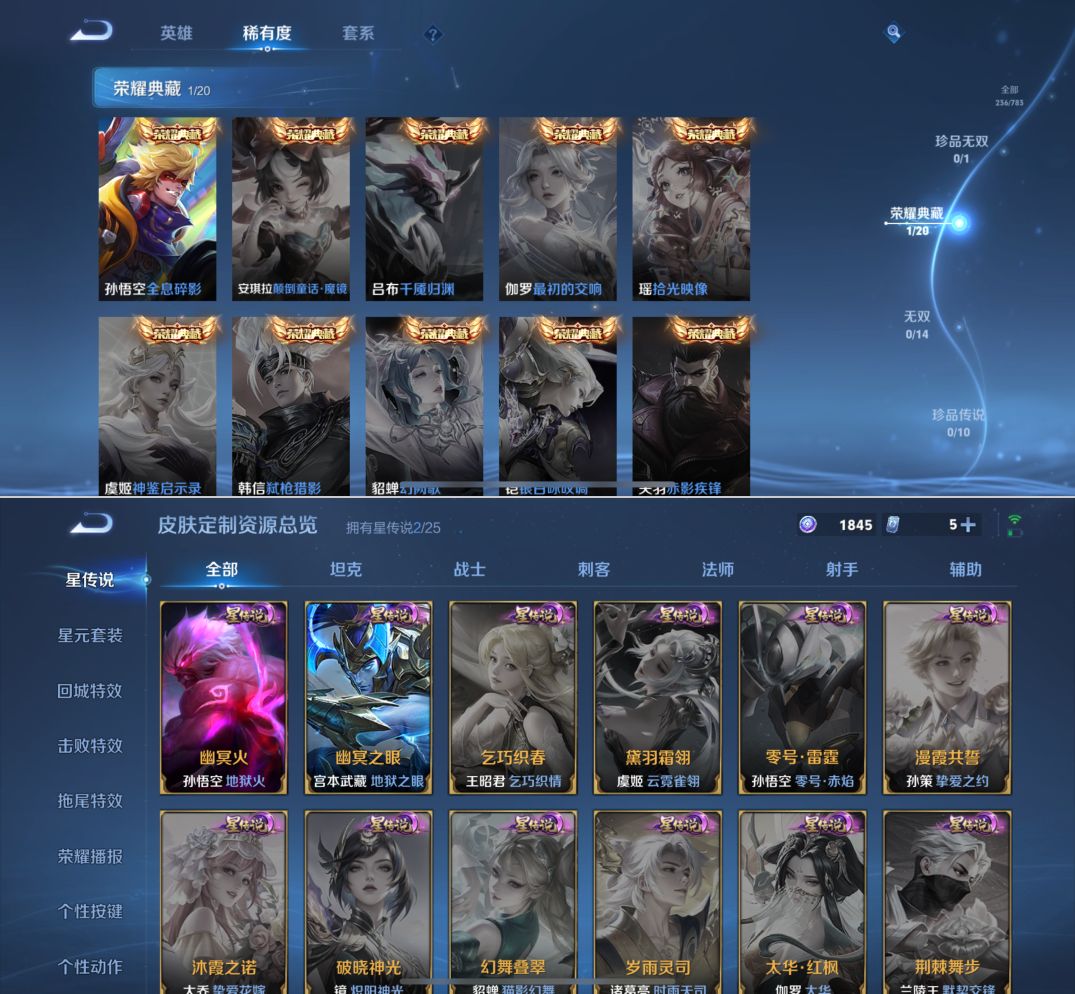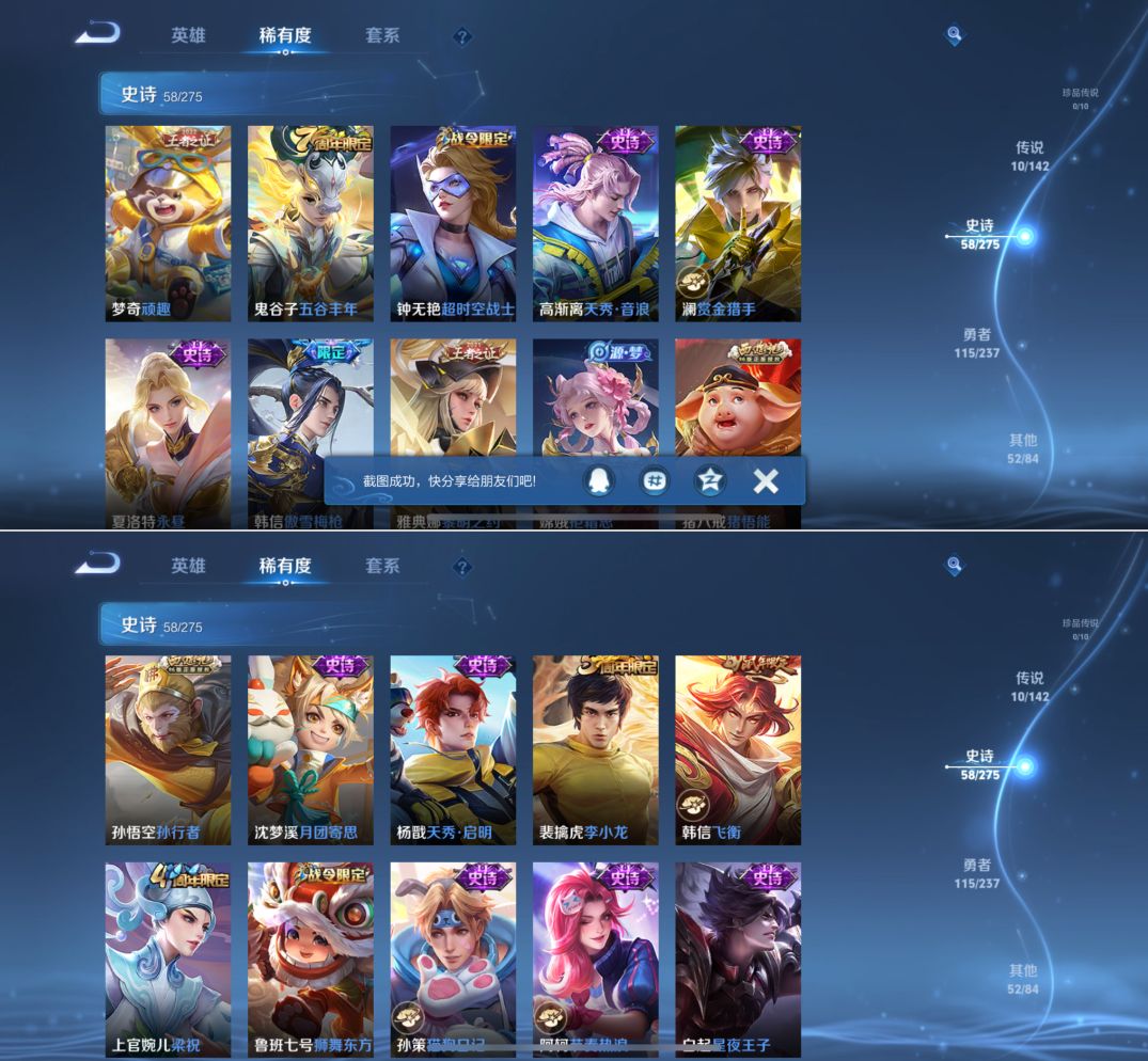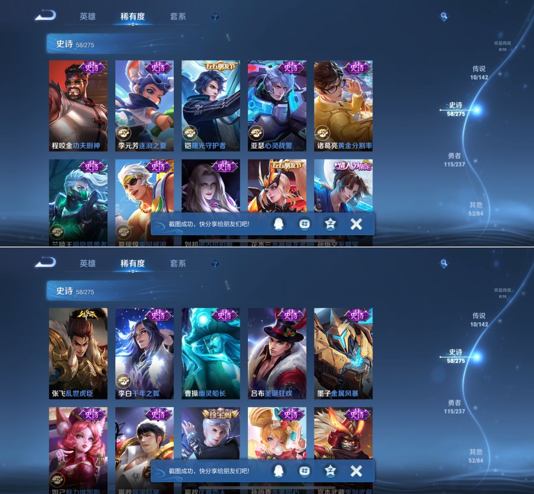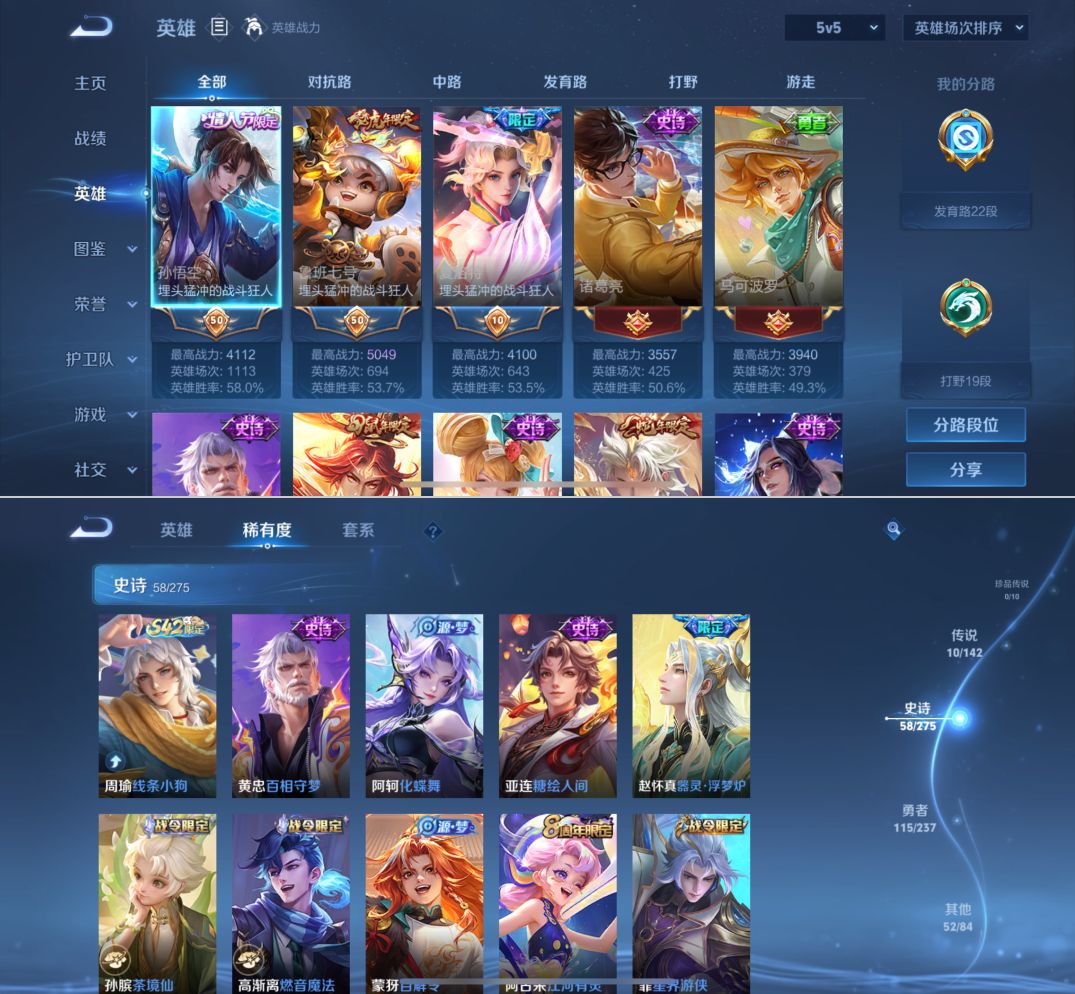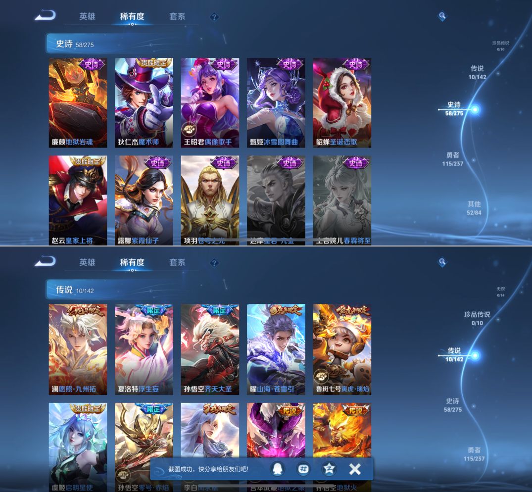 贵族等级:v8皮肤数:237传说品质10 生肖限定5 情人节限定1 荣耀典藏1 英雄数:128