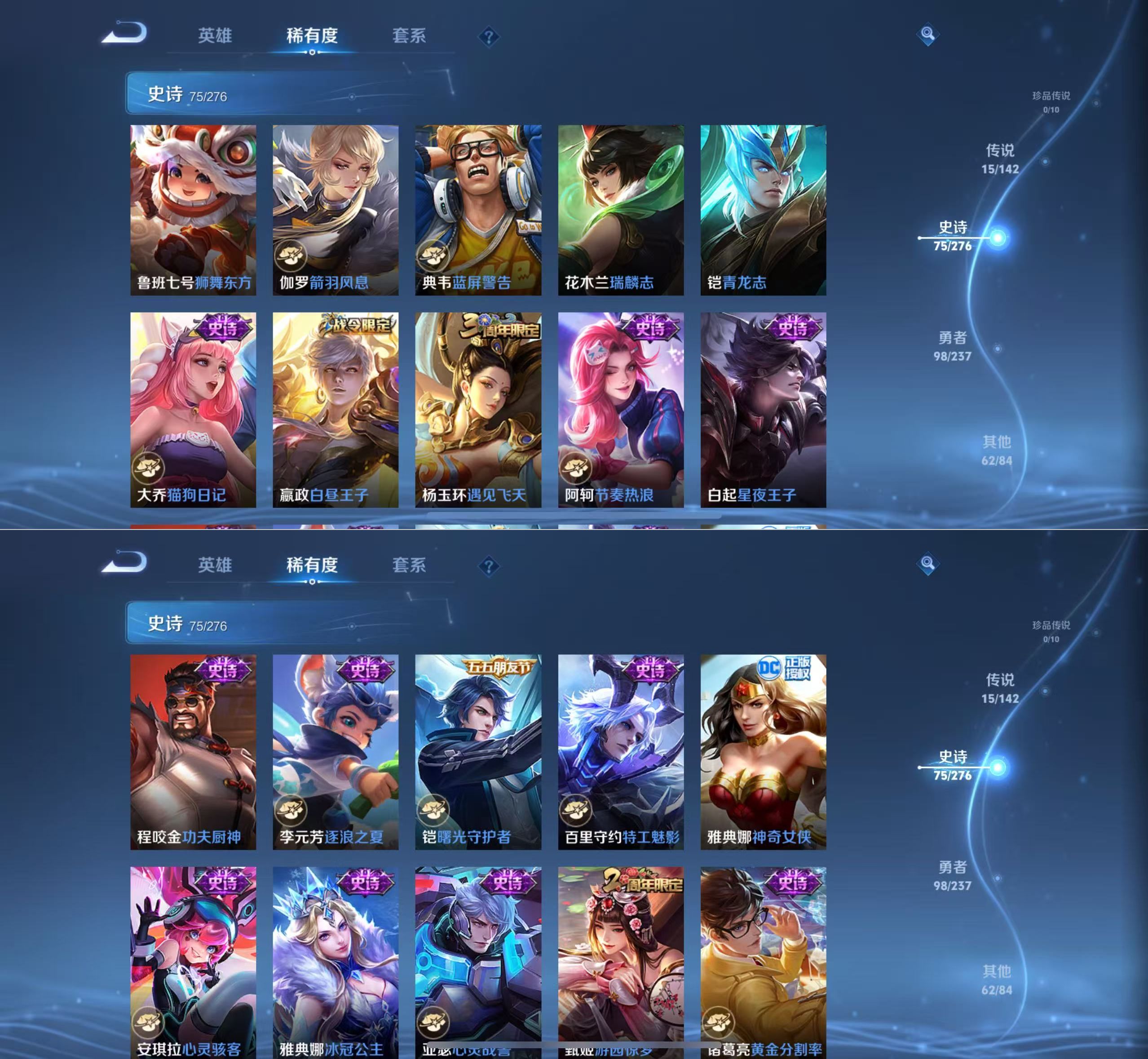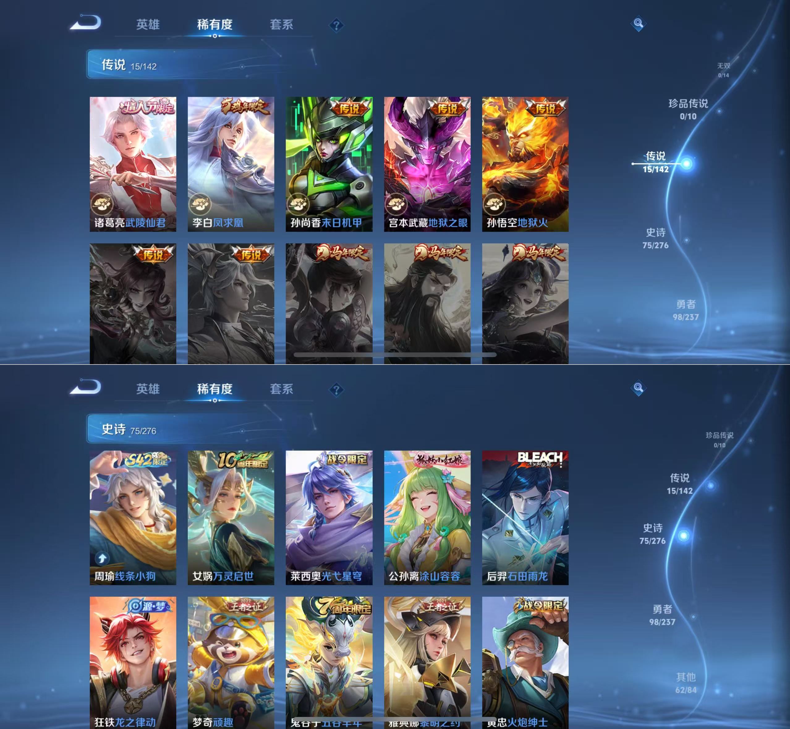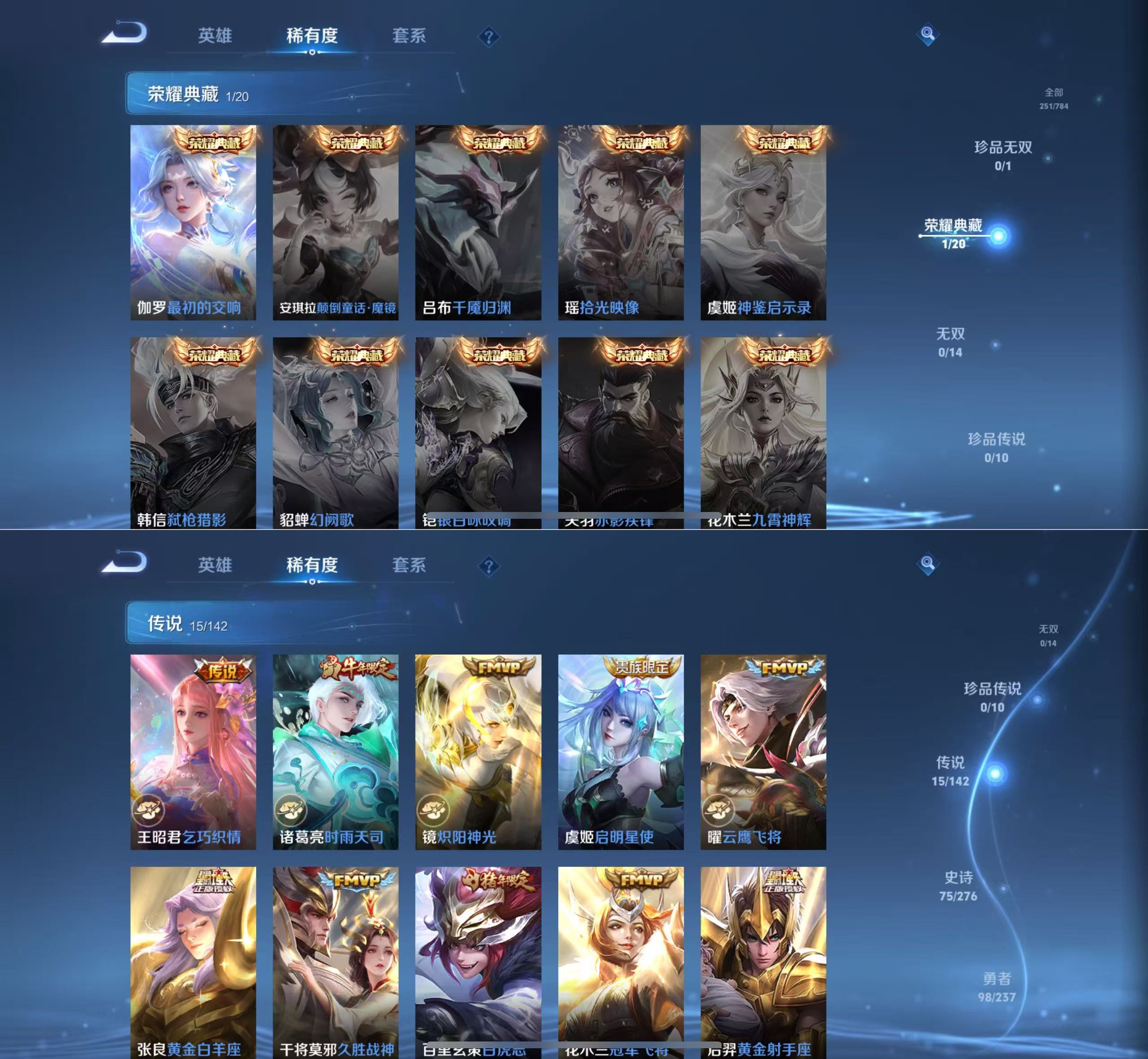 贵族等级:v8皮肤数:251传说品质15 情人节限定2 生肖限定5 荣耀典藏1 英雄数:128