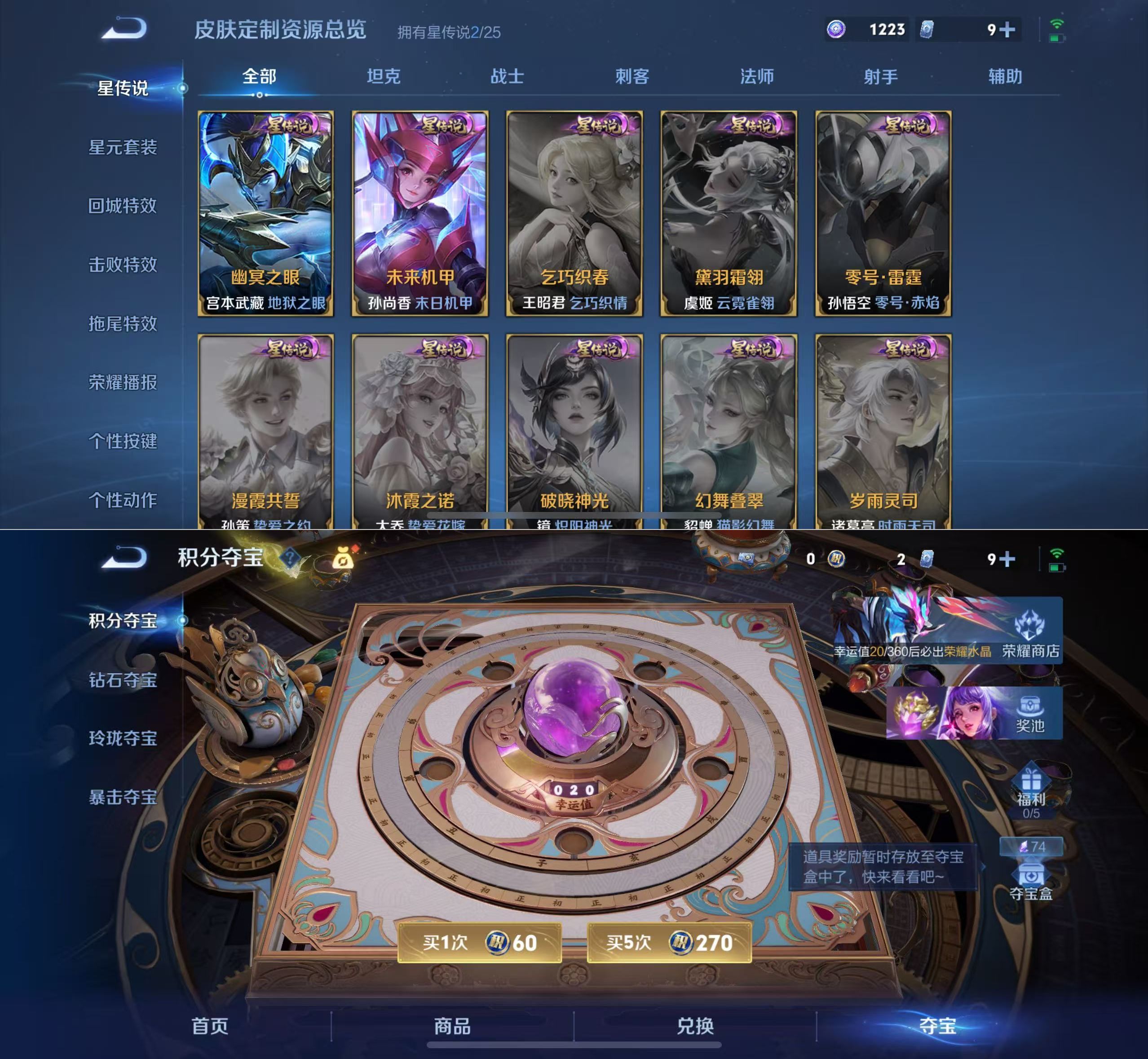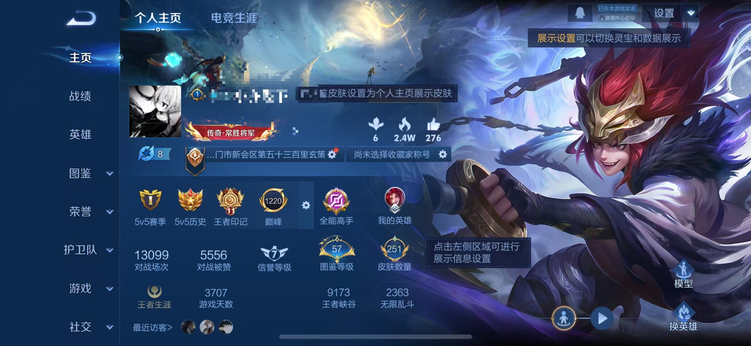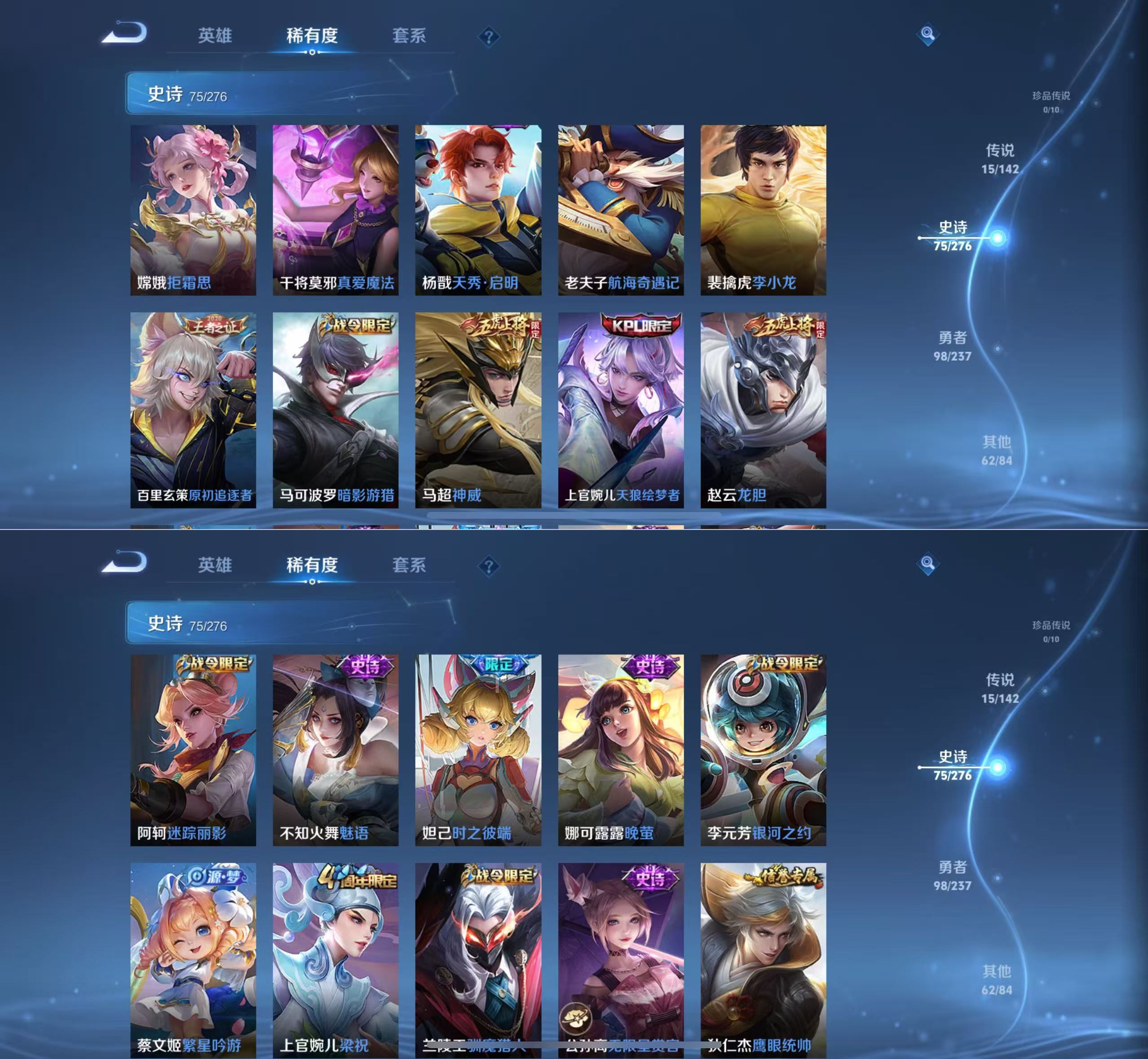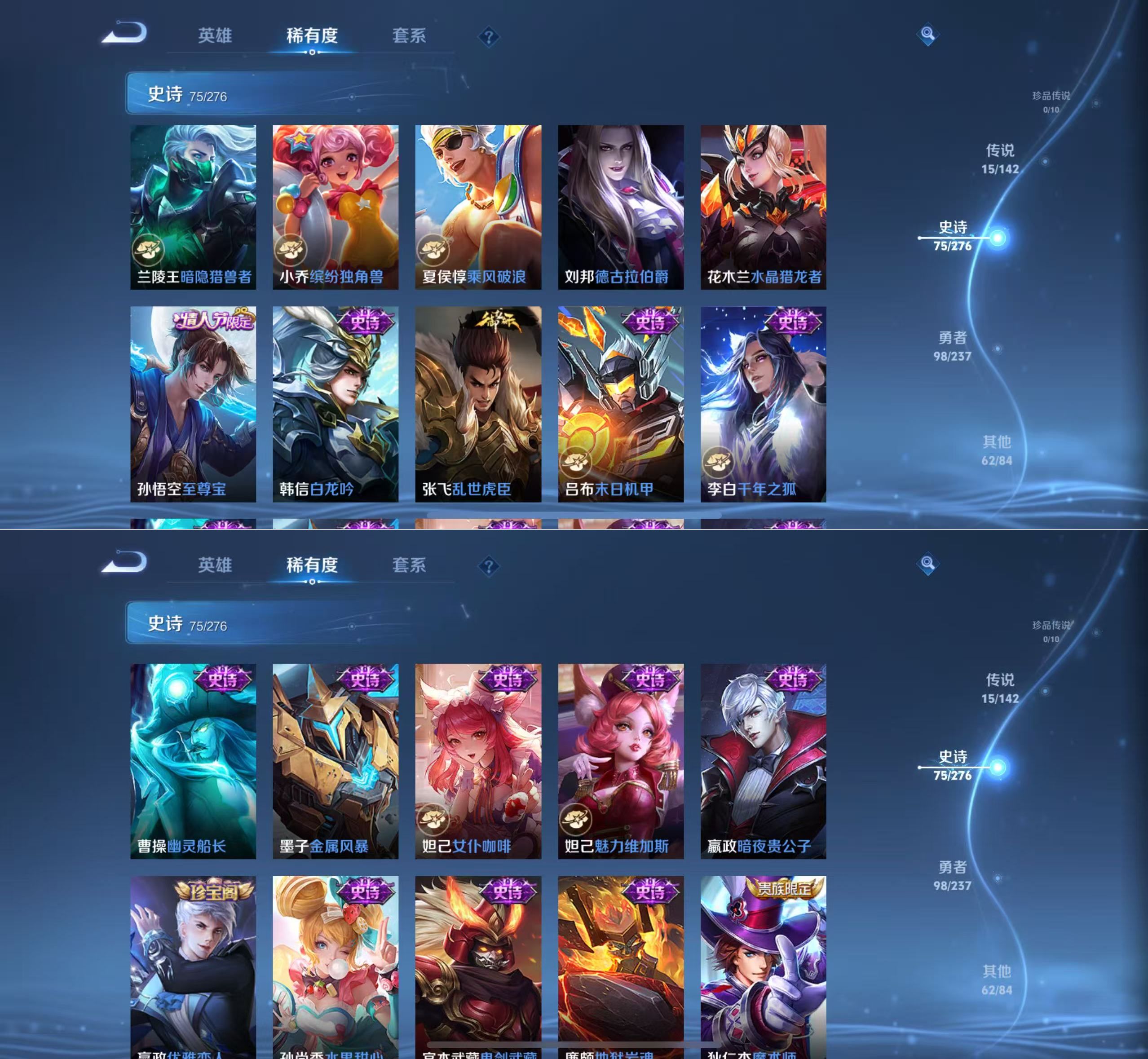 贵族等级:v8皮肤数:251传说品质15 情人节限定2 生肖限定5 荣耀典藏1 英雄数:128