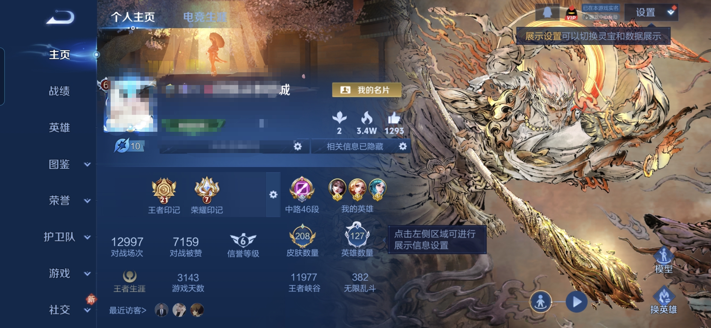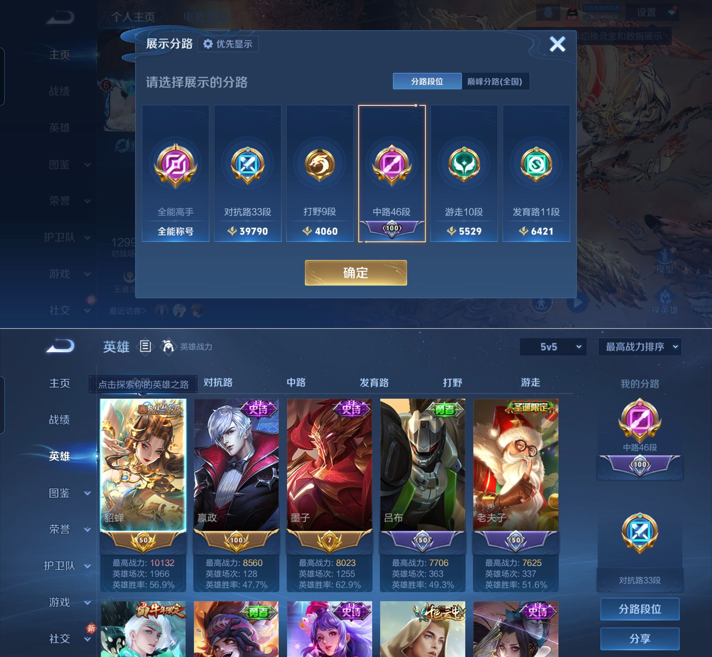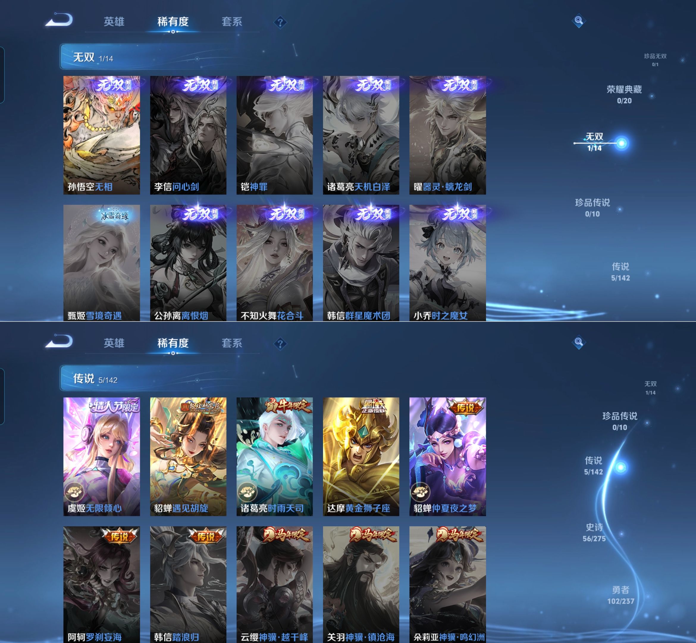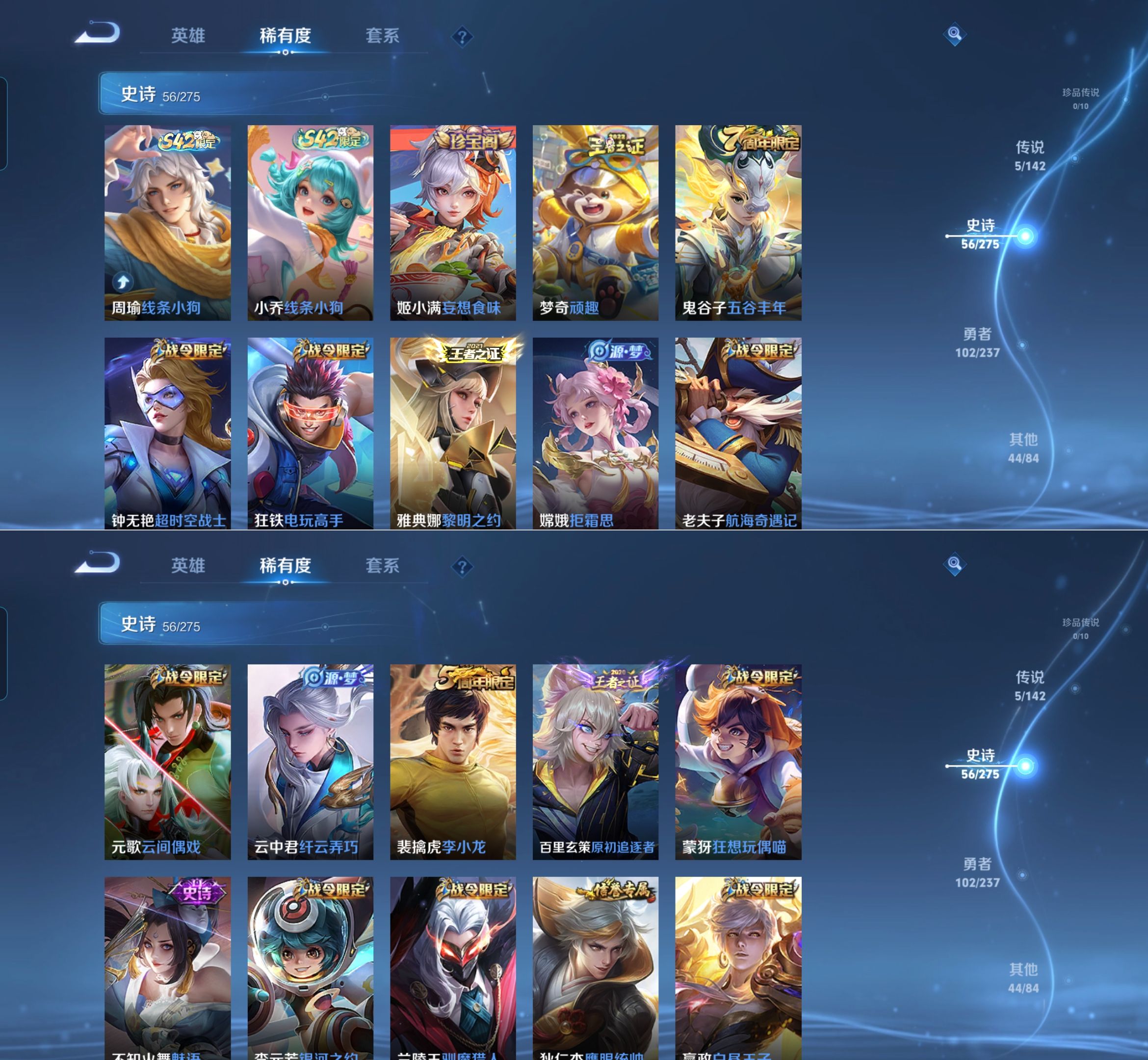 贵族等级:v6皮肤数:208传说品质5 生肖限定1 无双1 情人节限定1 英雄数:127
