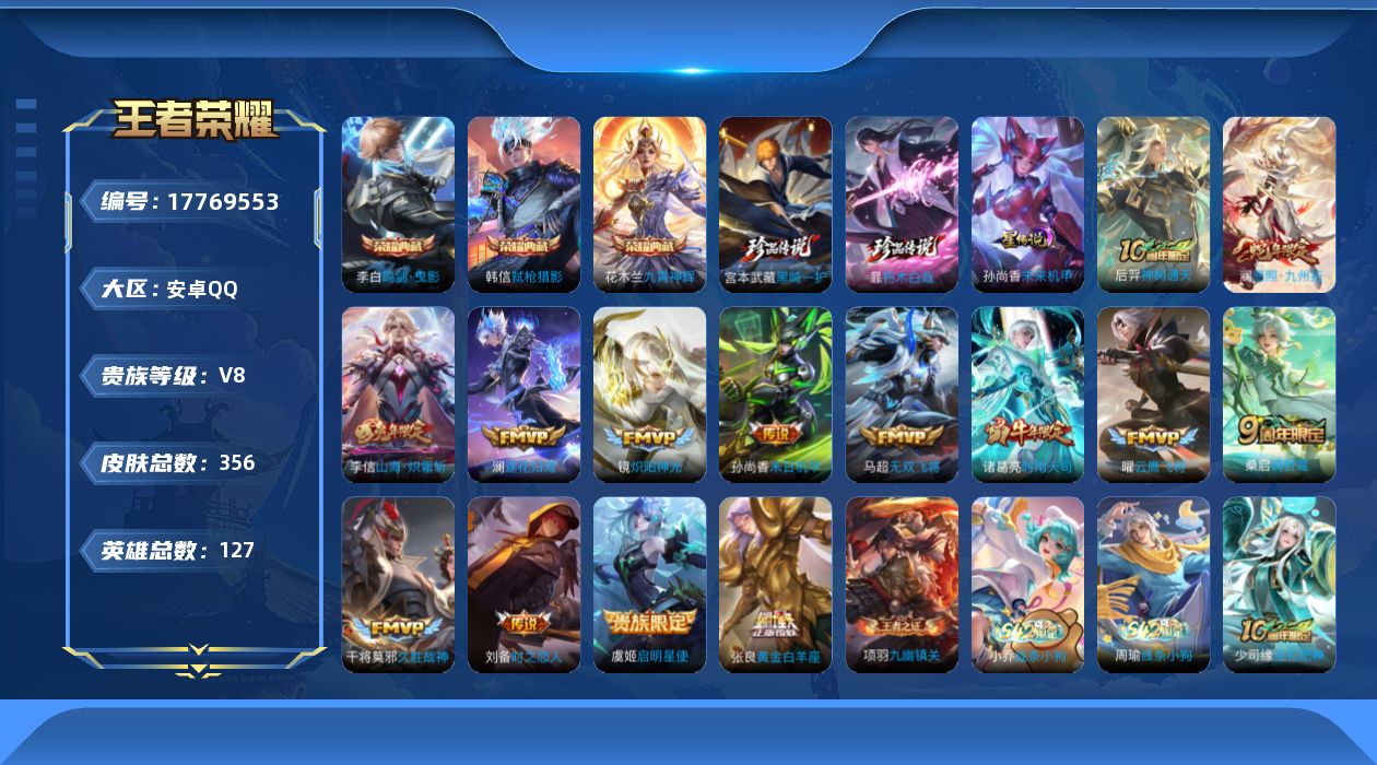 贵族等级:v8皮肤数:356情人节限定2 传说品质14 生肖限定5 珍品传说2 荣耀典藏3 英雄数:127