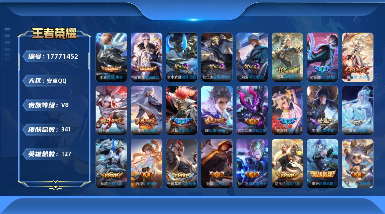 贵族等级:v8皮肤数:341传说品质19 生肖限定5 荣耀典藏2 情人节限定2 英雄数:127