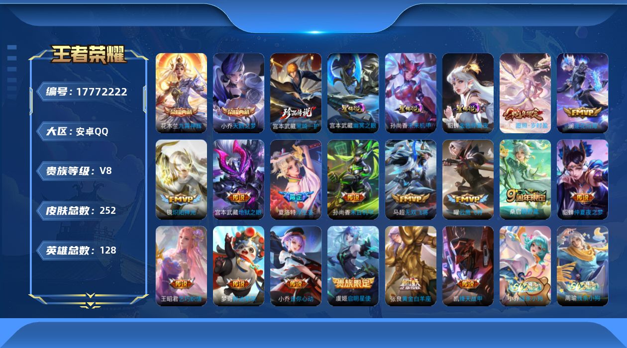 贵族等级:v8皮肤数:252传说品质16 情人节限定1 珍品传说1 荣耀典藏2 生肖限定4 英雄数:128