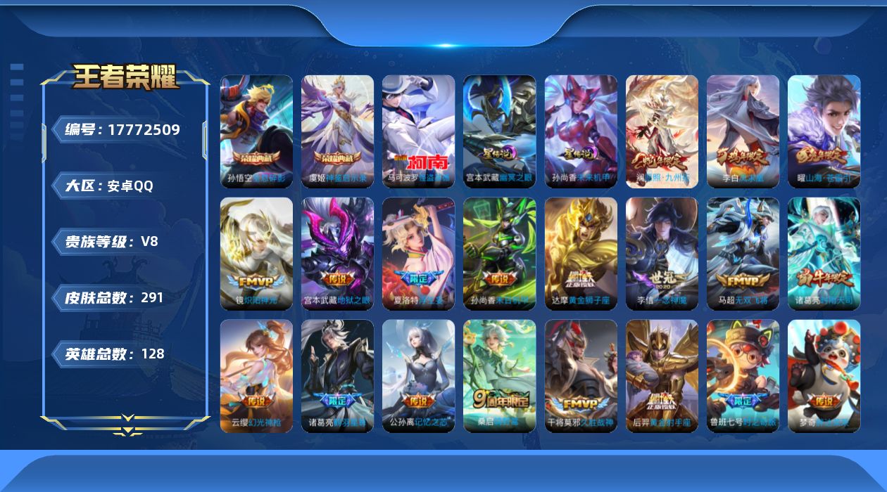 贵族等级:v8皮肤数:291传说品质21 生肖限定6 情人节限定2 荣耀典藏2 珍品传说1 英雄数:128