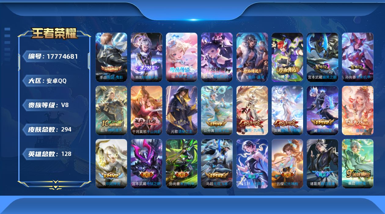 贵族等级:v8皮肤数:294传说品质20 生肖限定2 情人节限定2 珍品传说4 荣耀典藏1 无双1 英雄数:128
