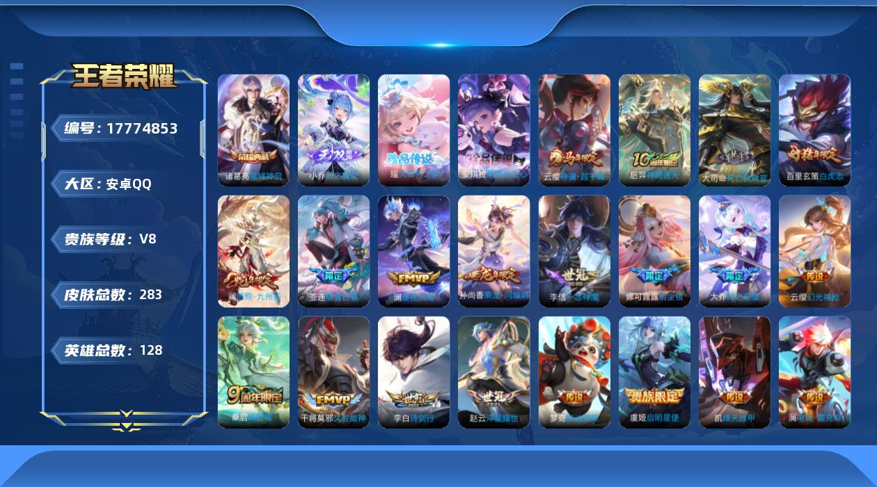 贵族等级:v8皮肤数:283传说品质20 生肖限定6 荣耀典藏1 无双1 珍品传说2 英雄数:128