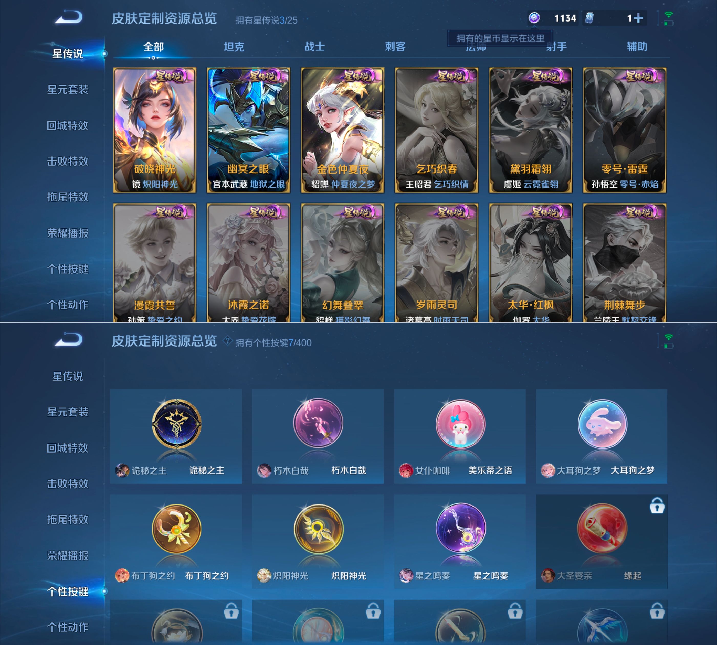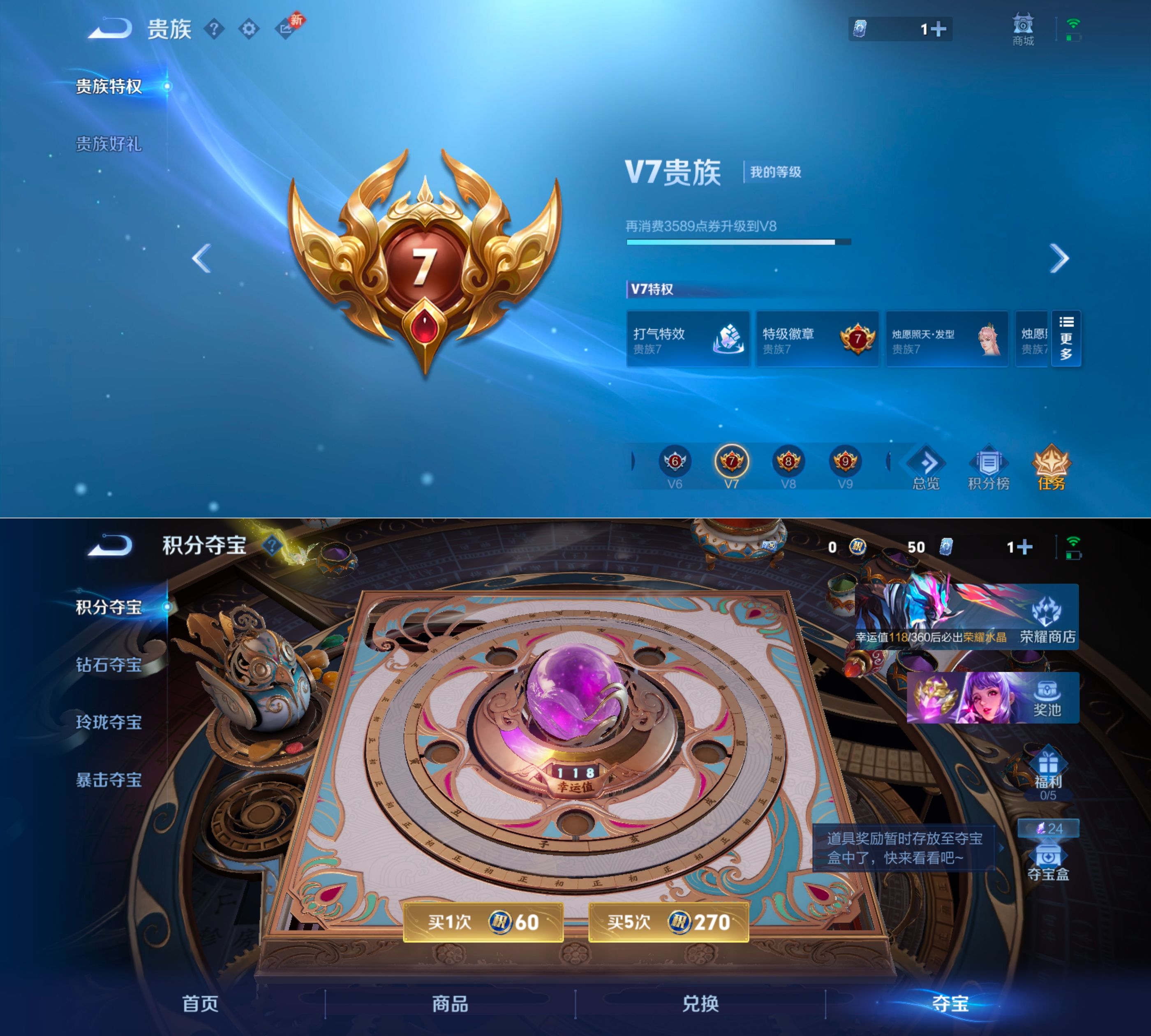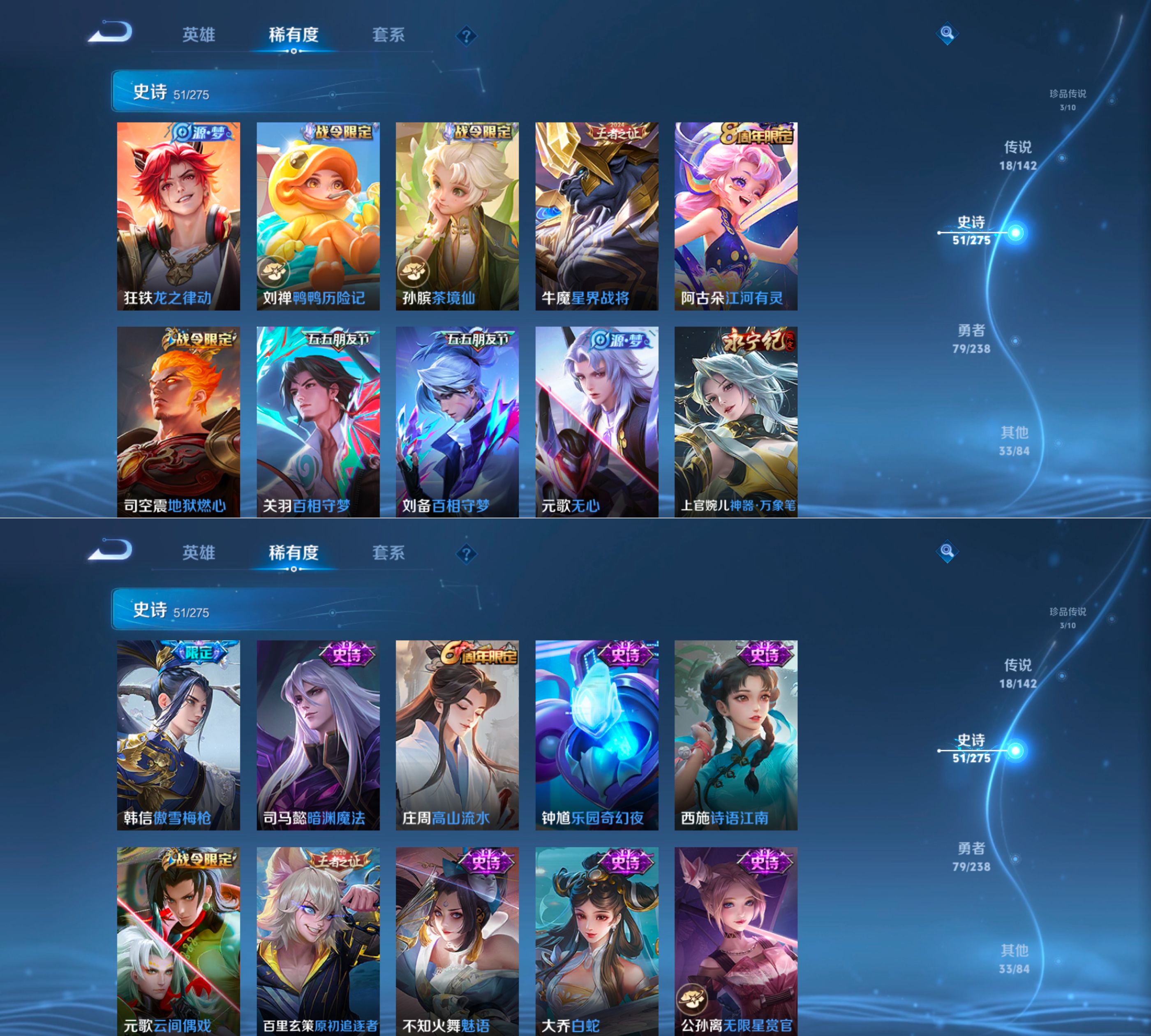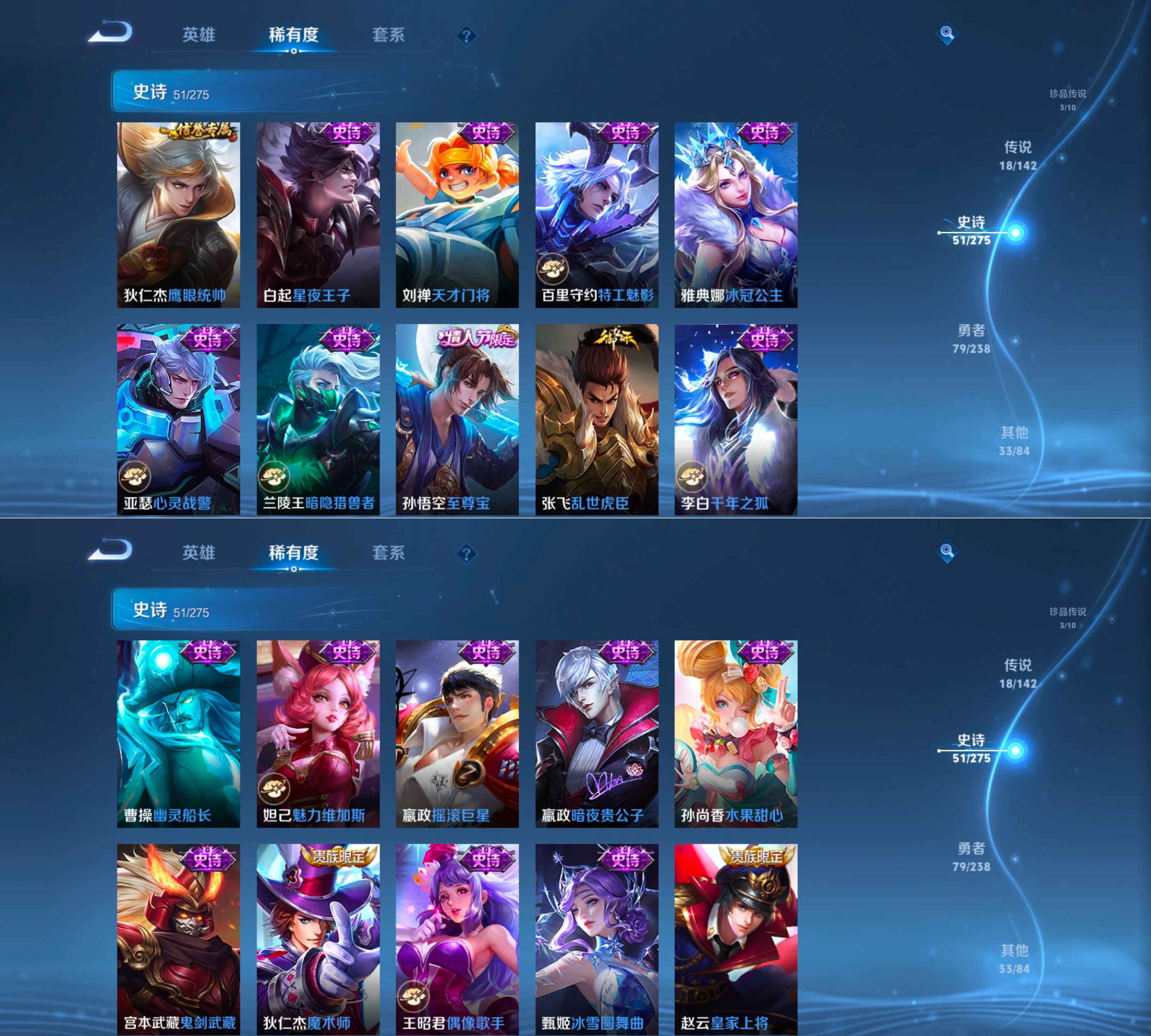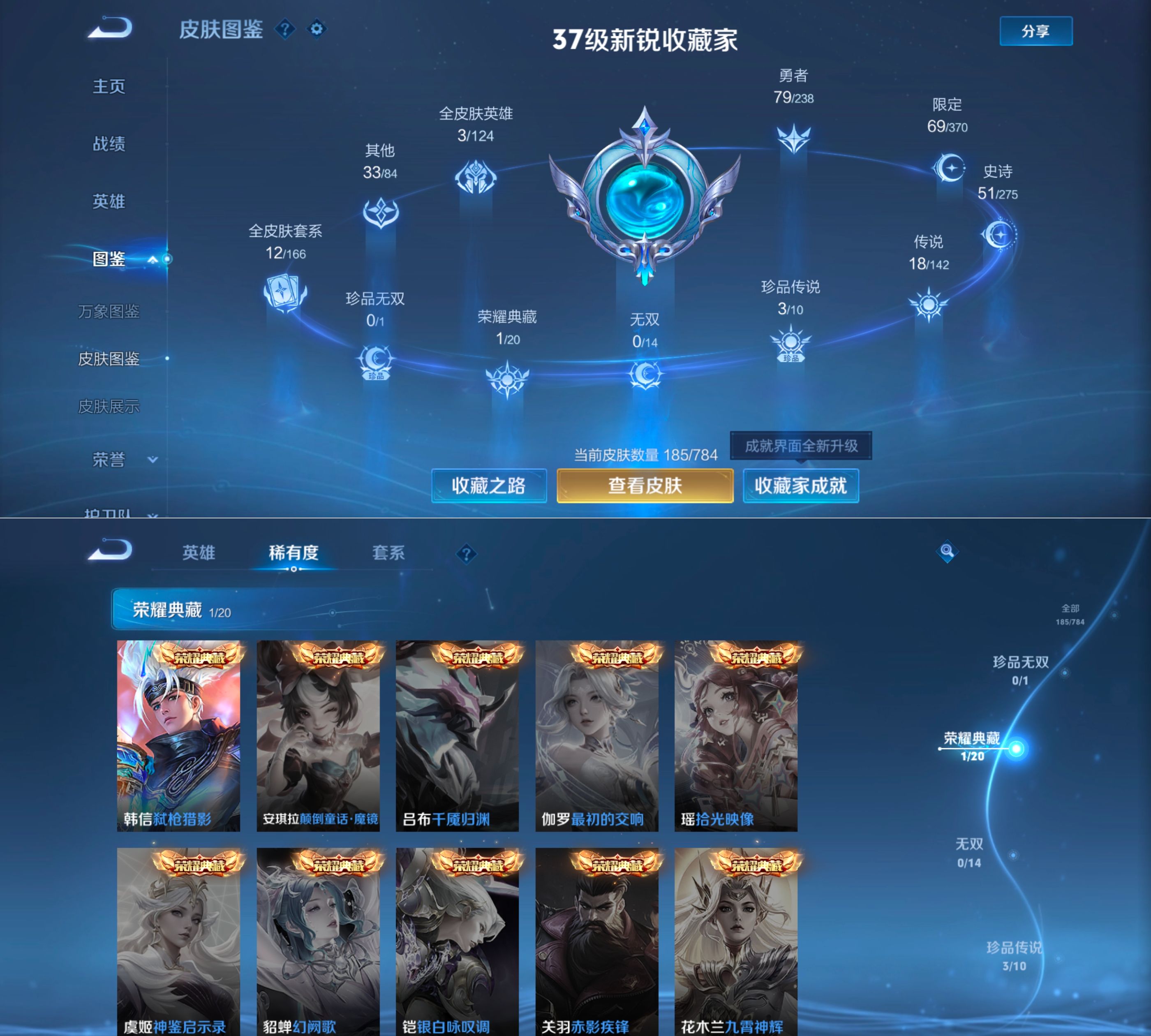贵族等级:v7皮肤数:185传说品质18 生肖限定2 情人节限定1 珍品传说3 荣耀典藏1 英雄数:125