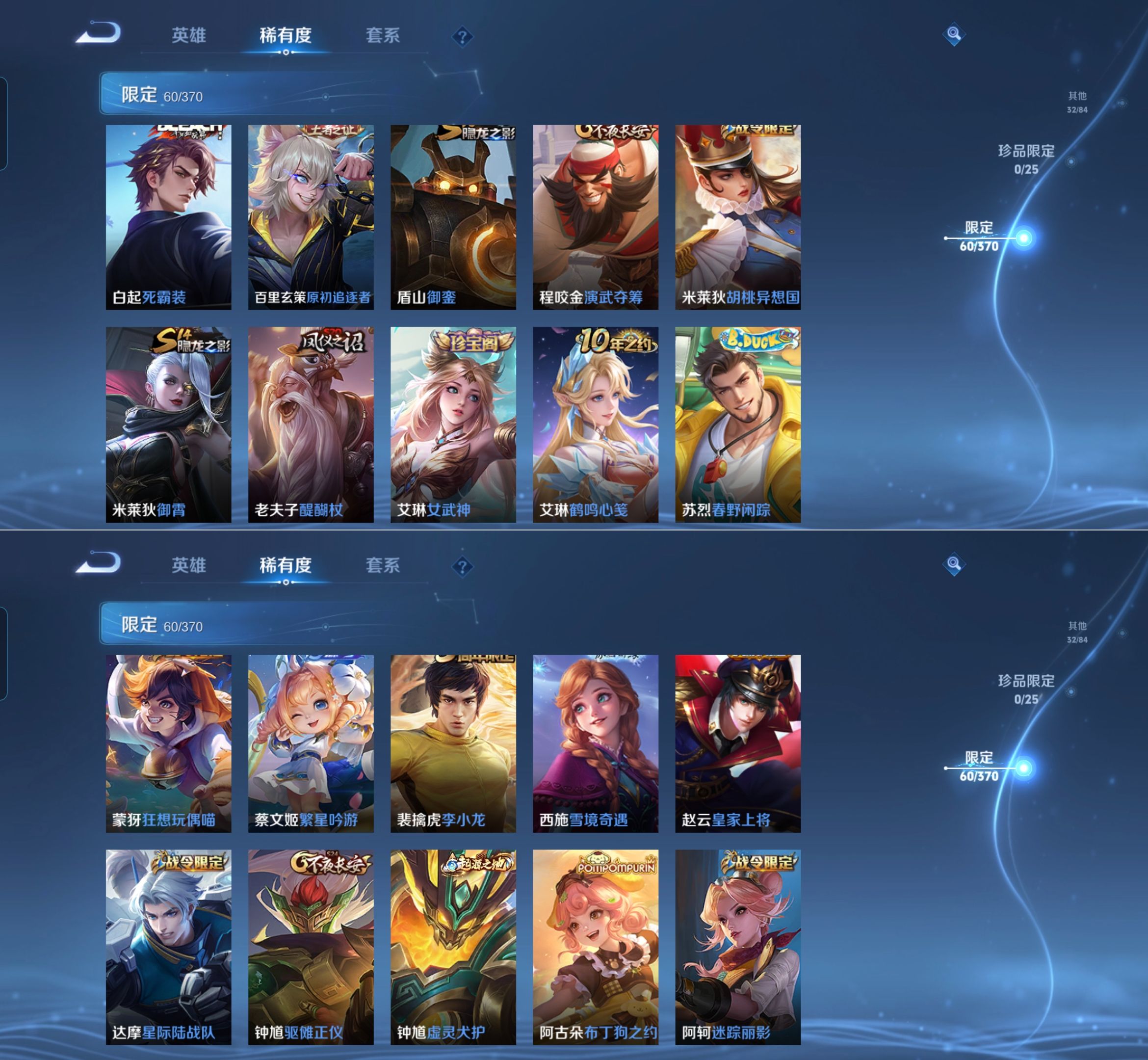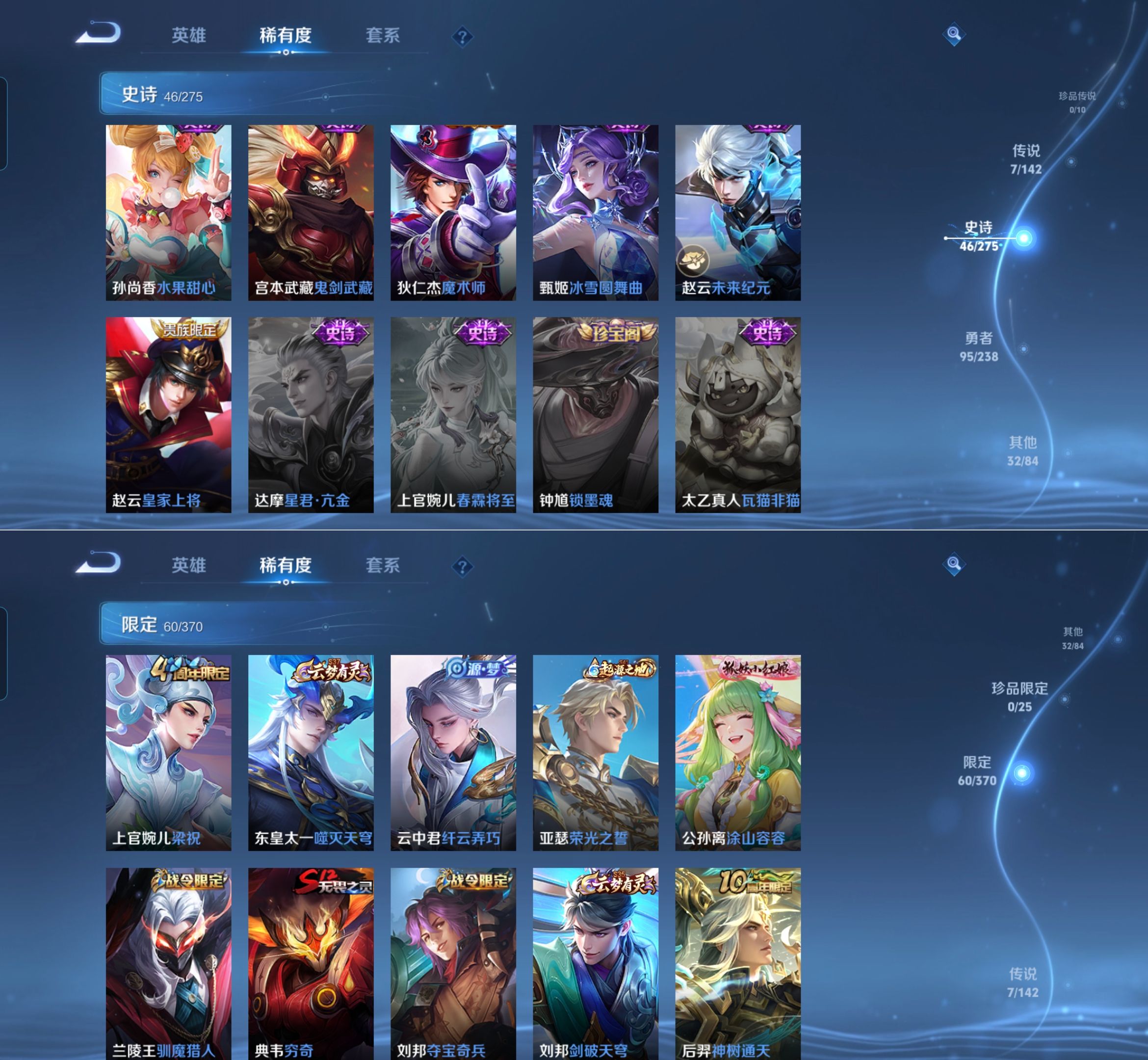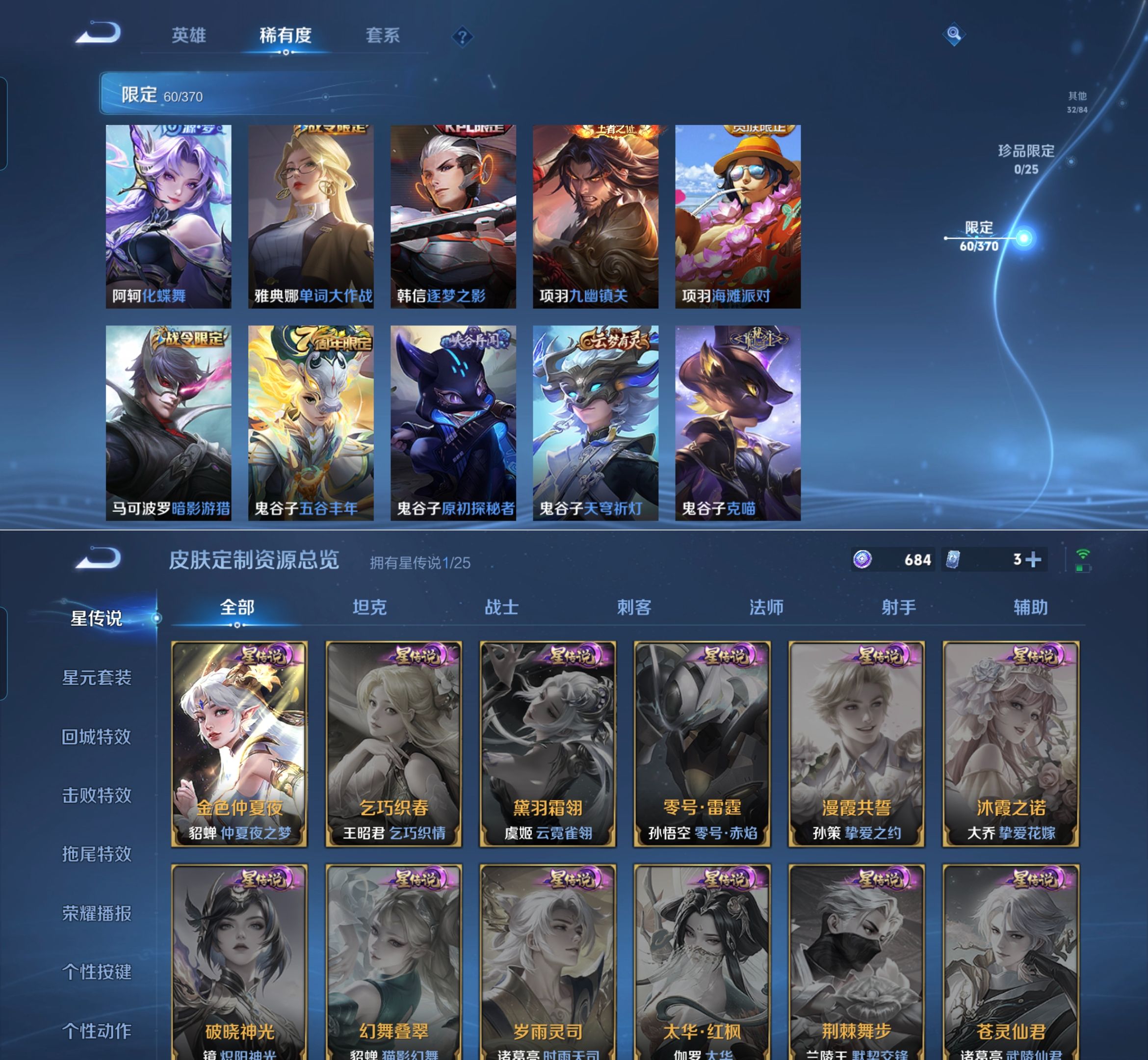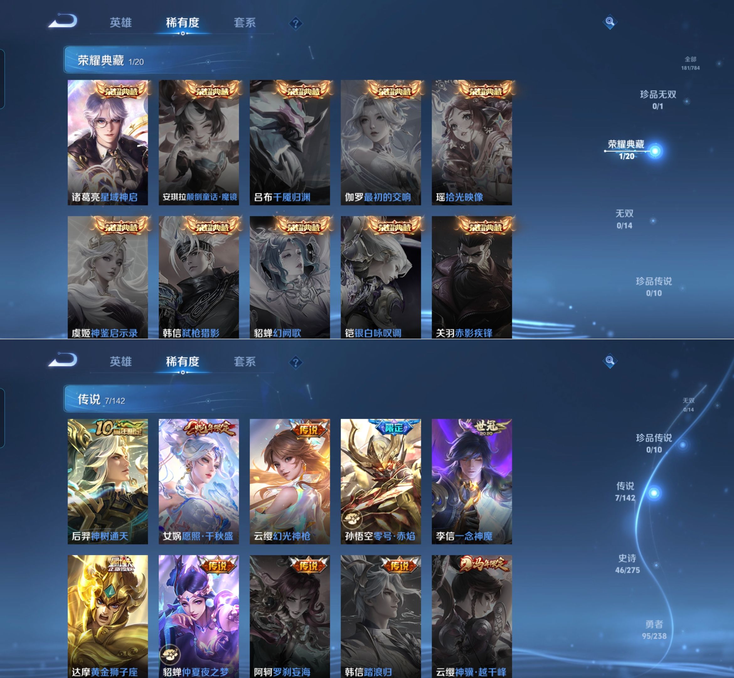 贵族等级:v6皮肤数:181传说品质7 荣耀典藏1 情人节限定1 生肖限定1 英雄数:127