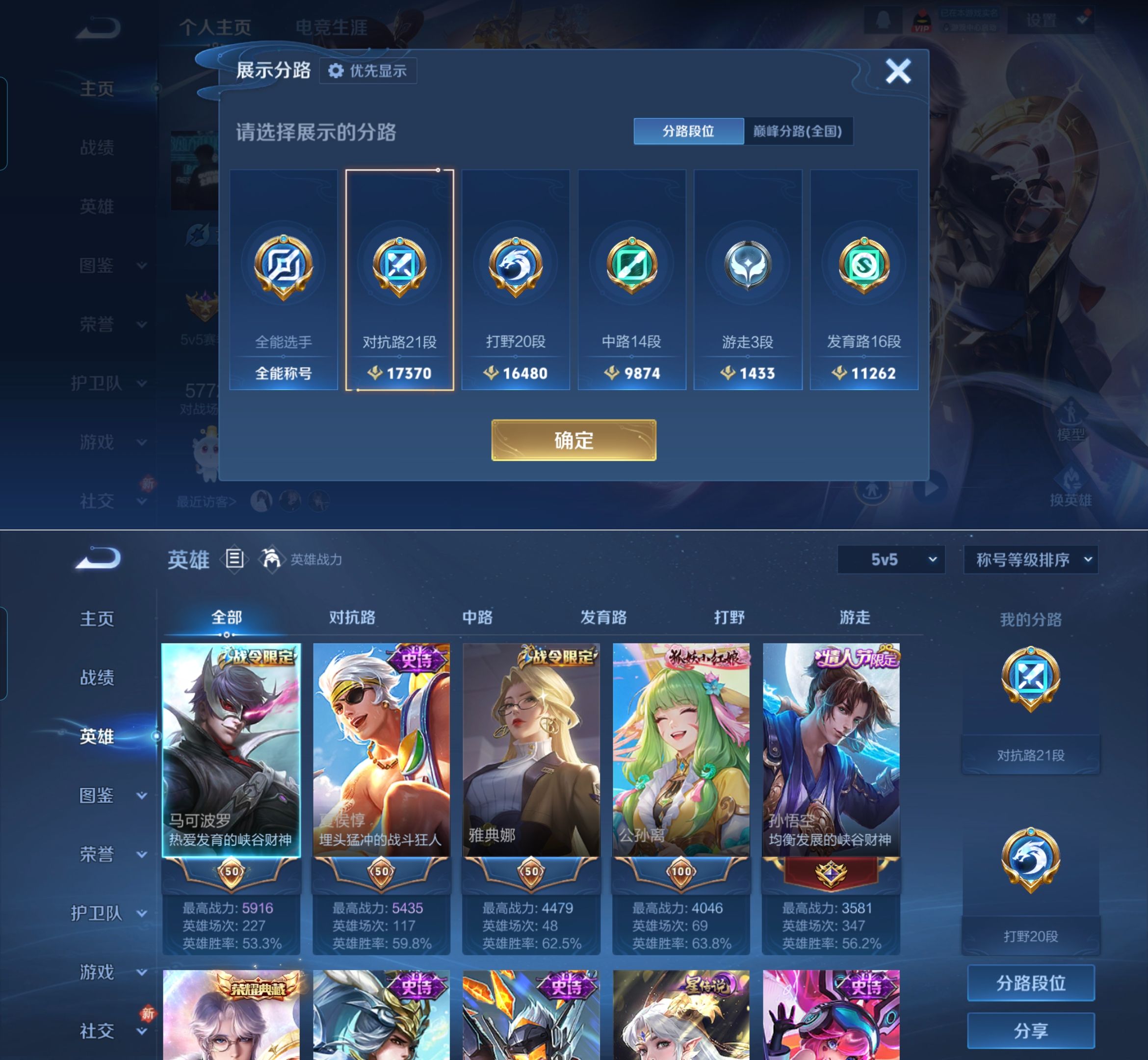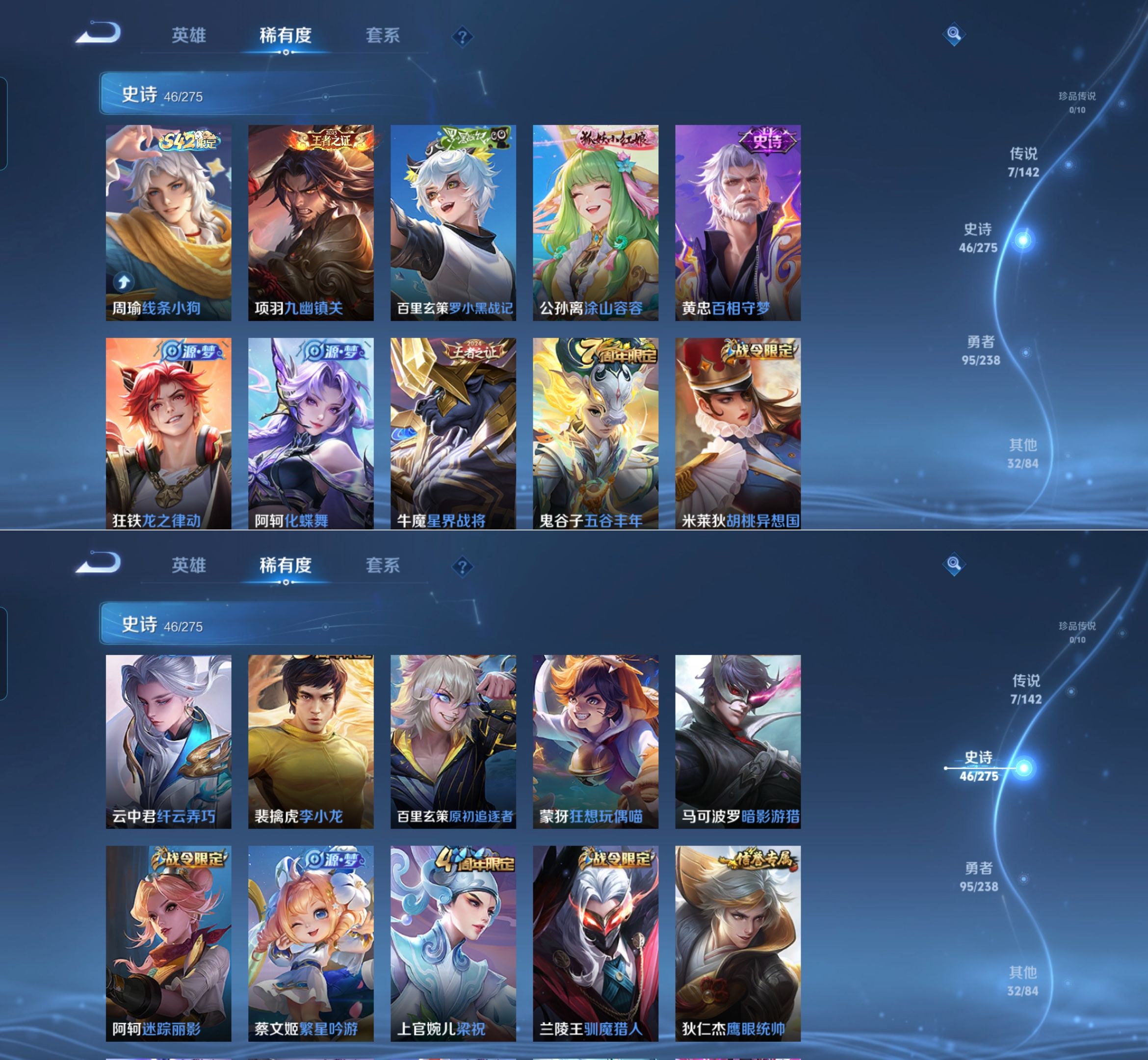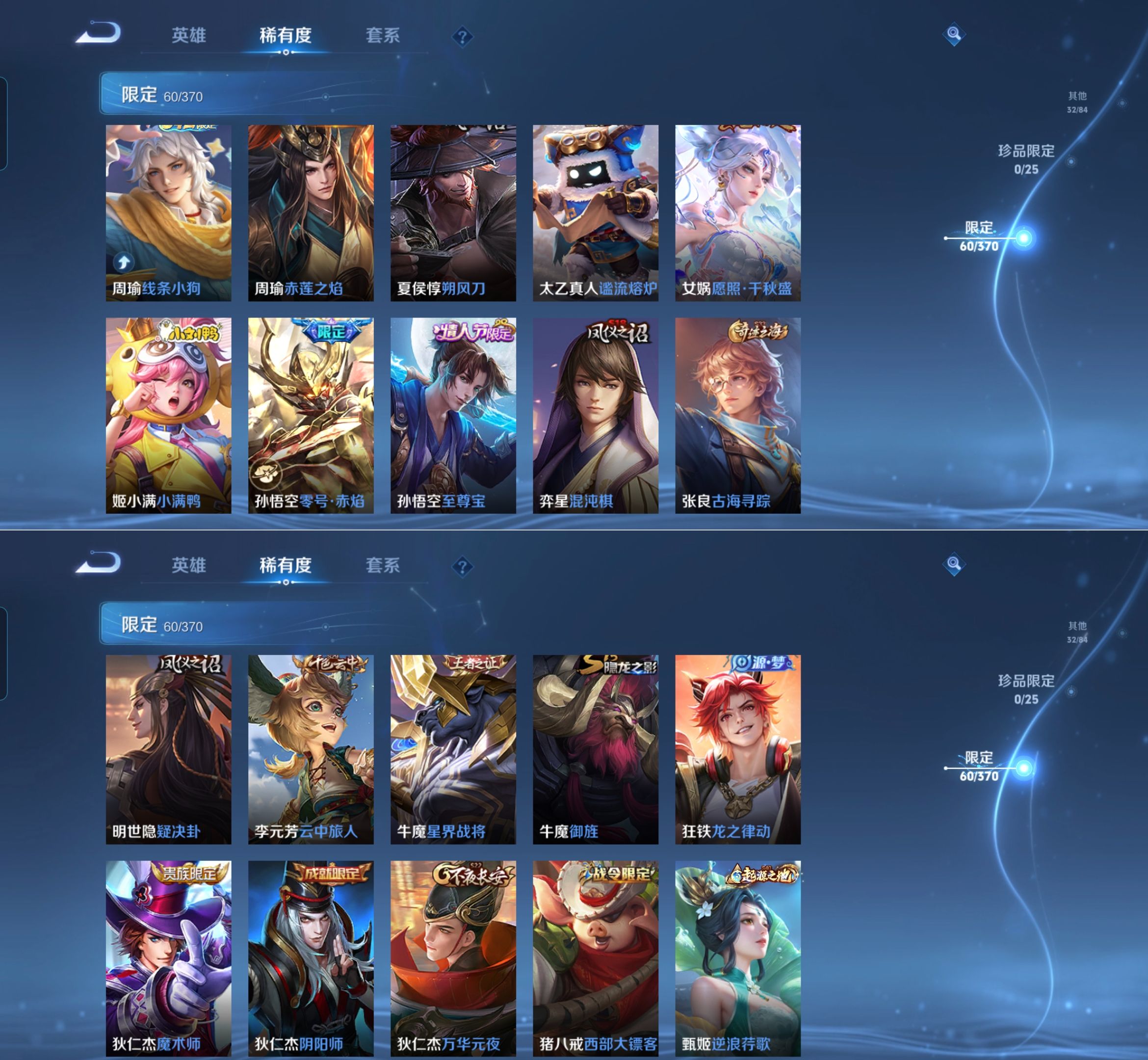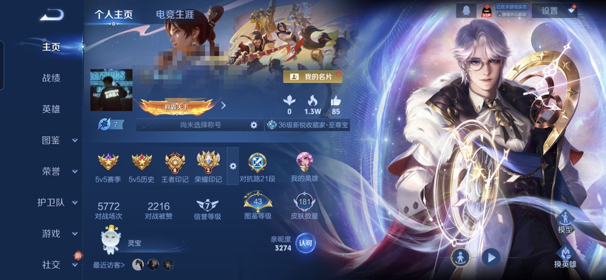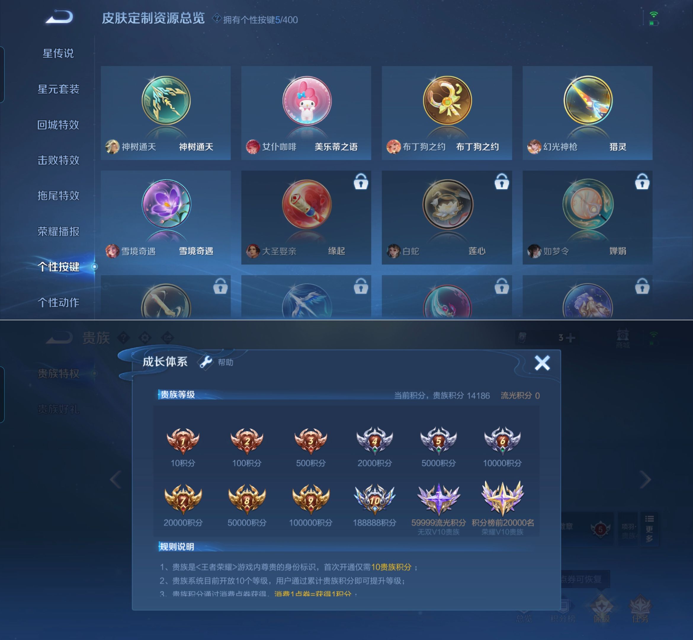 贵族等级:v6皮肤数:181传说品质7 荣耀典藏1 情人节限定1 生肖限定1 英雄数:127