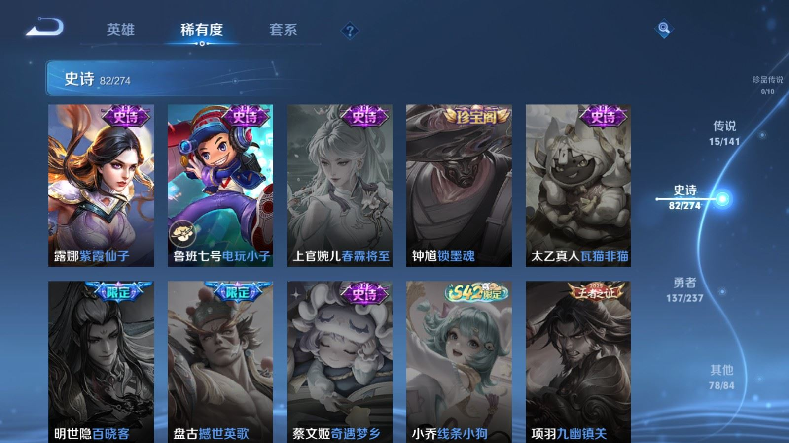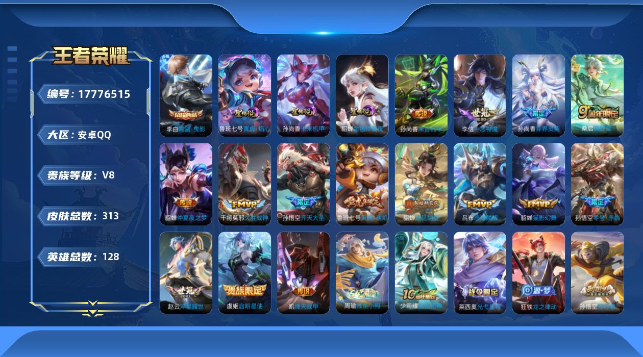 贵族等级:v8皮肤数:313传说品质15 生肖限定3 情人节限定1 荣耀典藏1 英雄数:128