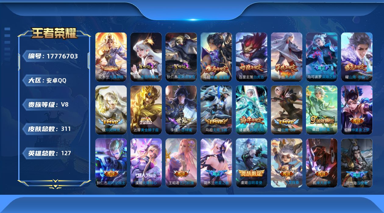 贵族等级:v8皮肤数:311生肖限定11 情人节限定4 传说品质20 荣耀典藏1 英雄数:127