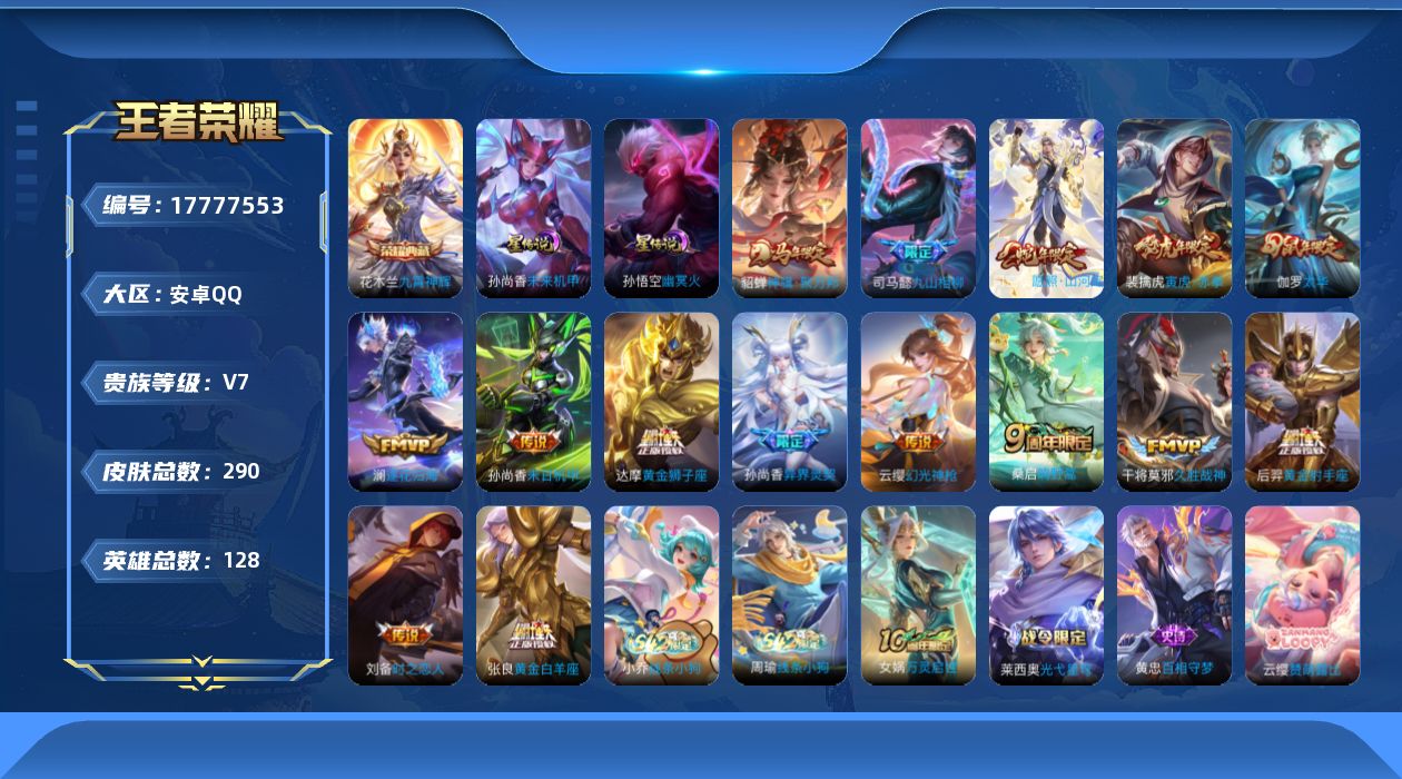 贵族等级:v7皮肤数:290生肖限定7 传说品质15 情人节限定2 荣耀典藏1 英雄数:128