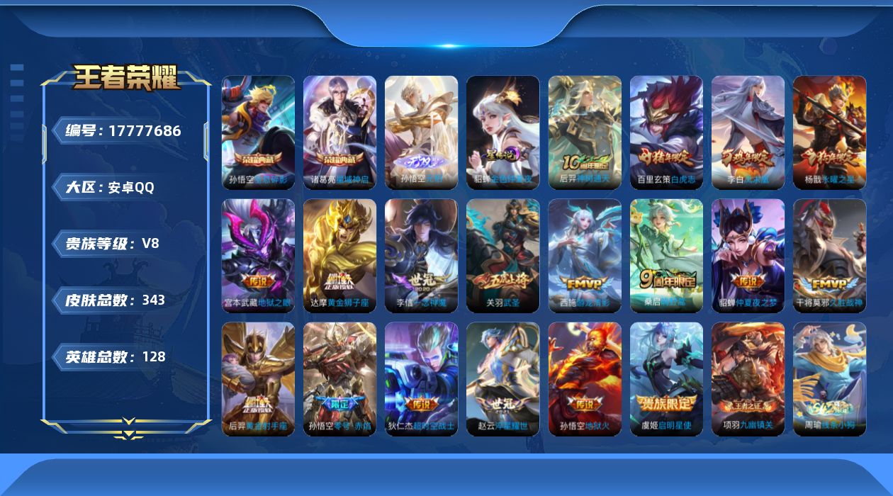 贵族等级:v8皮肤数:343传说品质18 荣耀典藏2 情人节限定3 无双1 生肖限定7 英雄数:128