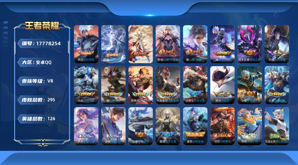 贵族等级:v8皮肤数:295传说品质19 生肖限定8 珍品传说1 荣耀典藏1 英雄数:126