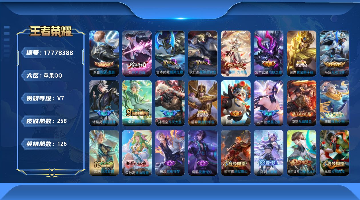 贵族等级:v7皮肤数:258传说品质10 生肖限定2 珍品传说1 荣耀典藏1 英雄数:126
