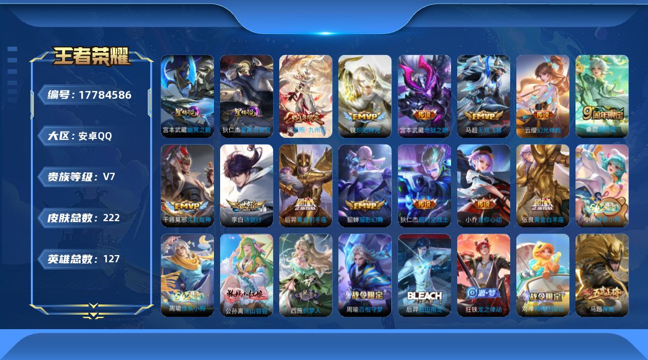 贵族等级:v7皮肤数:222传说品质13 生肖限定1 英雄数:127