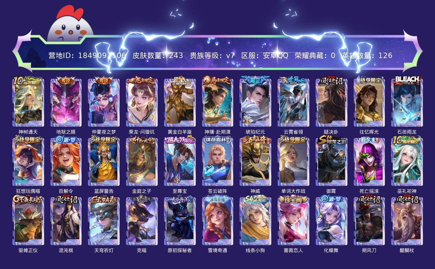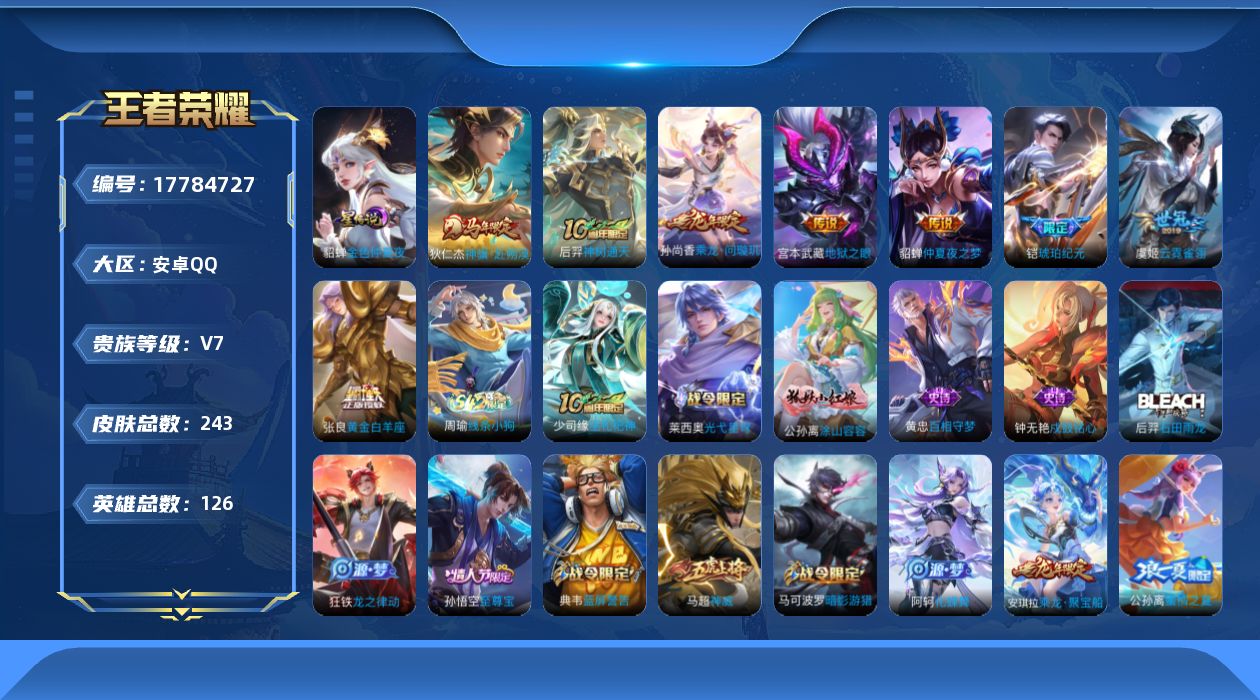 贵族等级:v7皮肤数:243传说品质8 情人节限定1 生肖限定3 英雄数:126