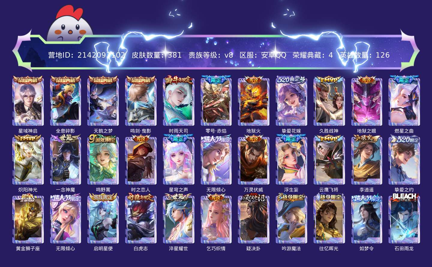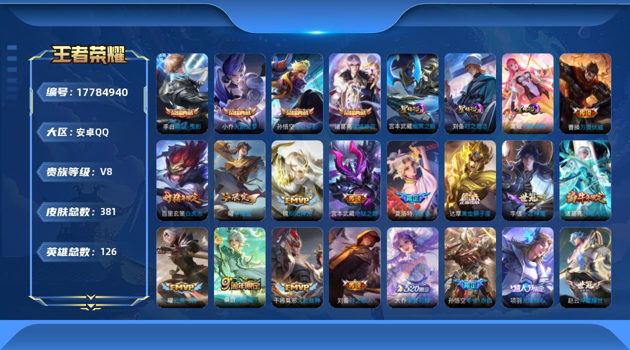 贵族等级:v8皮肤数:381情人节限定5 传说品质24 生肖限定6 荣耀典藏4 英雄数:126